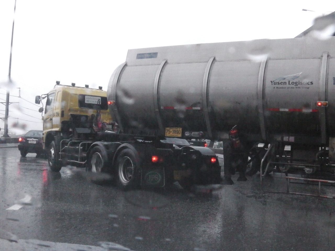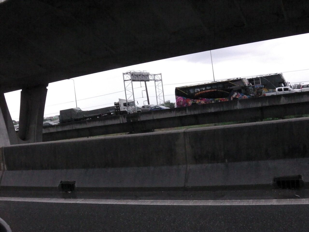 メガバンナのところでUターンするのですが、雨が降るとUターンの高架の始まるところに水たまりが出来て渋滞しますが、今日は比較的水の量が少なくそれが原因では無く、Uターンを降りたところの合流地点で、雨の中ご苦労な事ですが警官が手信号で流れを止めていました。「居ない方がスムーズ!」といつも思います…笑
