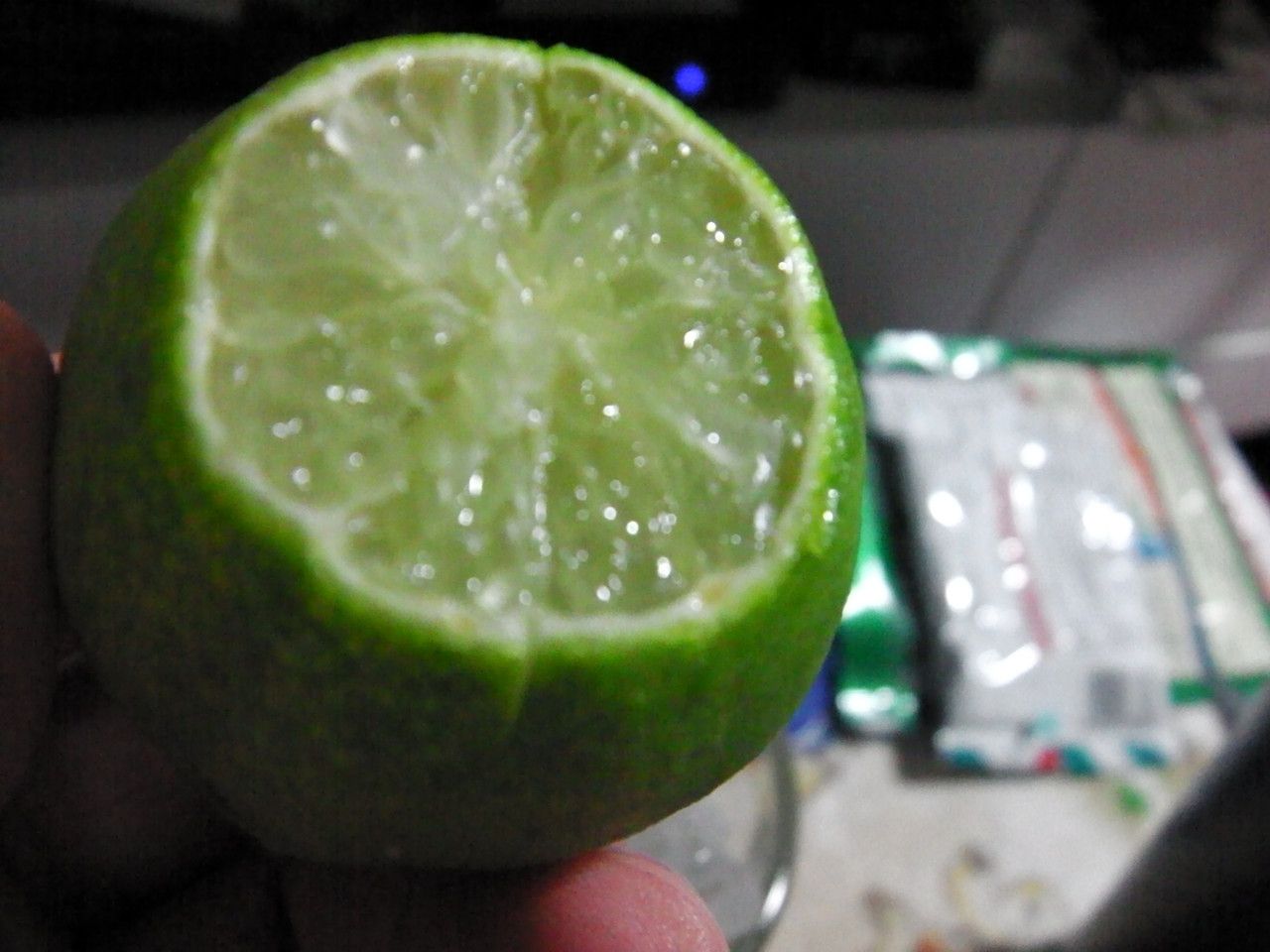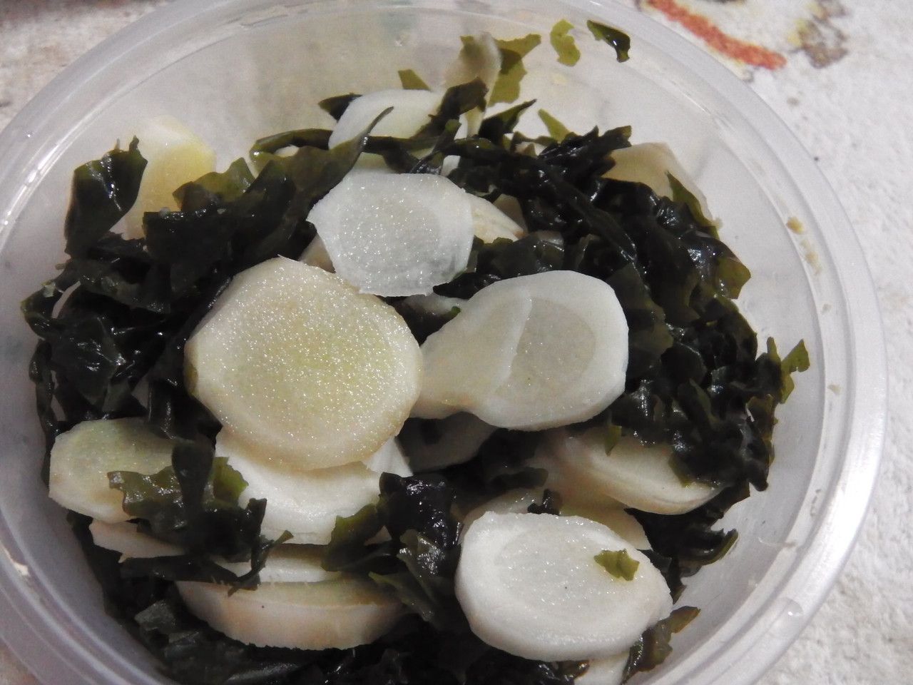 なので、翌日。。。乾燥わかめを水で戻したものに、スライスしたのを混ぜて、白だし醬油を少し掛けて。。。ライムジャンボを、搾りに搾って掛けた。すると、何故か辛さは弱まって食べやすくなった。