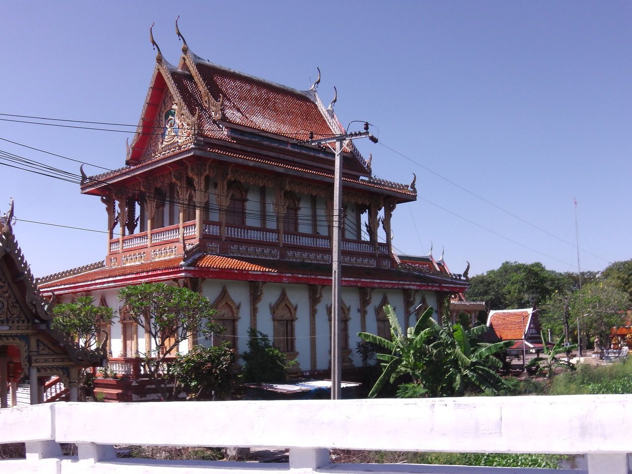 もう、バンコクの中心部では見かけない姿かも。そして、住宅がある地域の手前には、お寺。そして、広場には牛の姿。