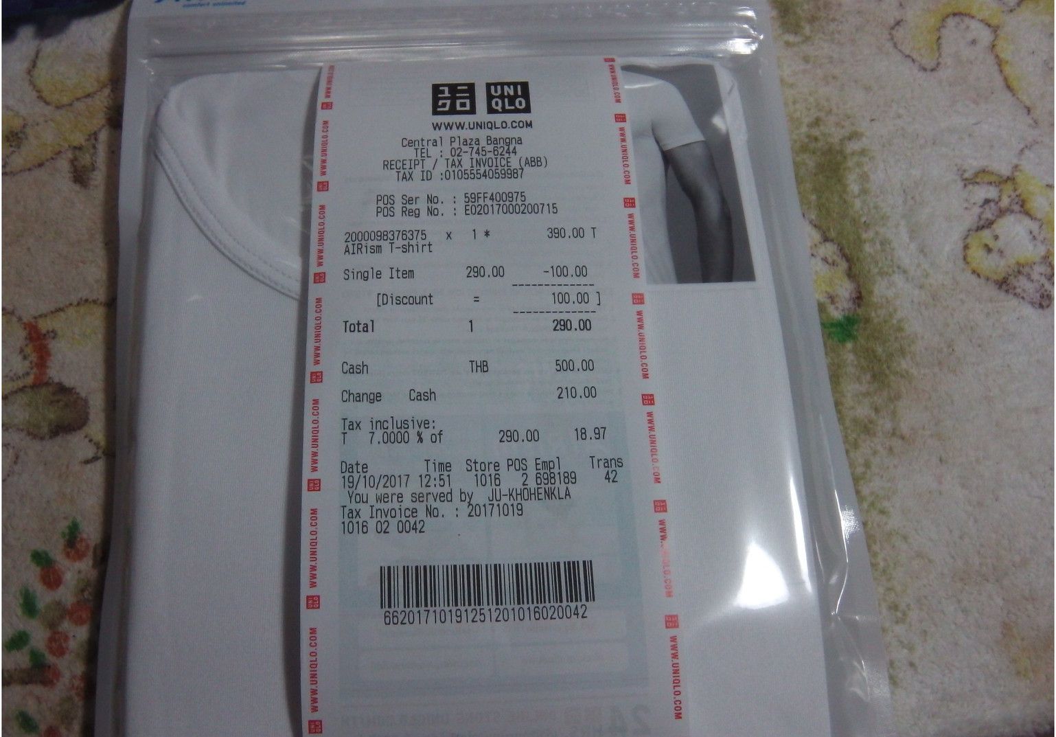 色が同じでも、生地が若干違うのもあって、何が良いのか暫く悩む。判らないので、普通に近い生地を選択。この日は、特価100バーツの値引きで、290バーツ。これを着て今日、事務所へ来た。