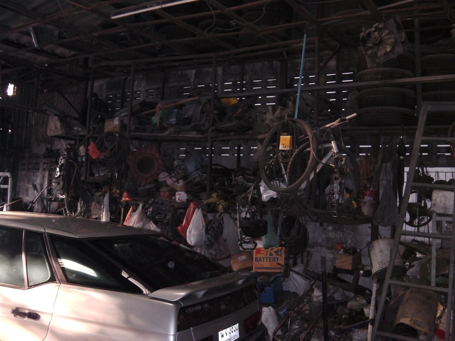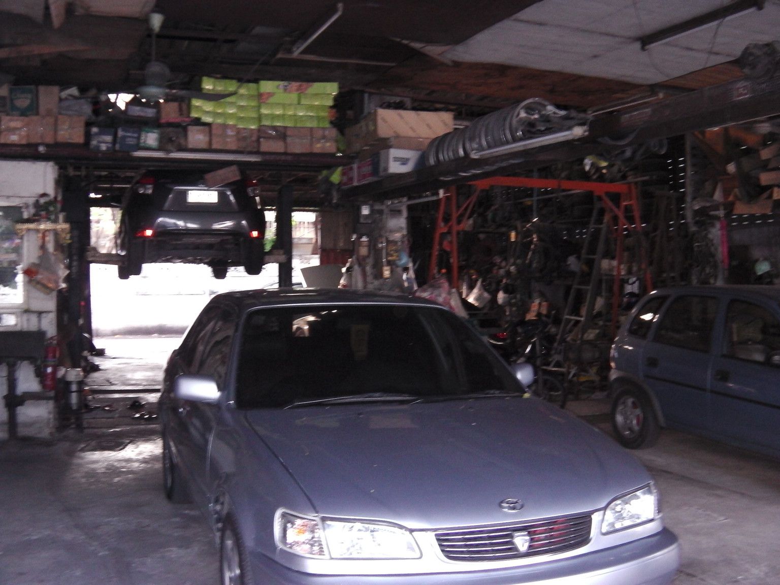到着すると、そこは個人経営の小さな整備工場。壁には部品がぶら下がる。
