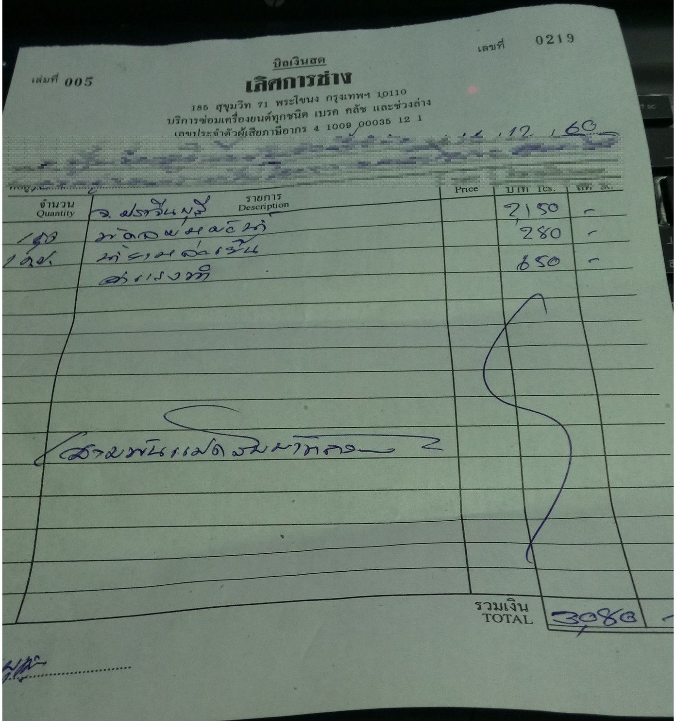 そして、15時過ぎに電話が鳴った。到着すると、伝票を渡してくれた。料金は、3080バーツ。