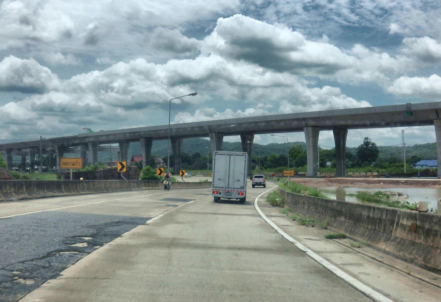 すると。。。前方に橋が見えて来た。渋滞は全く無いが、工事中。