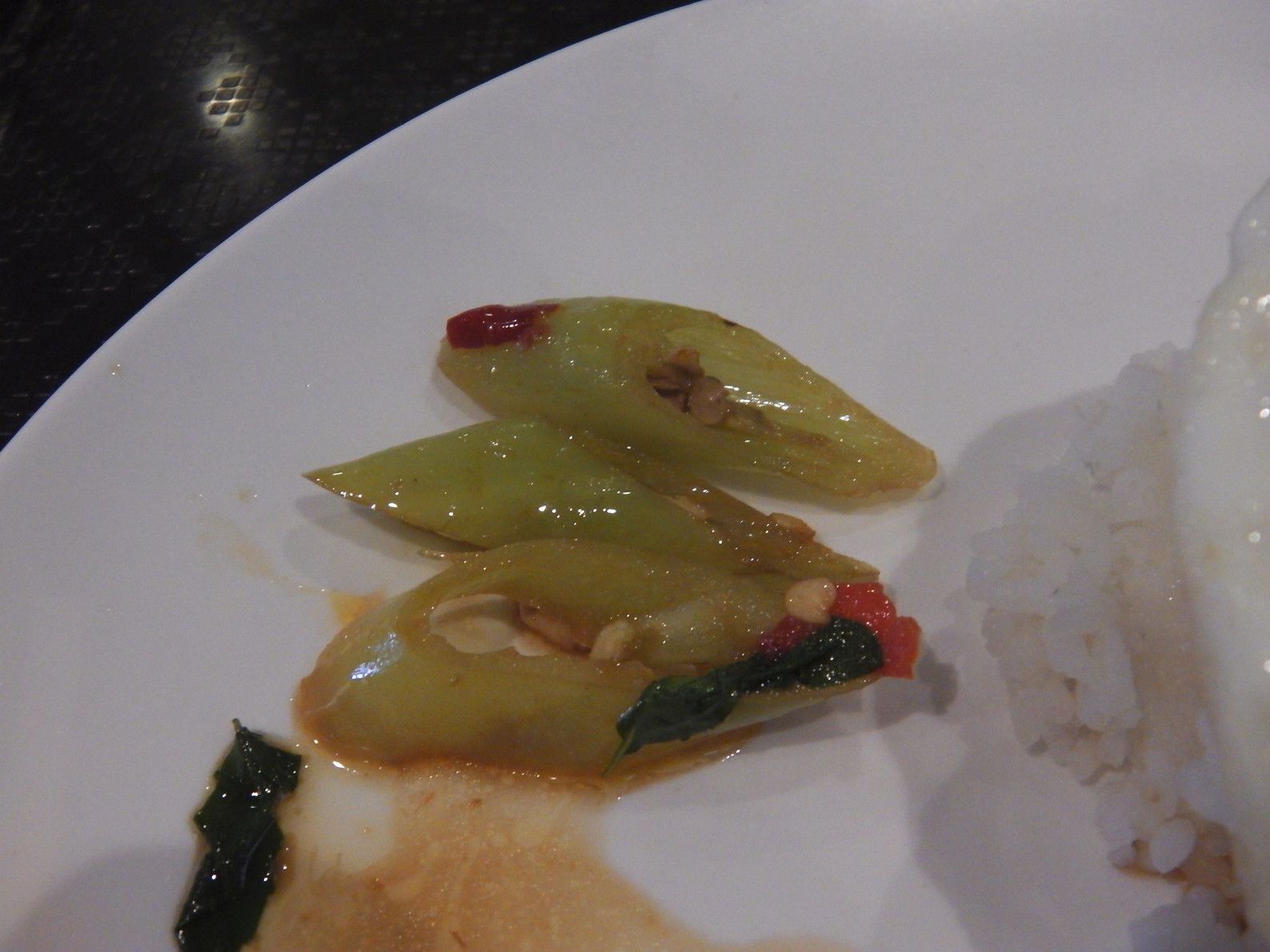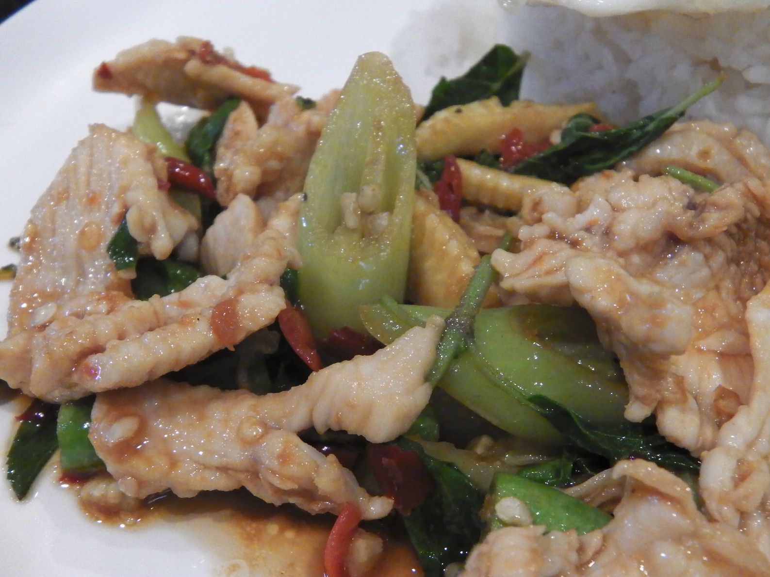 タイの炒めもの料理。「パッ・なんとかかんとか・キーマオ」というとこの緑色のトウガラシがどばーっと入ってます。