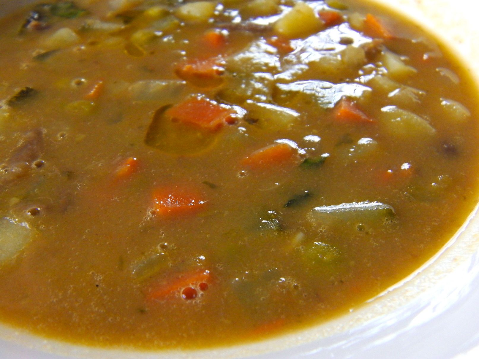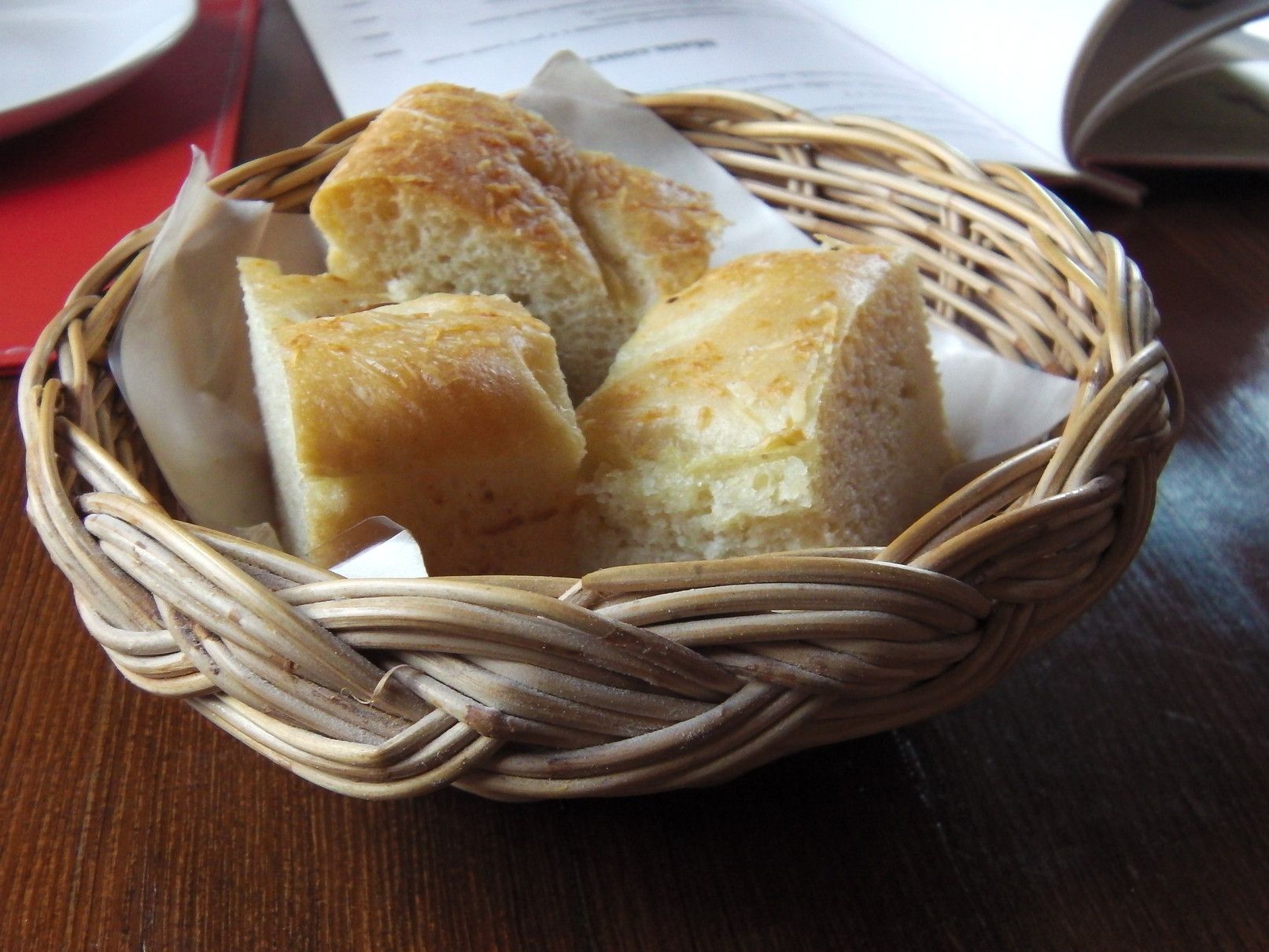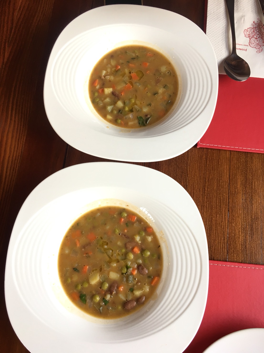 注文をすると、直ぐにテーブルに出されたのは。。。ほかほかで、柔らかいパンと、塩、胡椒、オリーブオイル。暫くして、お互い同じオーダーをした、ミネストローネ。多くの種類の野菜入り。非常に煮込まれた、美味しいスープ。