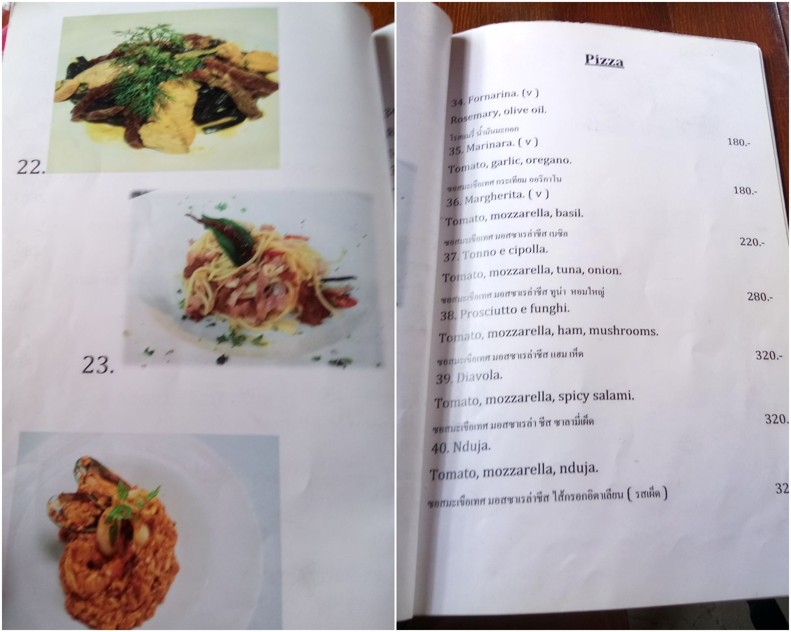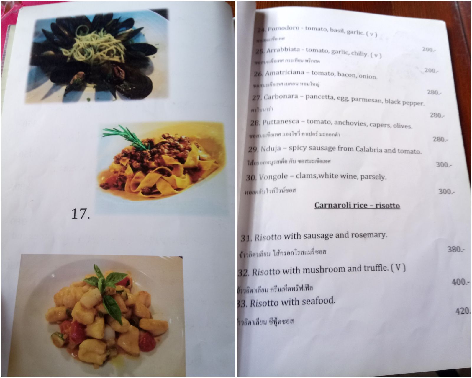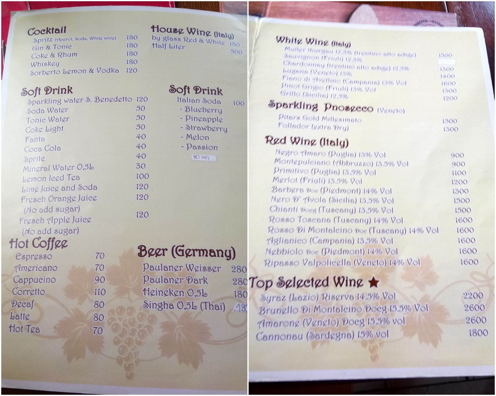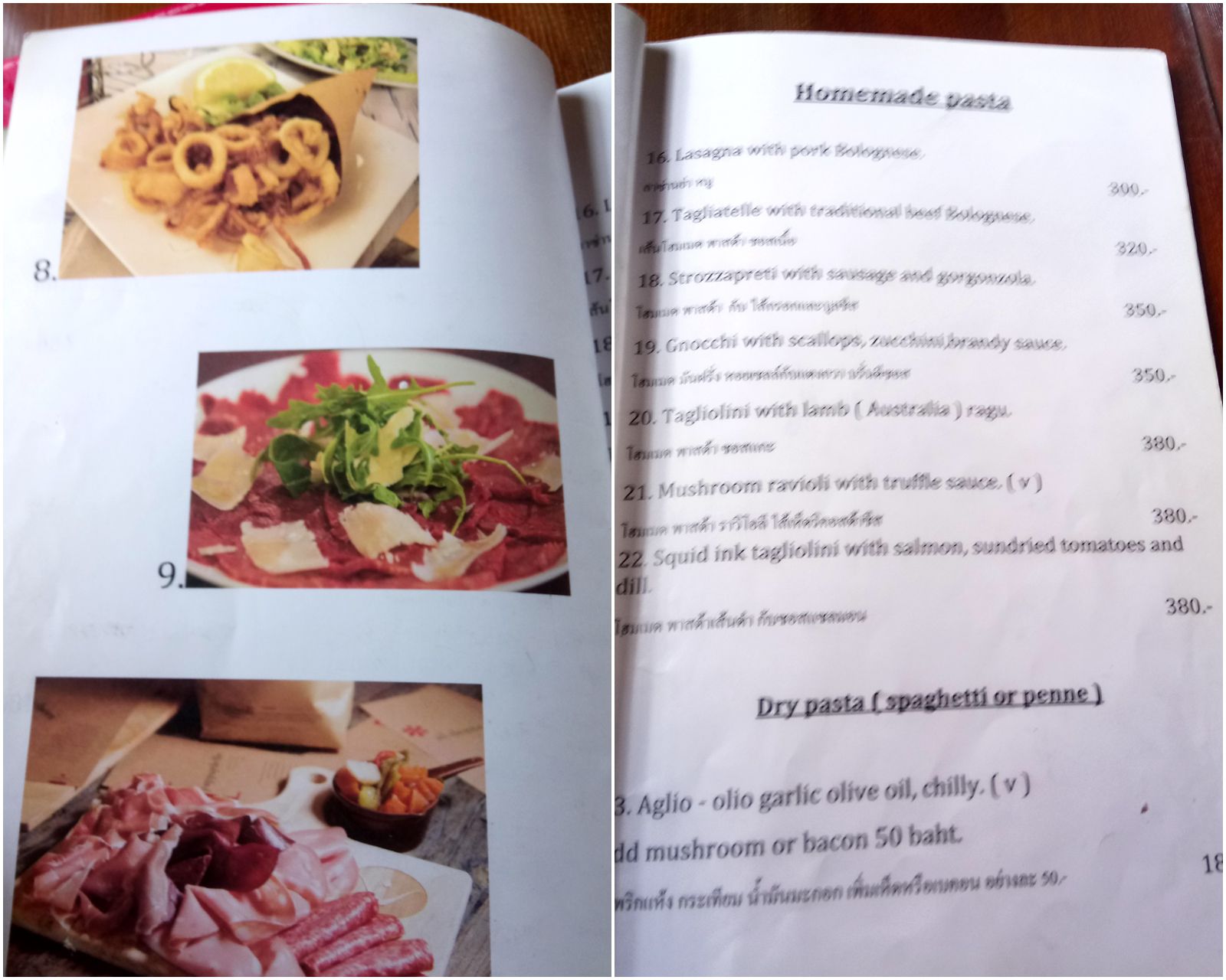 我々が、入店した際には、他に客は居なかったが、結果的にはイタリア人らしき家族と、友人同士のイタリア人たちが入ってきて、シェフと交えてイタリア語だらけの会話を聞きながらの食事となった。何か、都会にはない店作り。早速メニューを見てみる事に。
