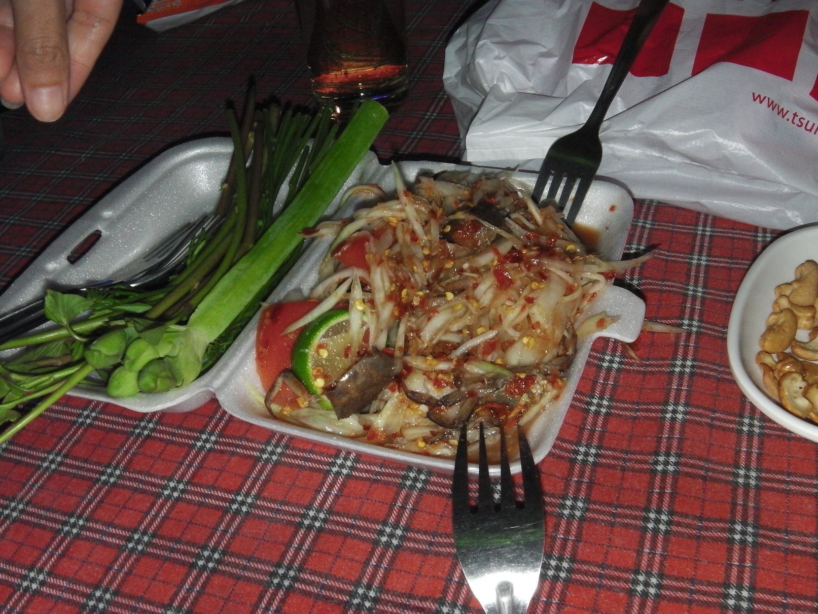 20バーツ紙幣を2枚渡して、買って来てもらう事に。あまり辛くはないよ。そう言うので、食べてみた。いやいや。激辛。