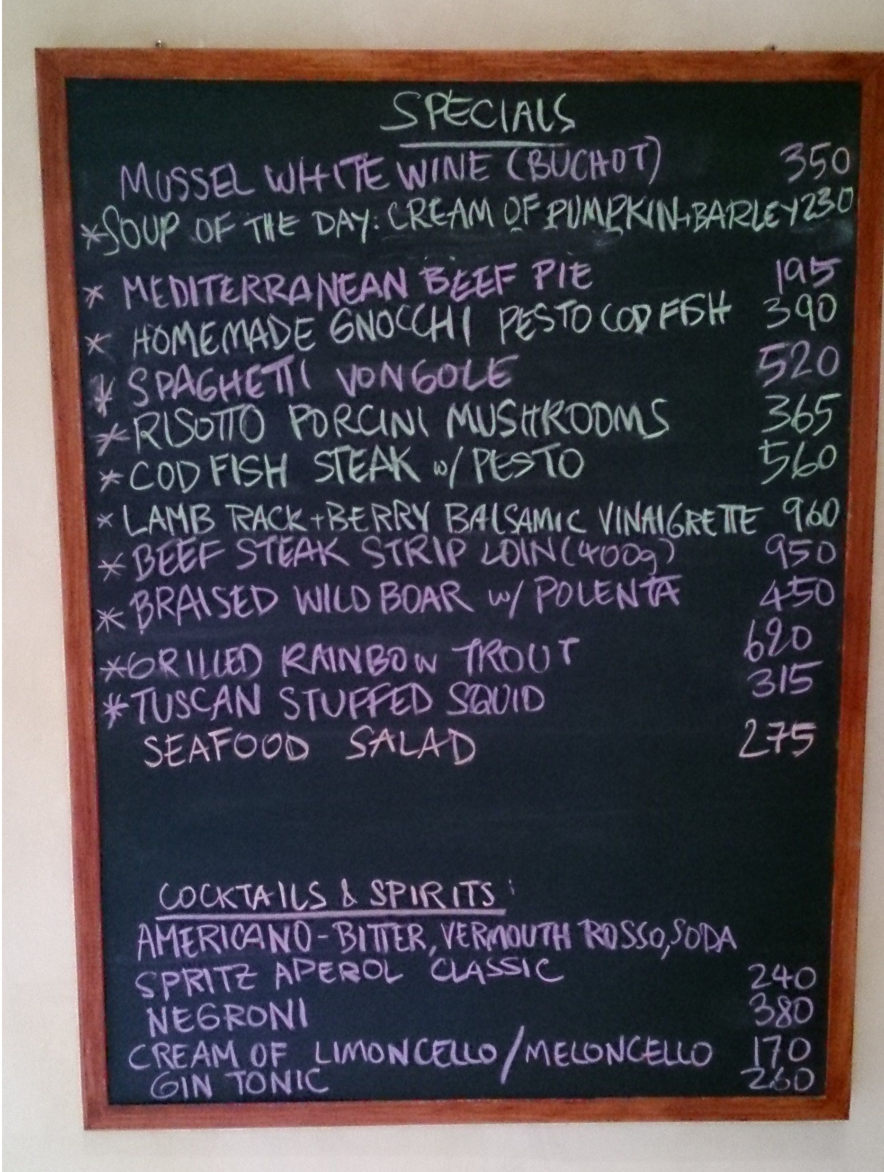 全て、シェアーして食べてみたが、本当に美味しいです。働いているのは、イタリア人シェフと、タイ人の奥さんなのだろうか?2人だけ。静かに音楽が流れる中での食事。烏賊の中には引き肉が詰められていて、トマトソースと一緒に食べると、ご飯が欲しくなるほど。