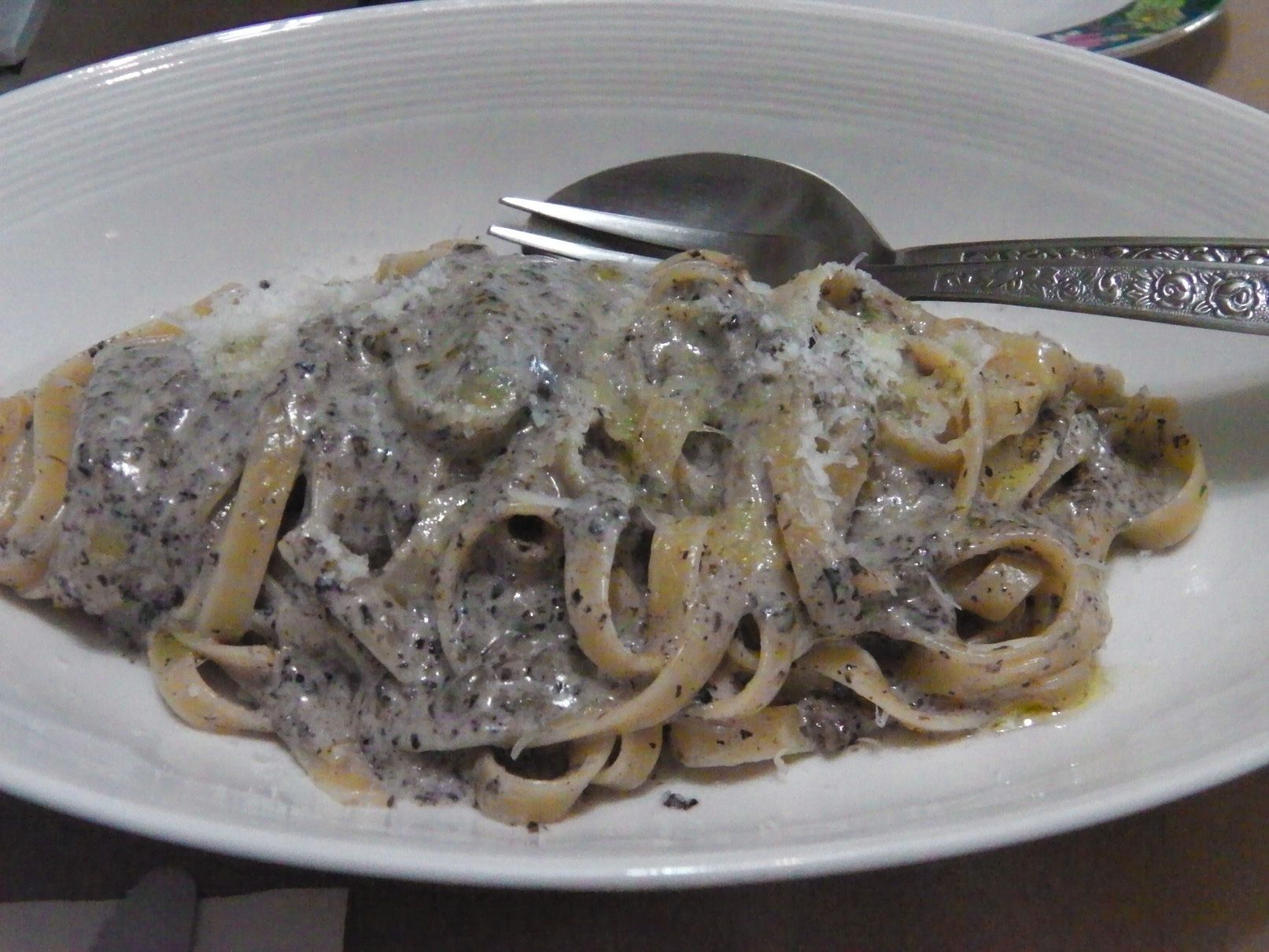 少し待つと、料理が運ばれてきた。相方がオーダーしたパスタ。これは、自身がオーダーしたトリュフが入ったソースのパスタ。烏賊の料理。