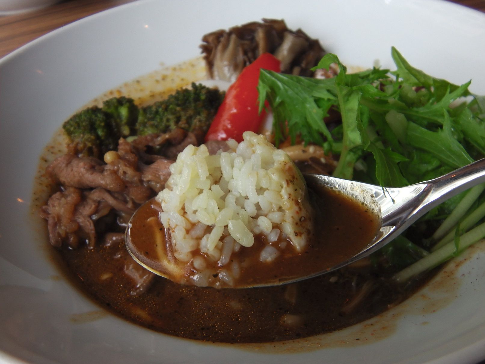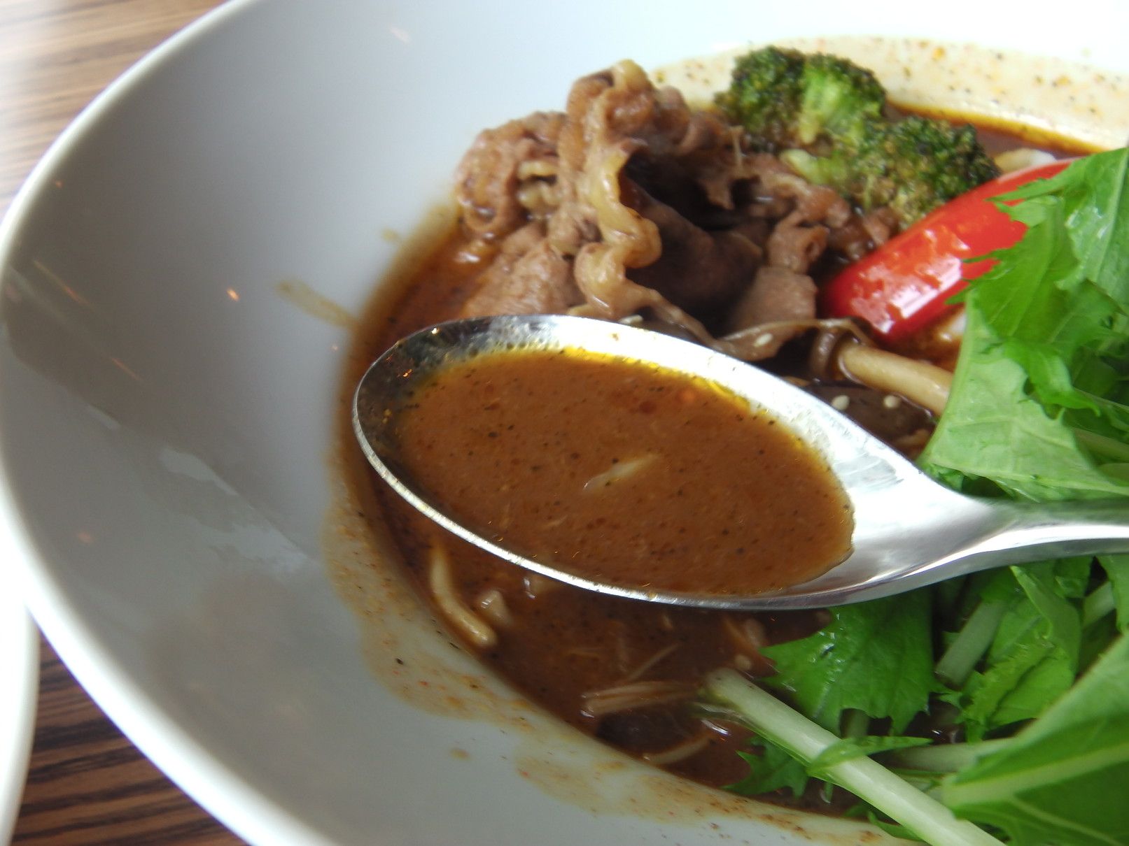 辛さ普通をオーダーしたのだけれど、殆ど辛さは感じず。スープにライスを浸して食べるのが好み。ちなみに、これが辛さ程度が10。