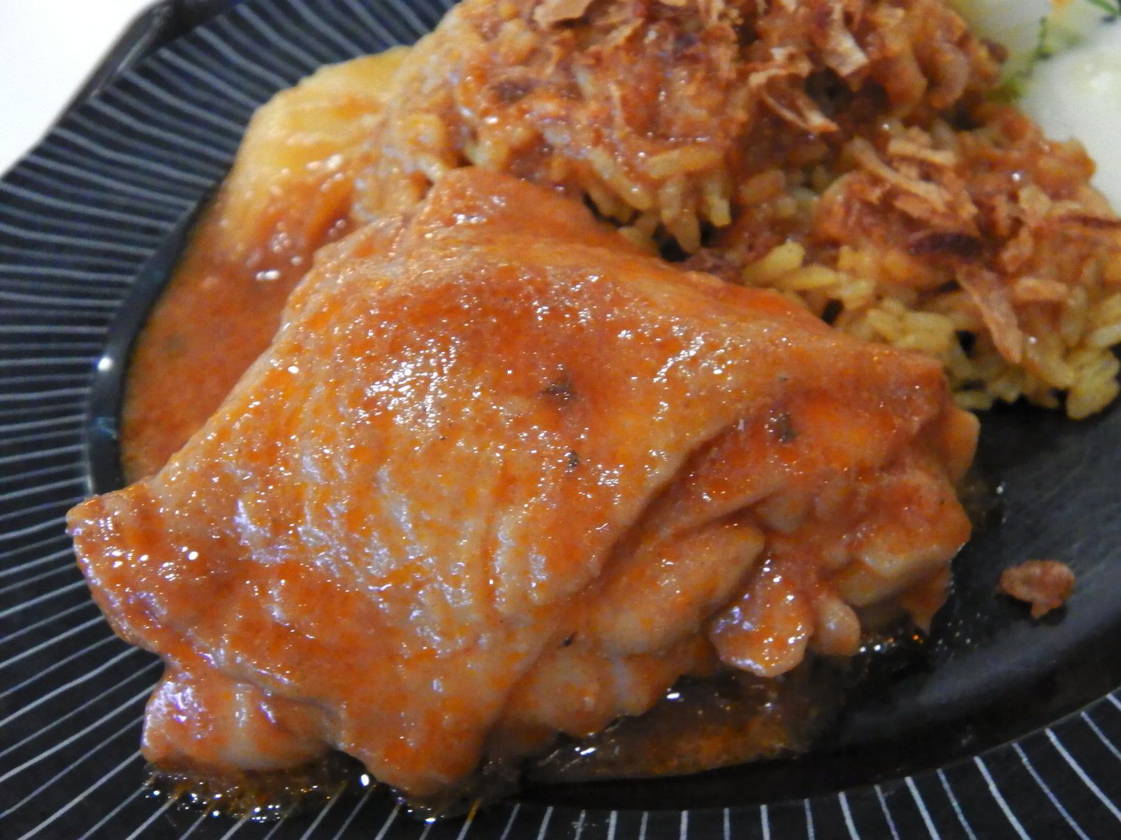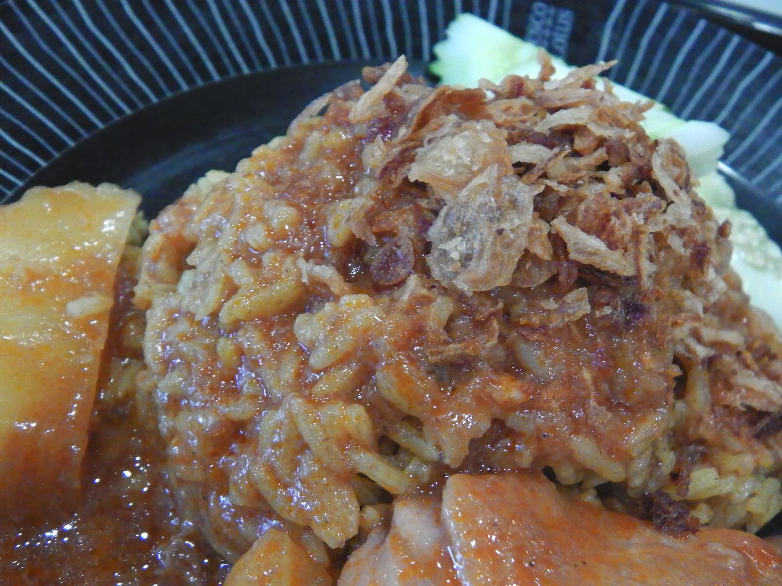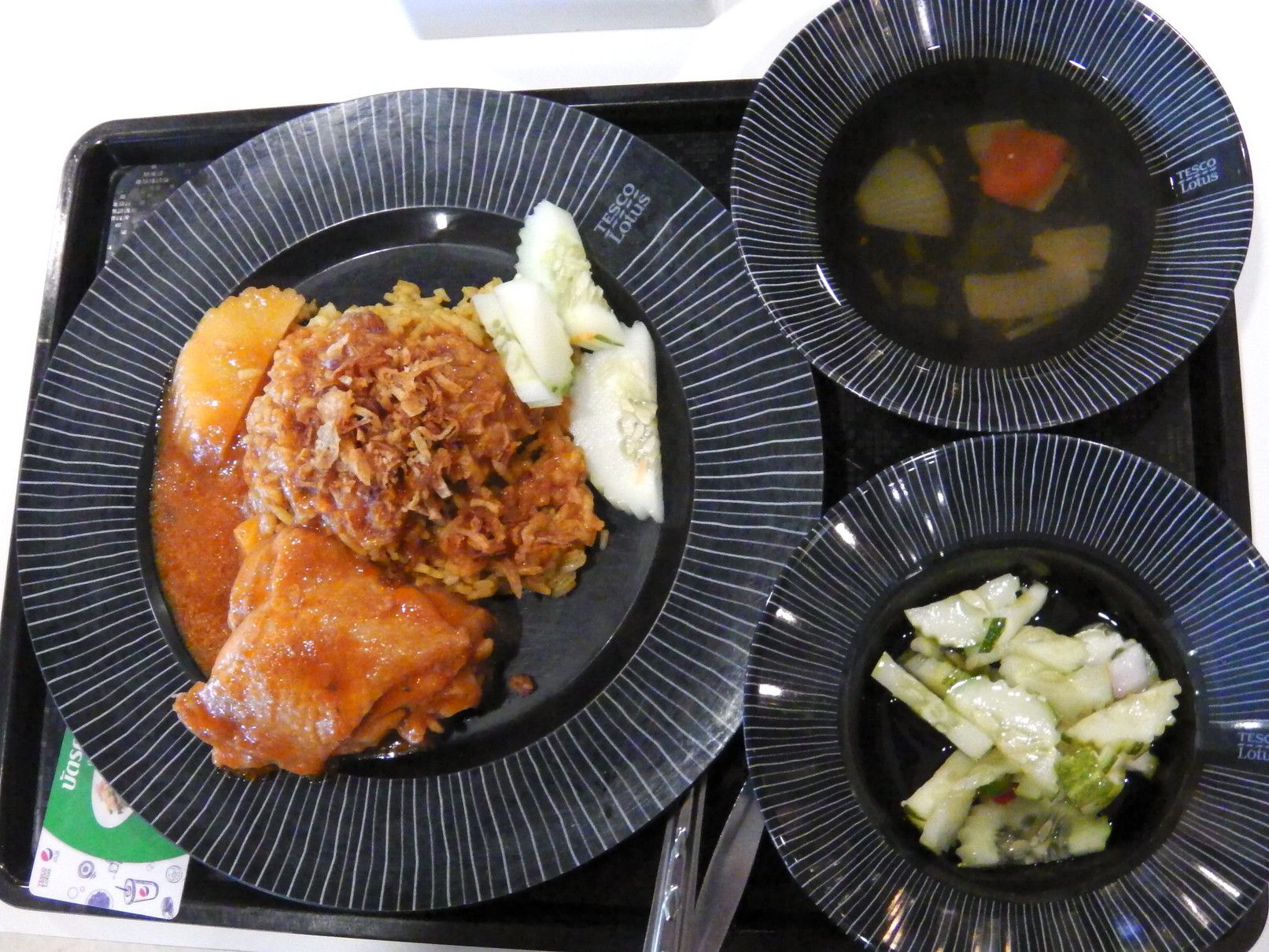 お客さんは、旧アマタナコン、現在はアマタシティーチョンブリ工業団地内に在る。アポは13時半。まずは、工業団地入口手前のショッピングモールで食事。時間は、11時50分。敷地は広いのだけれど、この時点で駐車場は、ほぼ満車状態。12時を過ぎると、工場勤務の方々が押し寄せてきて大変な事になる。しかも、お客さんの工場は、入り口を入ってからも、更に30分は時間を要する場所。それだけ、広大な工業団地だ。もう、混まない内に食事をして、時間に余裕をもって行く事が大事。色々と見て歩くが、今日はカレーにした。一番奥の、色が濃いカレー。55バーツ。もう大好物のチキンカレー。煮込まれた鶏肉と、カレー味のご飯の上には、揚げにんにく。キュウリの酢の物とあっさりスープ。