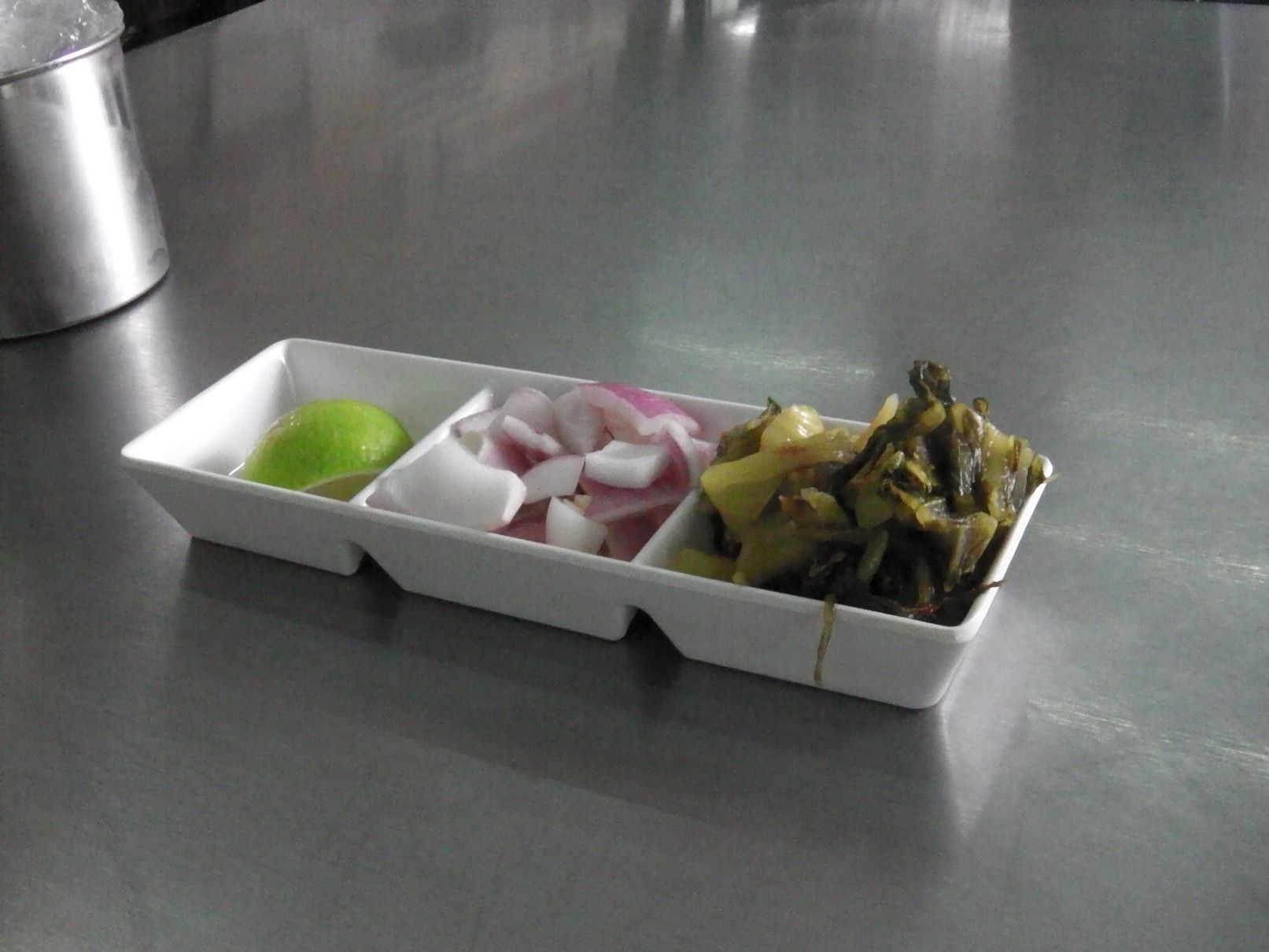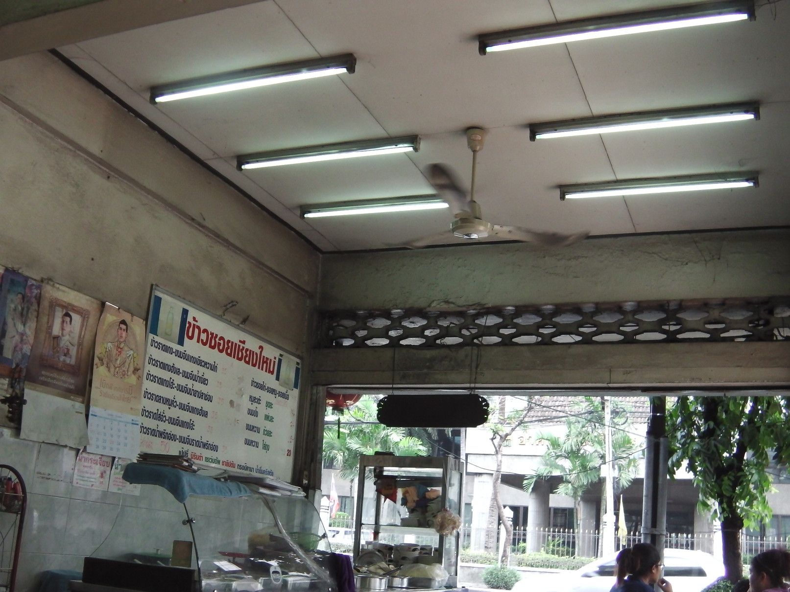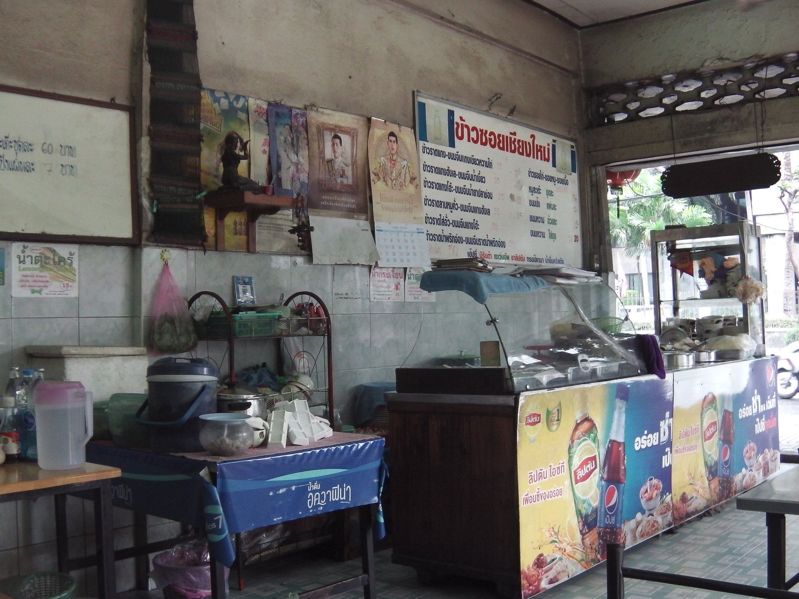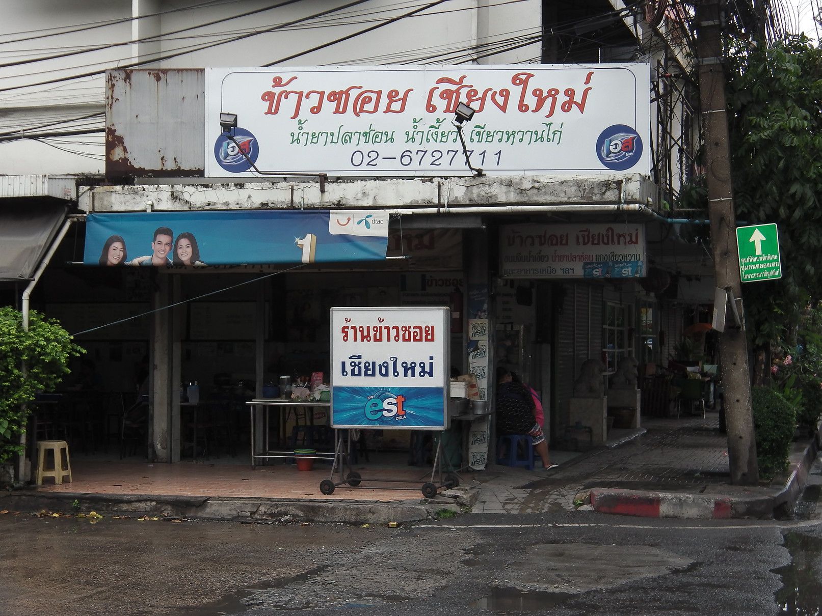 場所も、生活範囲の中に在り、馴染みが薄かったカオソーイが、実は近くでも美味しい店が在ったんだと感激してから今まで、色々な店と出会ってきたが、一番気になっていたのが、今から紹介する店だ。この日は、散々歩き回る行動をし、最後にMRTの駅から此処まで歩いて来た。もう、14時も過ぎていた。しかも、この日の為に、朝食抜き。この雰囲気は、もう何度もネットで確認済みで、やっと来れたと感じた。オバちゃんが注文を取りに来て、カオソーイガイを注文すると、大盛にするかどうか確認を求めてきたので、一瞬迷うが、この際にいっぱい食べようと大盛を注文。直ぐに持ってきたトッピングの漬物の野菜を食べてみると美味い!これが、カオソーイガイ。やや、あっさり系のスープの色。野菜をトッピングして、チリソースを少し。まずは、混ぜる前にスープを一口飲んでみた。やはり、あっさり系。しかし、残念なのは、完全にぬるい。そのぬるさも、人肌程度。麺は、薄い麺。これも、自身の好みとは違った。2本入っていた、鶏肉は柔らかく煮込まれていた。本場、チェンマイへ行き、カオソーイは食べた事は無いので、何とも言えないけれど、チョット、好みとは違うカオソーイでした。