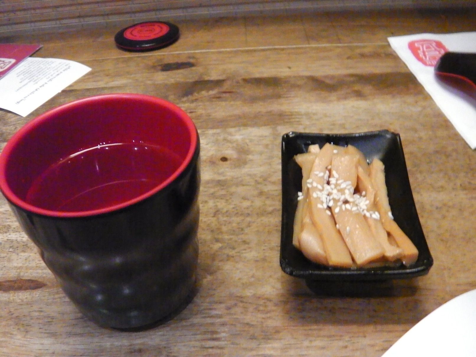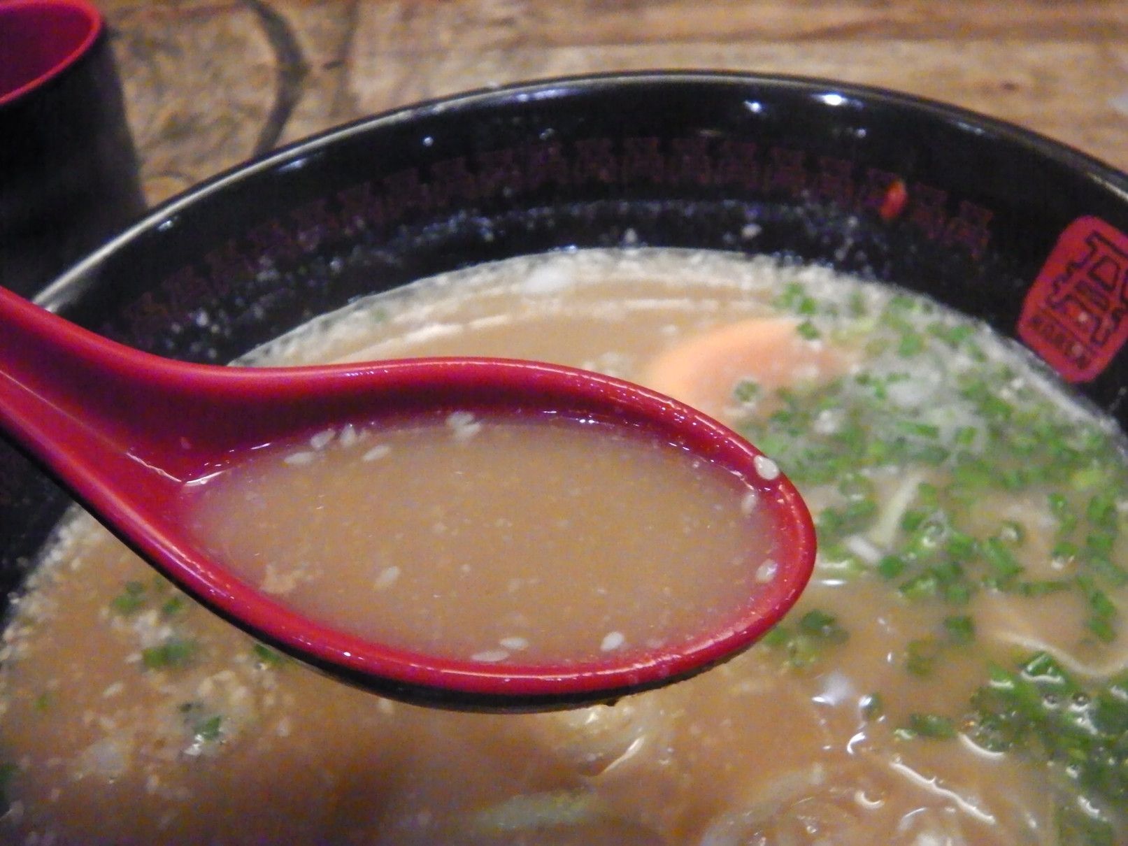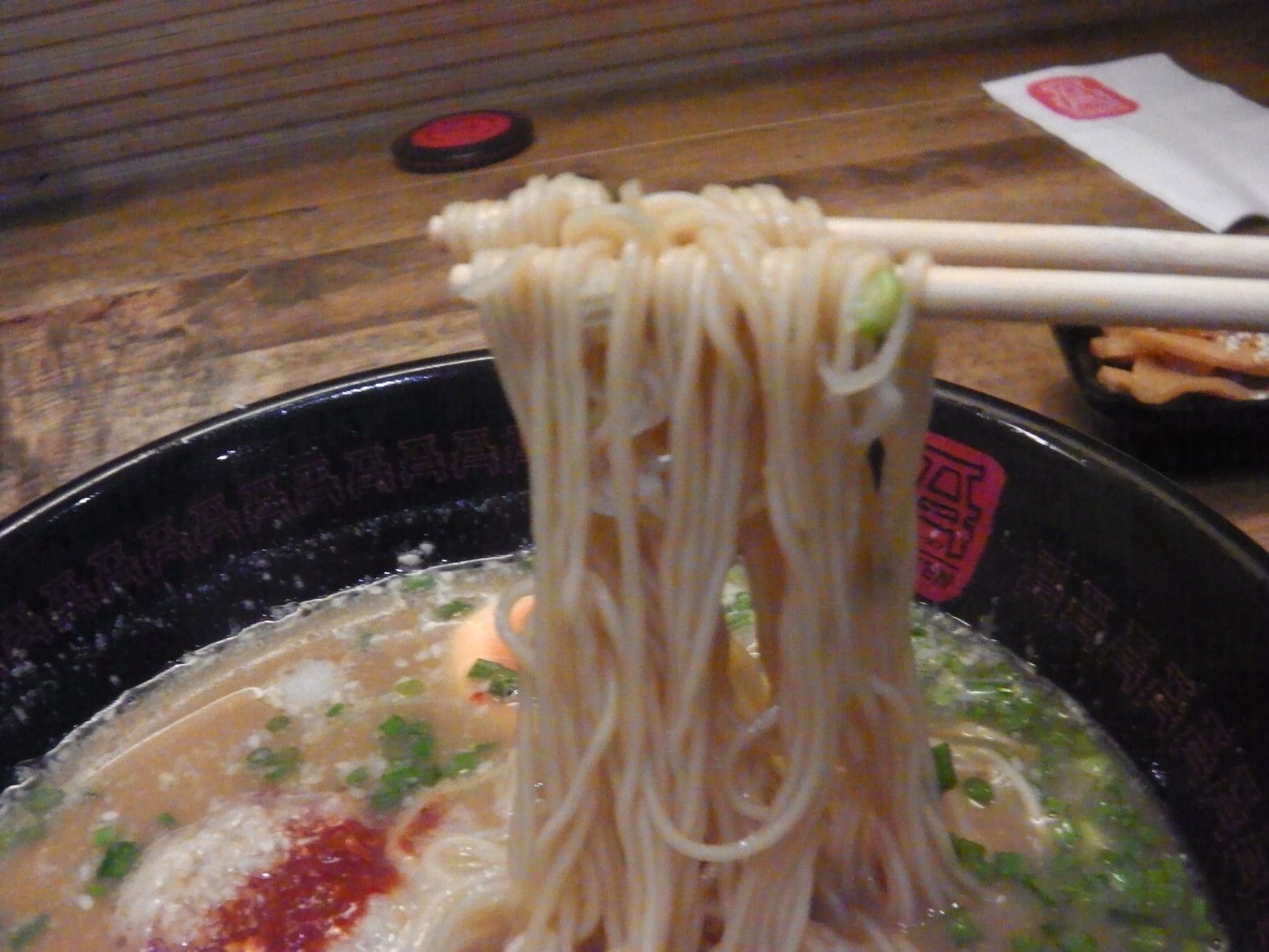 ラーメンガ食べたくなり、久々の訪問。一時期、日本の”一蘭”のパクリと騒がれたラーメン店。個人的には、”一蘭”を全く知らないので、比較する事は出来ないが、比較的安価で美味しい豚骨ラーメンだと感じている。店内は、このような仕切りのあるテーブル。事前に、入り口でフードコートのように、現金を支払いカードを受け取る。そして、記入用紙に麺の硬さ具合や、スープの濃さ、辛さ等々の好みを記入する。下の部分には追加の具などを注文したい場合にチェックできる。上にはコップが置かれ。。。