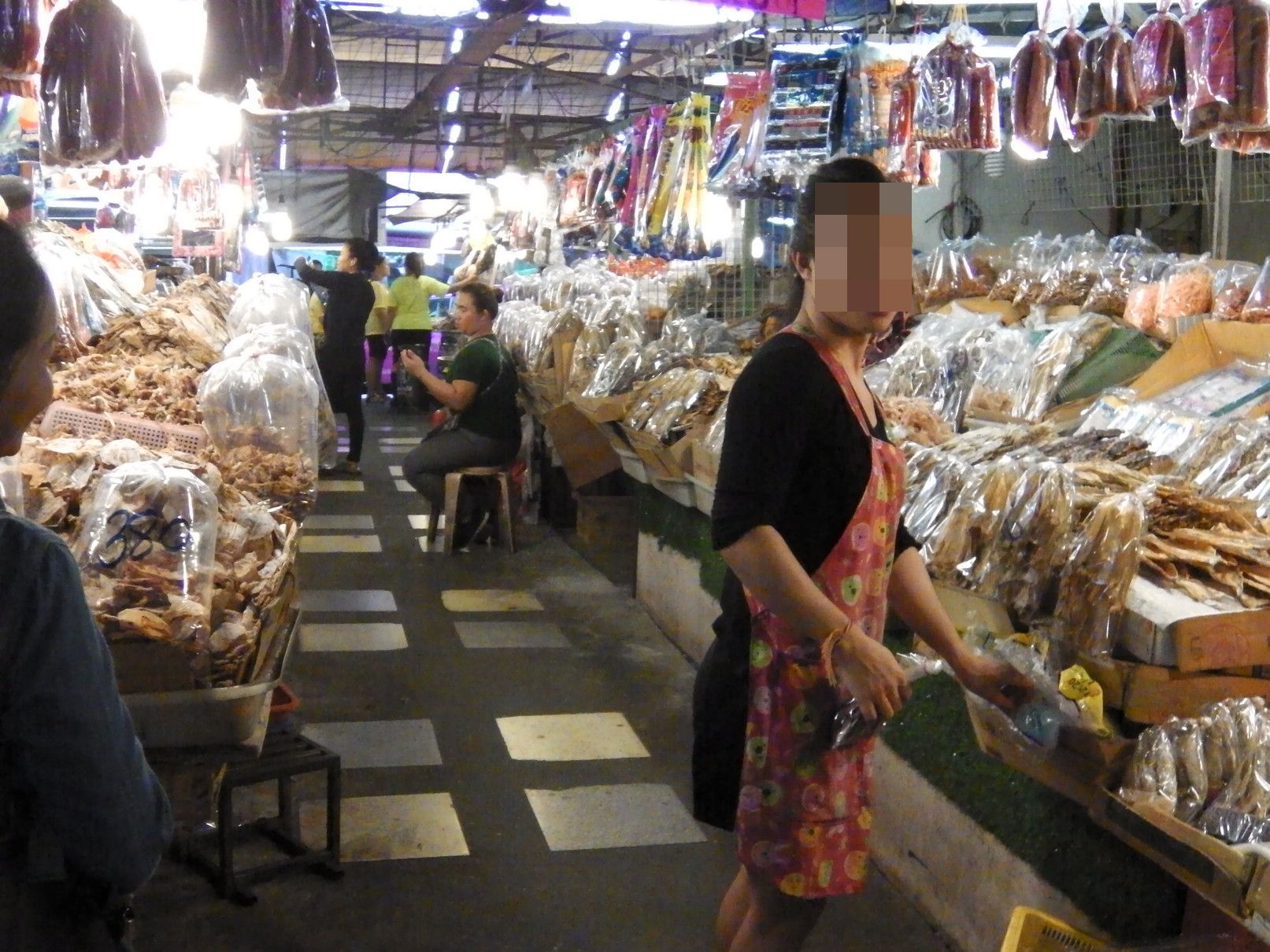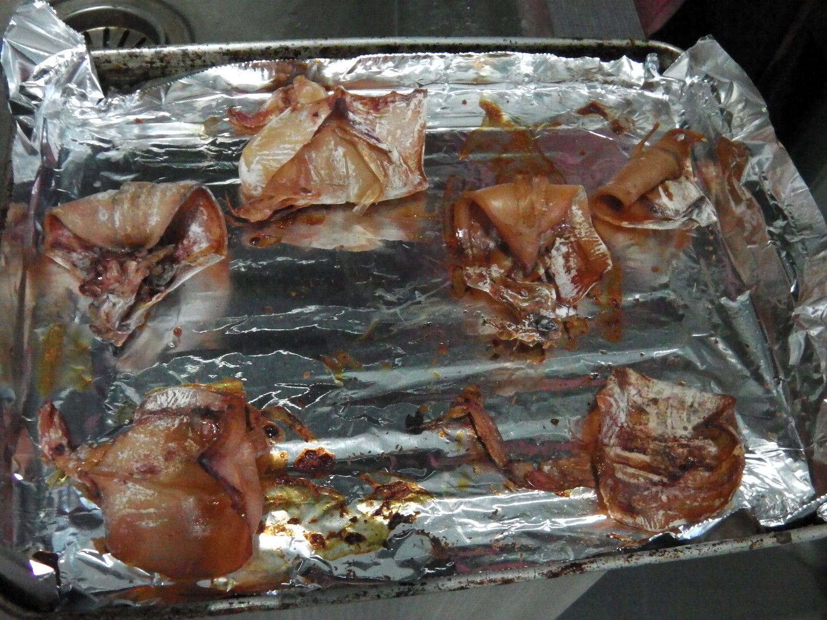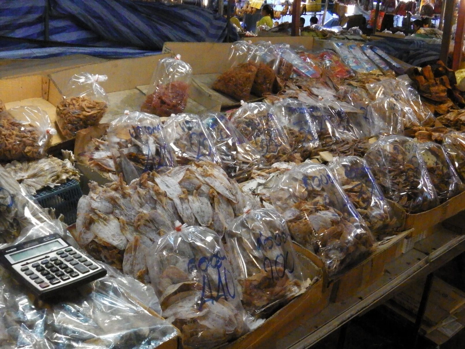 いやいや。折角なので市場に寄ることに。まずは、牛肉屋さん。オンヌットの屋台村で食べる、レバ刺しもサムローンの業者から仕入れていると聞くので、この界隈では多いのかもしれない。焼肉用を購入。そして、乾物屋さんが集まる場所へ。目的は、スルメ。いつもなら、大き目のスルメにするのだけれど、今回は小さめを選択してみた。それを、薄めた出汁醤油に数日漬けて。。。オーブンで焼いて食べる事にした。数分焼くと、小さく丸まってしまった。