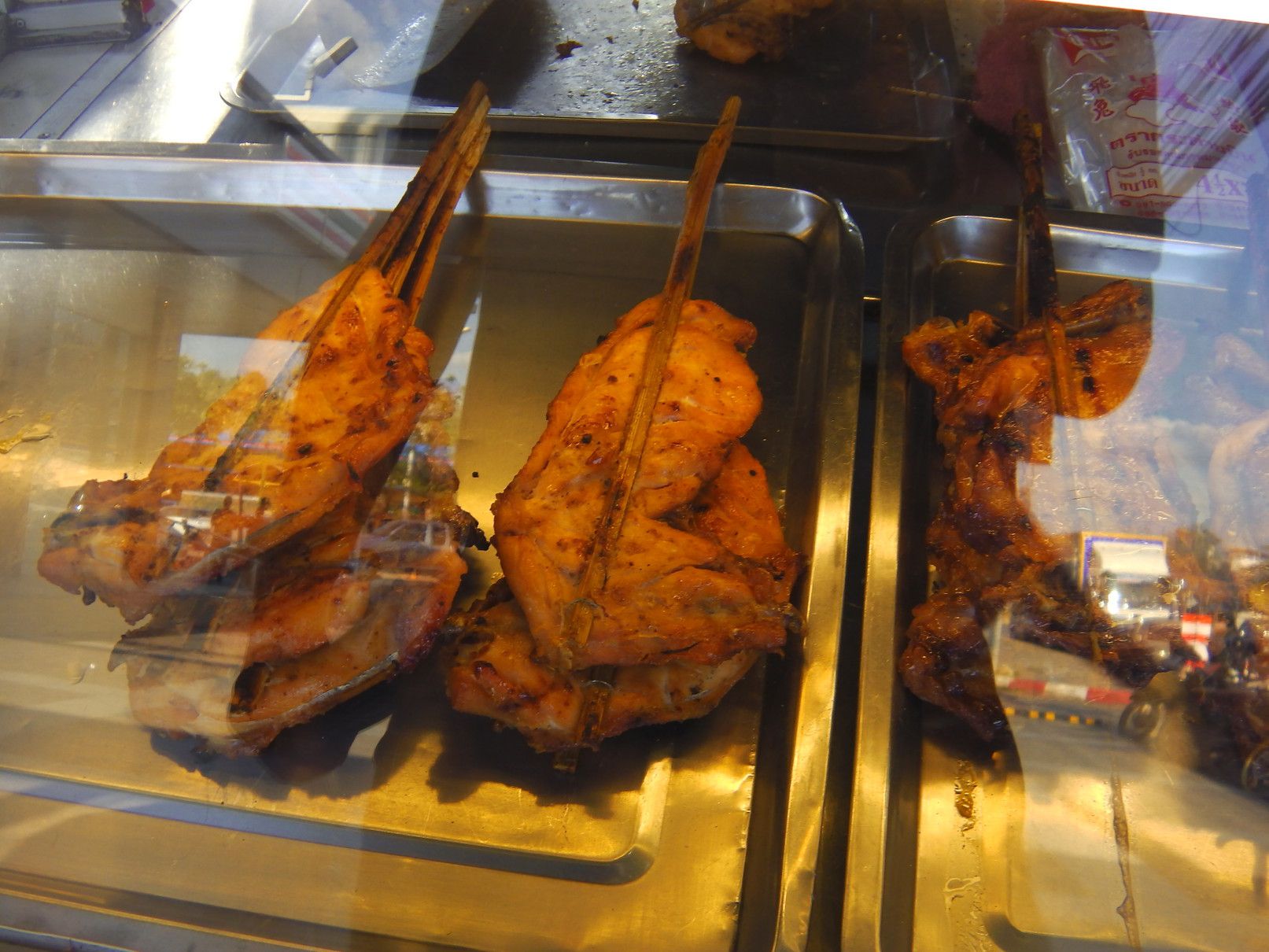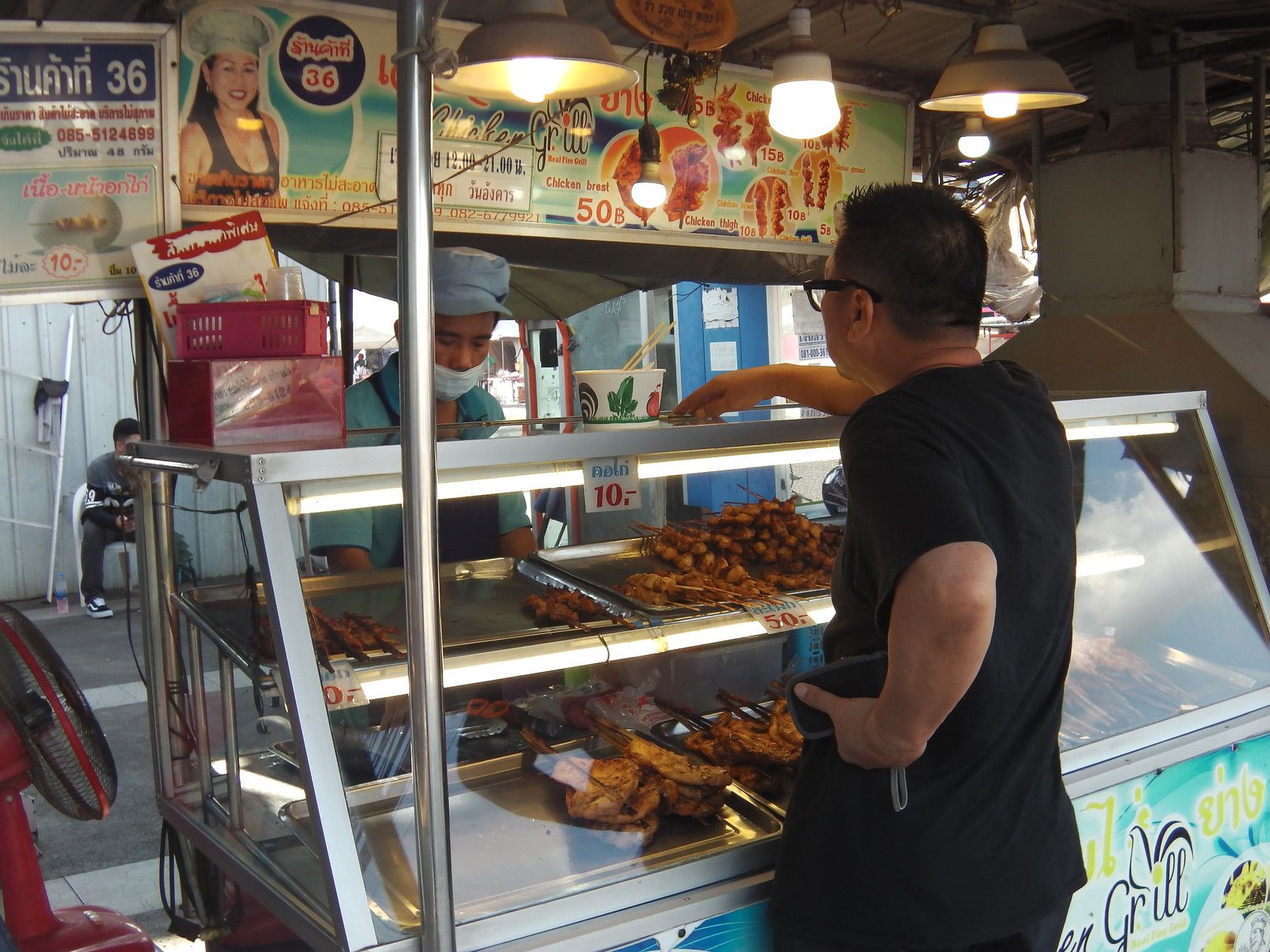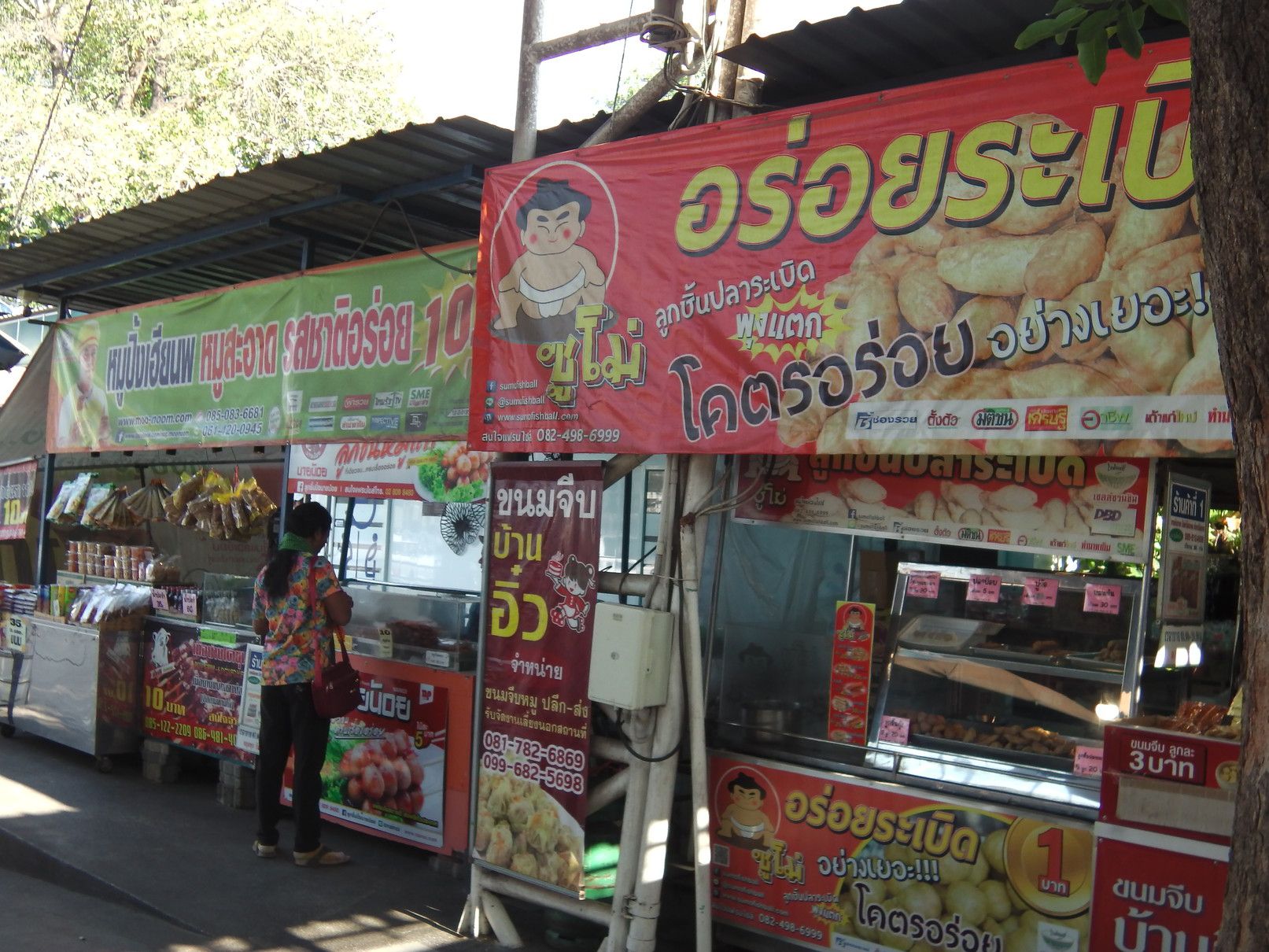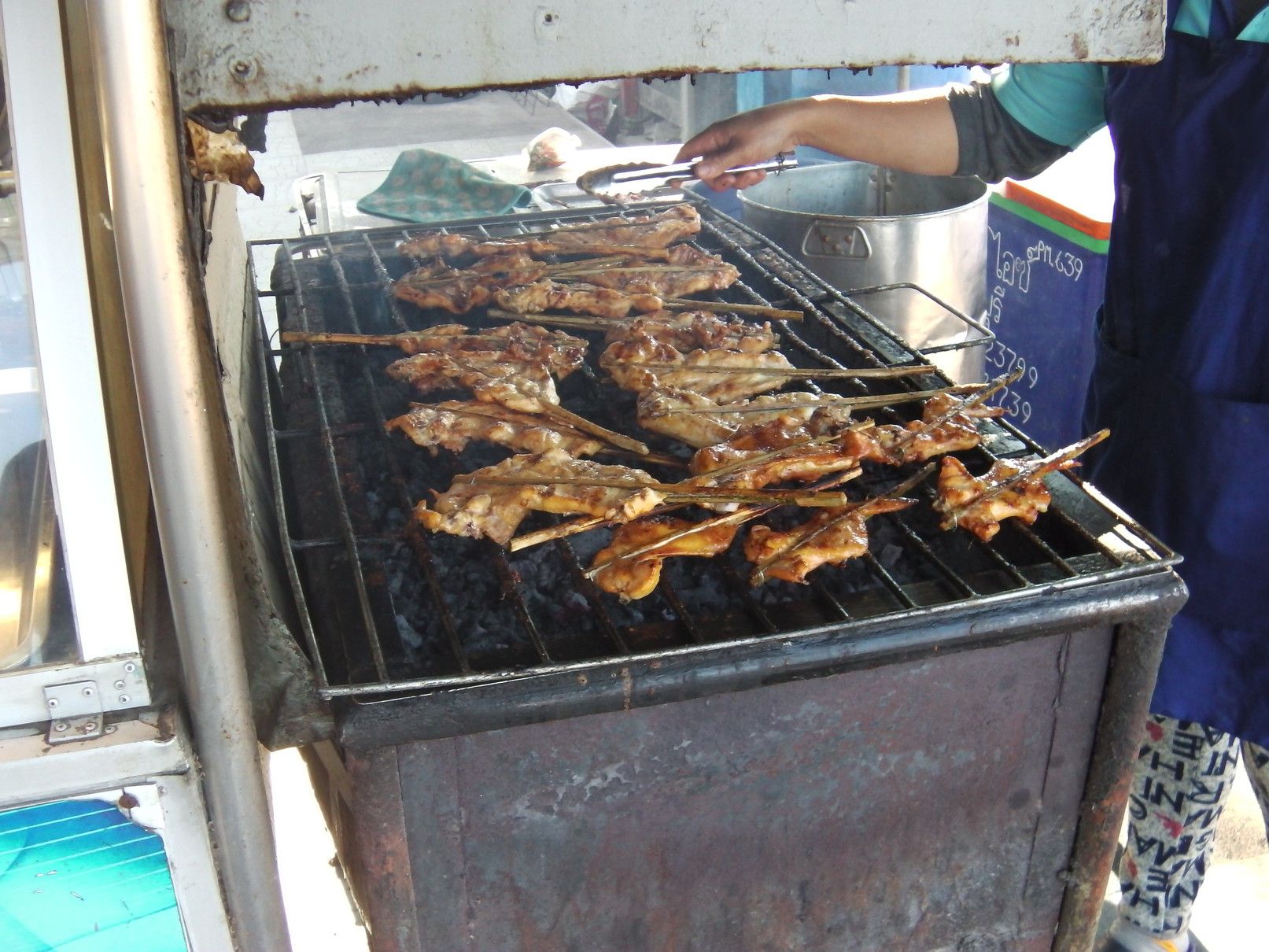 ここ数年間、全く値上げは無し。この焼き鳥は、1本10バーツ。こうして、タレに付けた肉を、炭焼きする。買い求める人が絶えない。敷地の近くにも屋台が並ぶ。今回は、これも1パック。20バーツ。これを、車内に置いて漂ってくる臭いを嗅ぎながら運転。往復、4時間強の運転疲れで、焼酎は進まないけれど、爆睡でした。