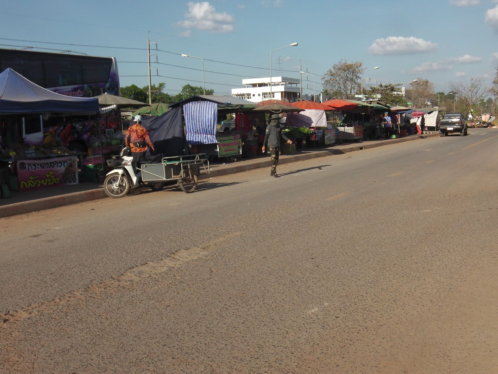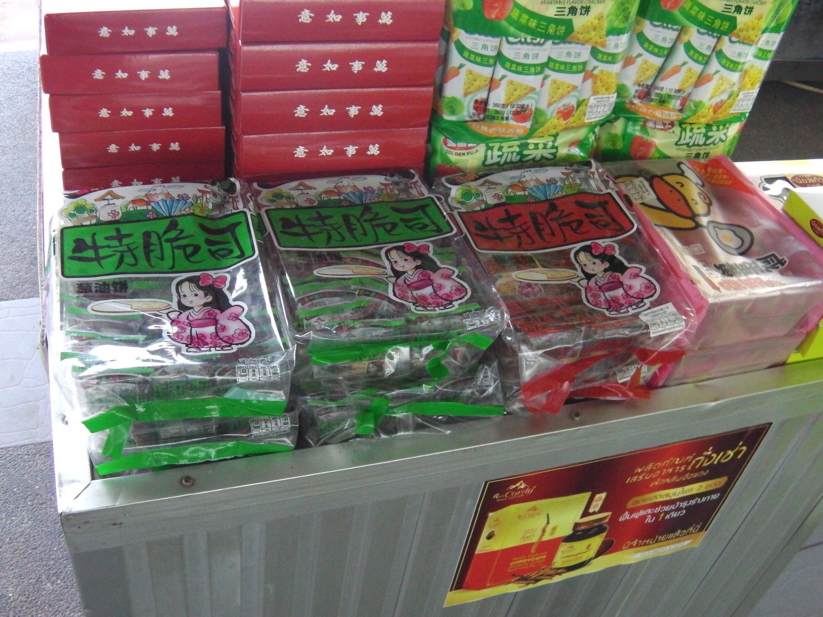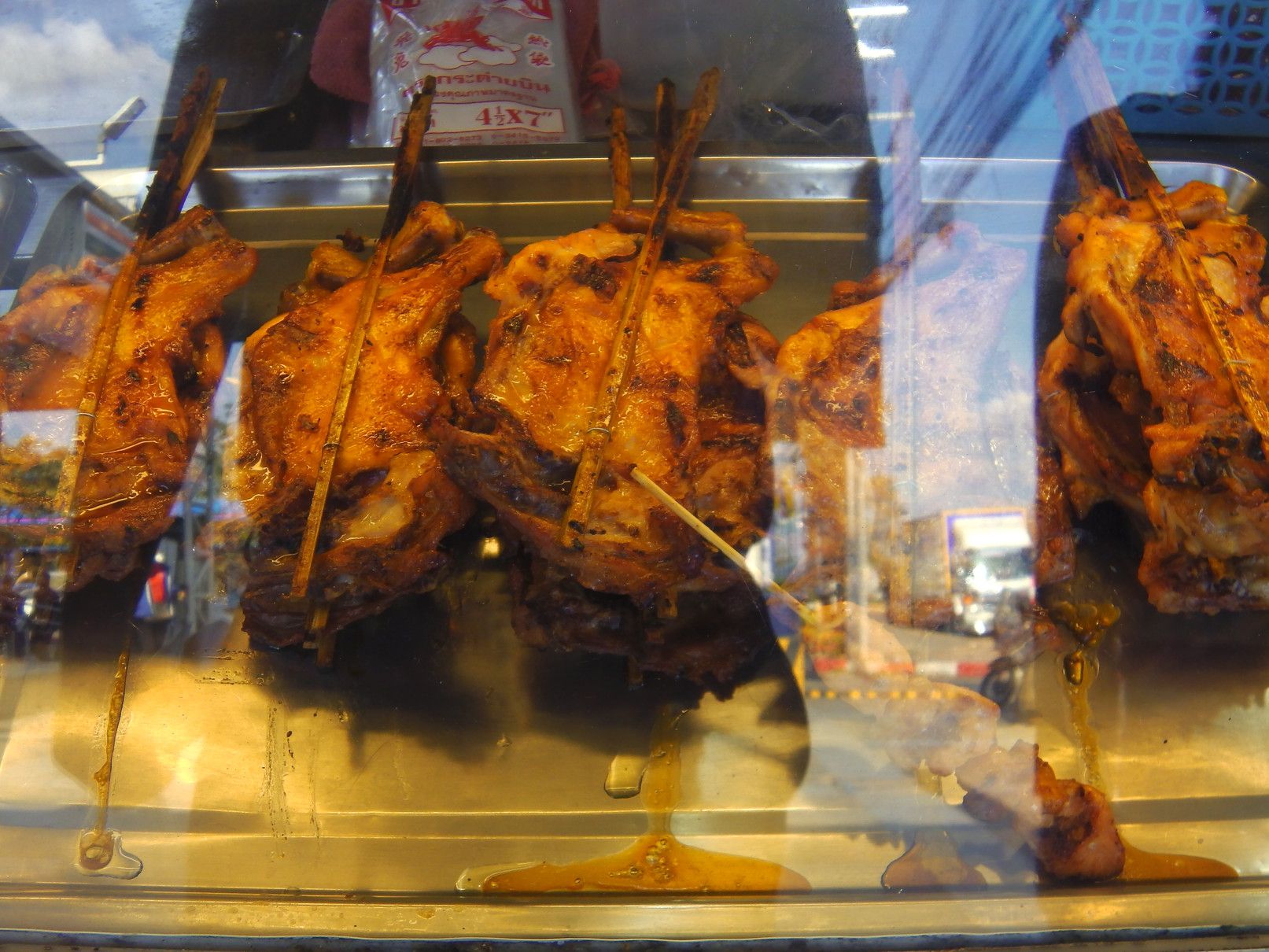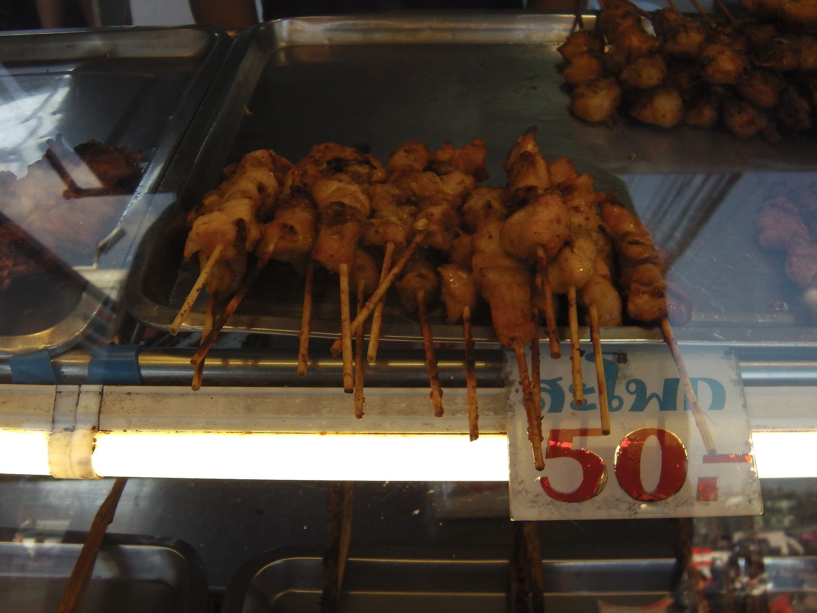 ここ数年間、全く値上げは無し。この焼き鳥は、1本10バーツ。こうして、タレに付けた肉を、炭焼きする。買い求める人が絶えない。敷地の近くにも屋台が並ぶ。今回は、これも1パック。20バーツ。これを、車内に置いて漂ってくる臭いを嗅ぎながら運転。往復、4時間強の運転疲れで、焼酎は進まないけれど、爆睡でした。