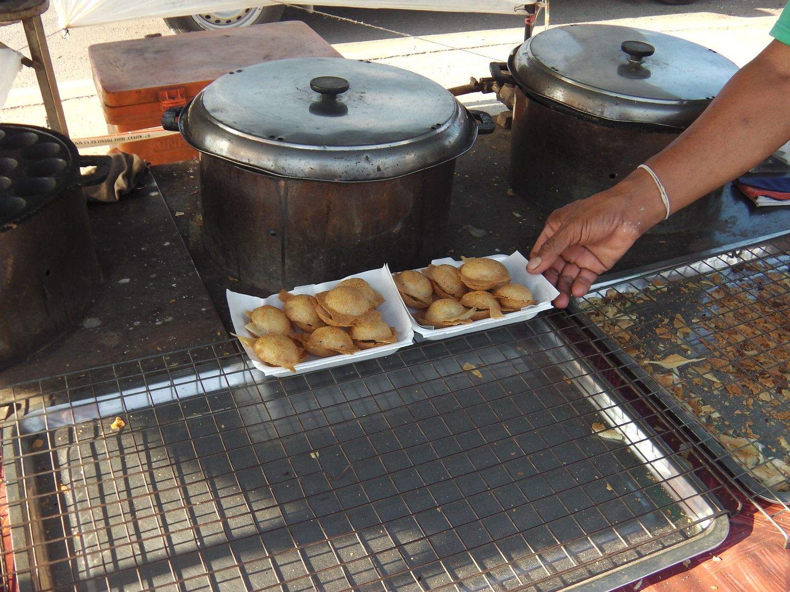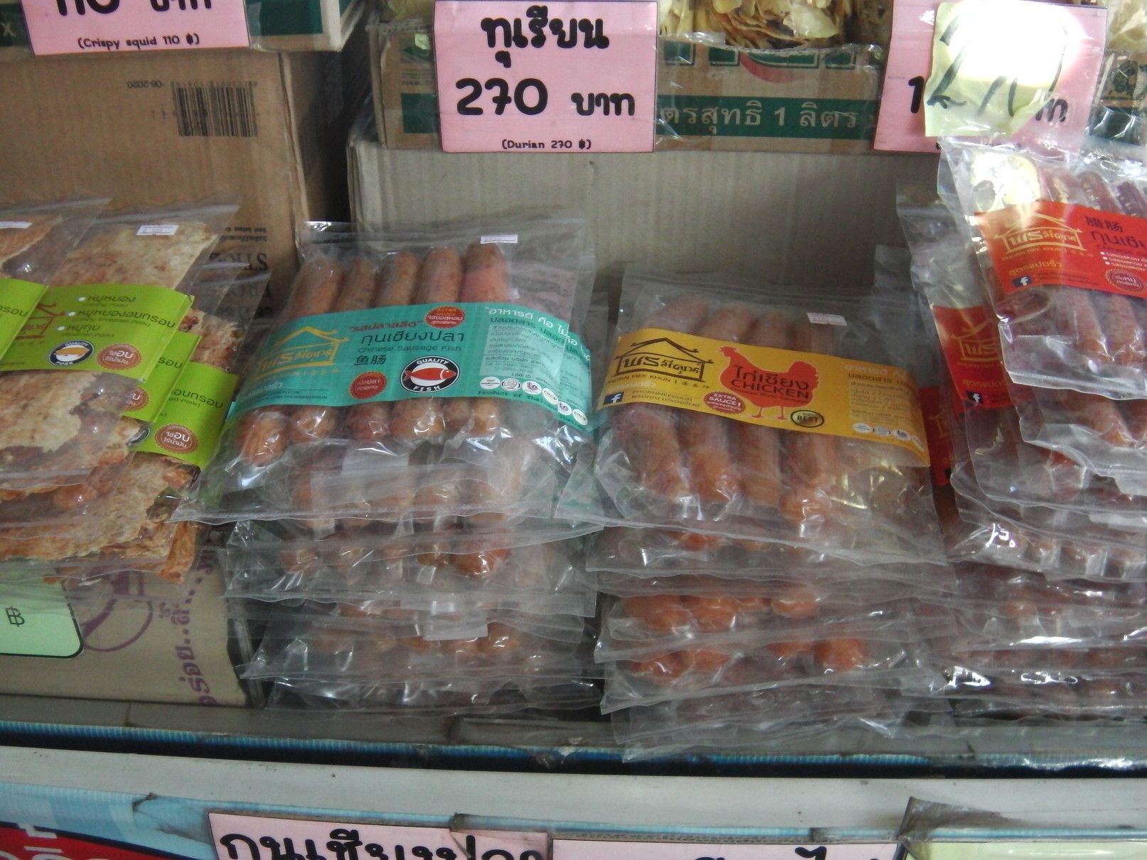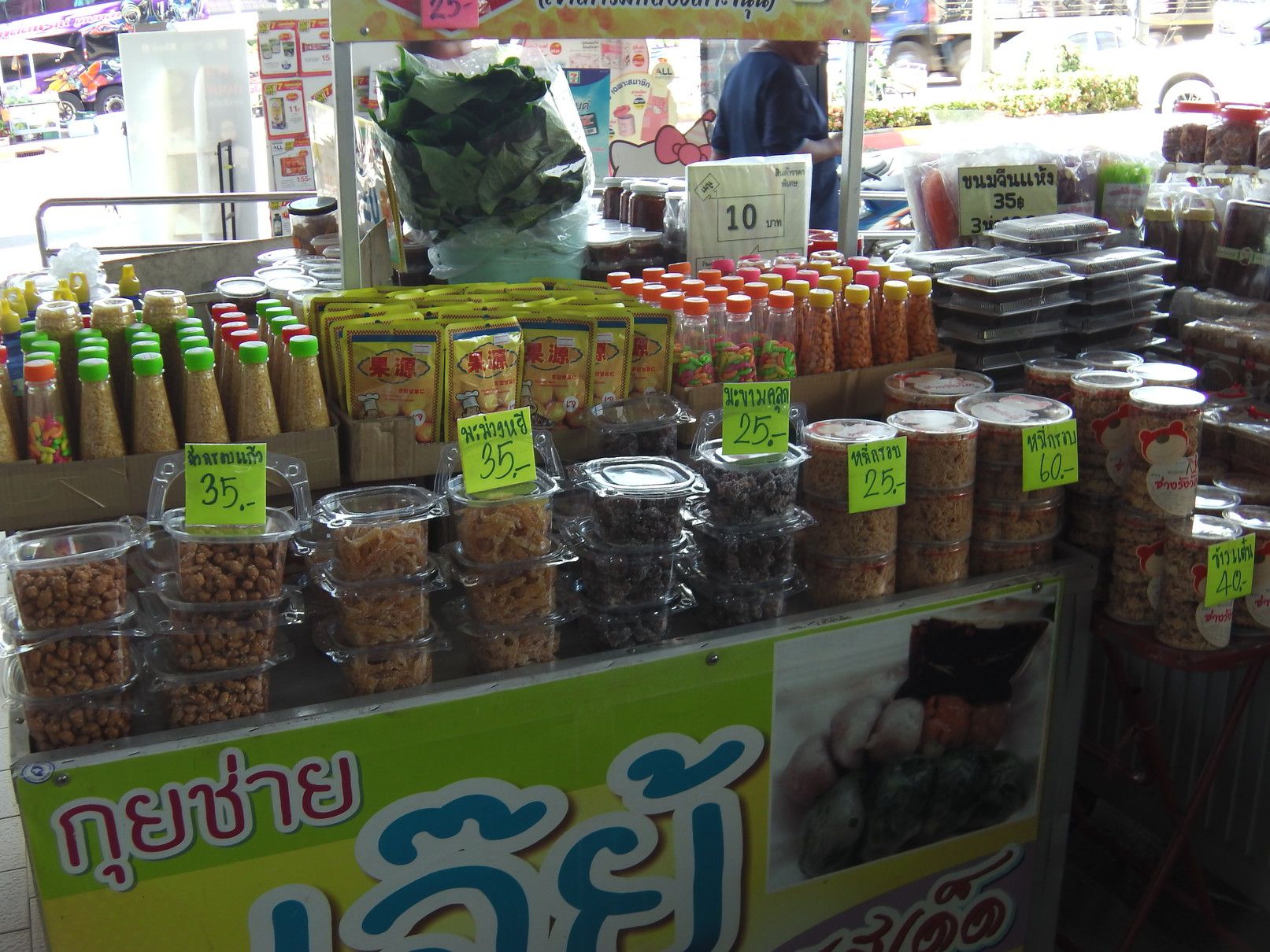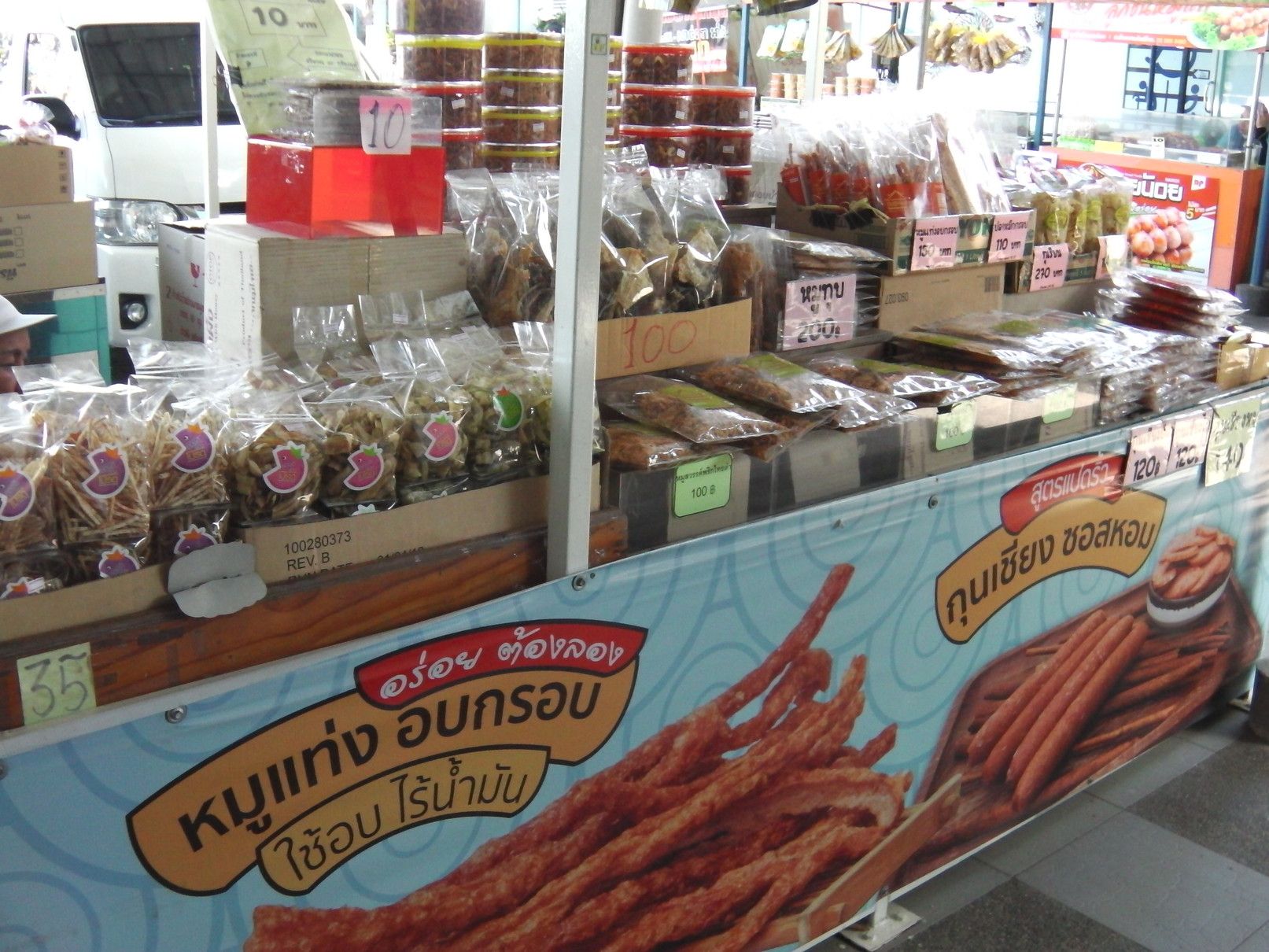 ここ数年間、全く値上げは無し。この焼き鳥は、1本10バーツ。こうして、タレに付けた肉を、炭焼きする。買い求める人が絶えない。敷地の近くにも屋台が並ぶ。今回は、これも1パック。20バーツ。これを、車内に置いて漂ってくる臭いを嗅ぎながら運転。往復、4時間強の運転疲れで、焼酎は進まないけれど、爆睡でした。