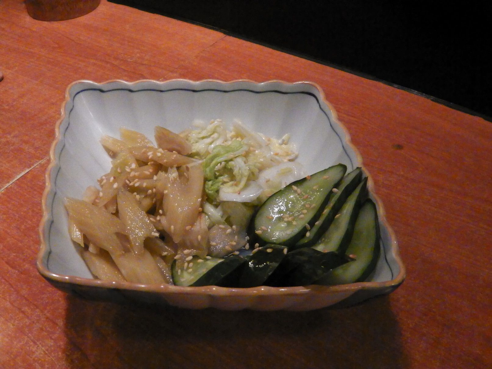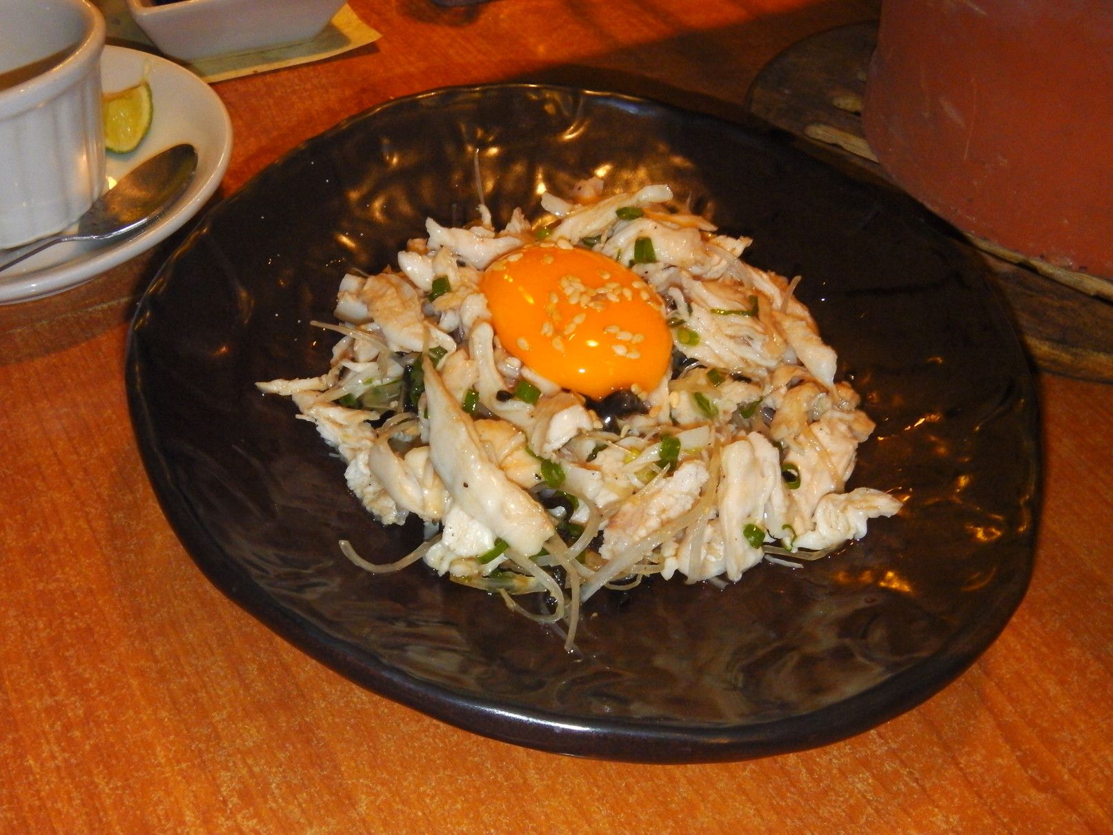では、何処にしようかと暫く悩んだ結果、もう十年近く前?もっと前?記憶では、オープン当初に行った事がある店に行く事にした。美味しかった記憶がある。念のために、電話で確認すると、年中無休との回答だった。スクムビット通りソイ41の路地を少し入った場所に在る店。今回は、1階のカウンターに座った。すると、直ぐに出てきた小さな器に入ったスープ。鶏の出汁で美味しい。サービスらしい。自身が食べたかったのは、鳥刺し。オーダーした後に、直ぐに出てきたのは漬物の盛り合わせ。器の左側にある薄茶色の漬物は何だろうと食べてみると、何とセロリ!しかも、少しだけ酸味があり抜群に美味しい。そして、ビールが運ばれてきたが、キンキンに冷たい。この小さな気配りが嬉しい。もう、自身は鳥刺しさえあれば満足。そう思っていたが!友人がオーダーした、鶏肉のユッケを食べて、美味くて驚き。ごま油で味付けされていた。そして、これが焼き鳥。冷たくならないように、温めるものが器の中に入っているのだけれど、煙が上がる程では無かったので何らかの工夫がされていると思われた。マナオサワーに変更。野菜の串焼きと、焼き鶏追加で、お勘定。すると、デザートのプリン。そして、お土産まで頂いて帰宅となりました。