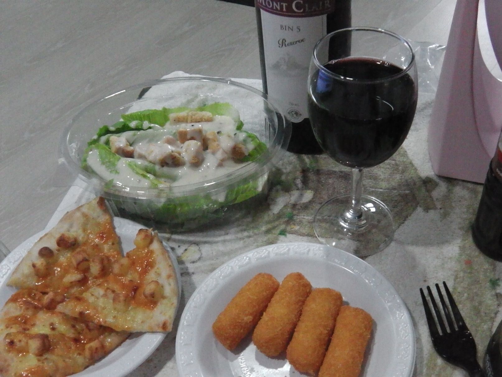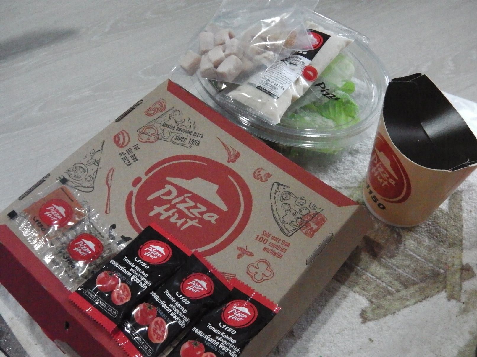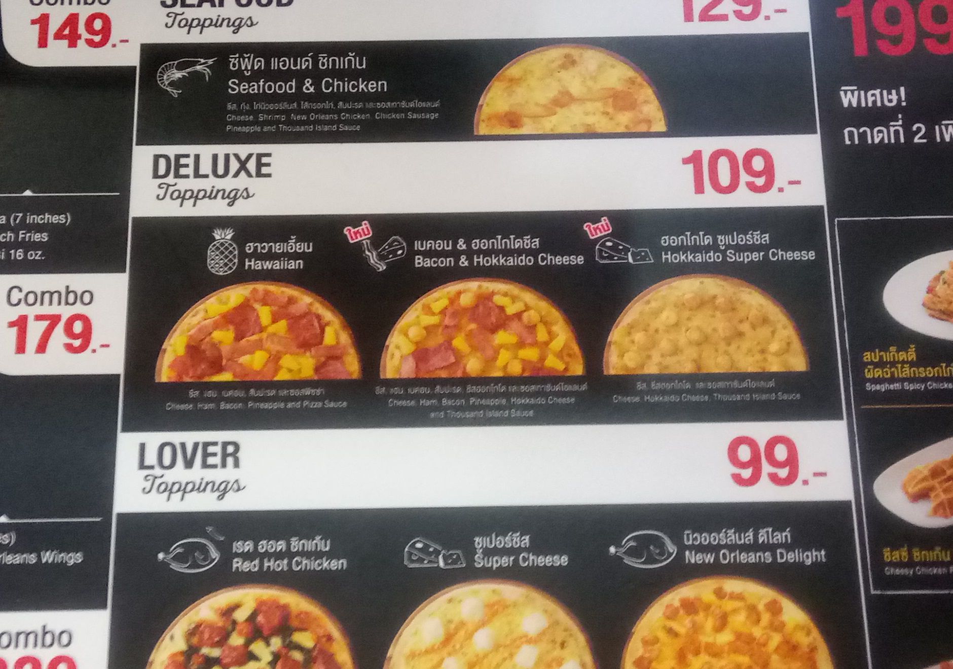 買い物をして帰るだけ。その中でも、当日の晩飯を考えていたら。。。こんな看板が目に留まった。もう、考えてみれば洋食のファーストフードに興味を持たなくなって何年にもなる。ケンタッキー、マクドナルドを含めて。。。久々に、買って帰るかぁ。。。そう思ってしまった。メニューを眺めていると。。。北海道スーパーチーズなるピザがあったので、それにすると共に、他にも少々購入した。そして、晩飯時。これが、購入した全て。200バーツを少し超えた位の価格。ピザとサラダと、チーズフライ。箱を開けた瞬間に。。。何処が北海道なのだ??と思ってしまった。後から考えて、サラダはドレッシング掛けないで食べたら良かったのに。。。と思ってしまった。これらを見ていると、冷蔵庫で眠っている赤ワインを飲む事に。少し、不満はあった物の、赤ワインがあってラッキー。南アフリカ産の赤ワイン。しかし、これだけは、何処が北海道なんだ??と思うところが自身の歳を感じました。