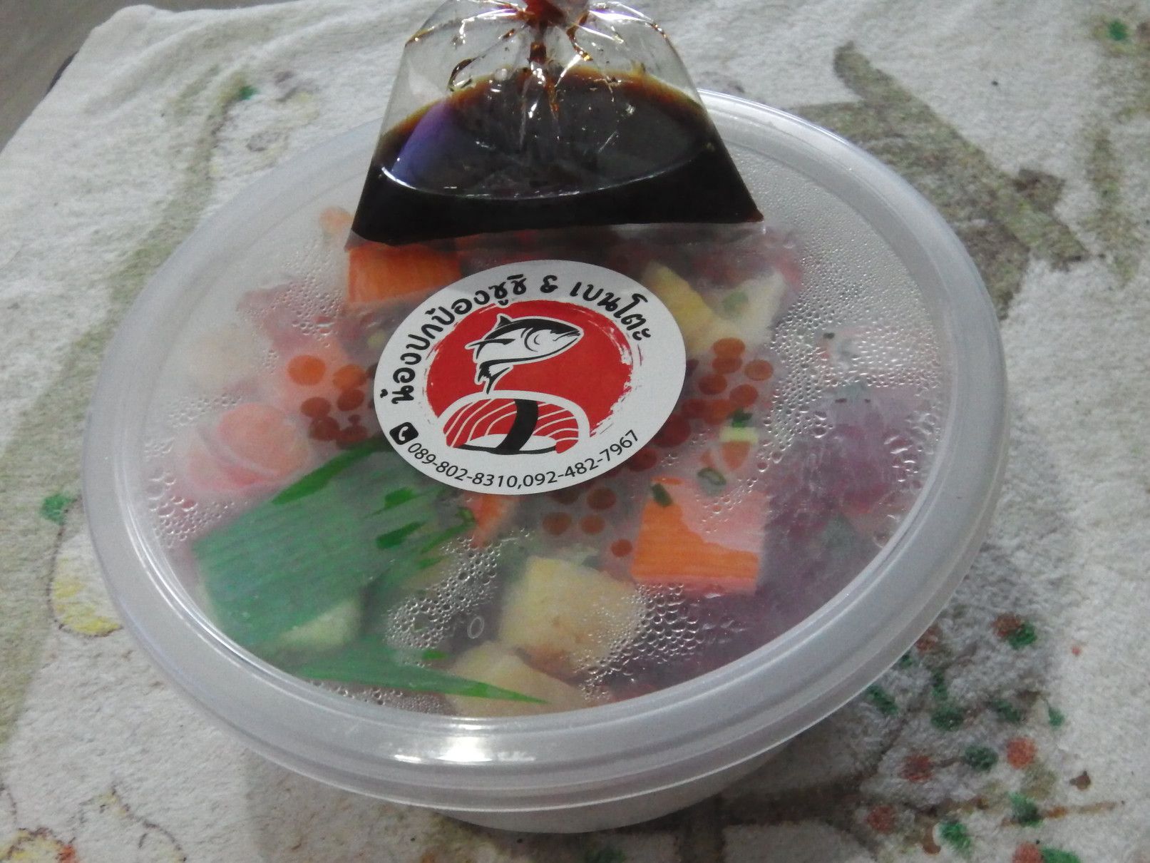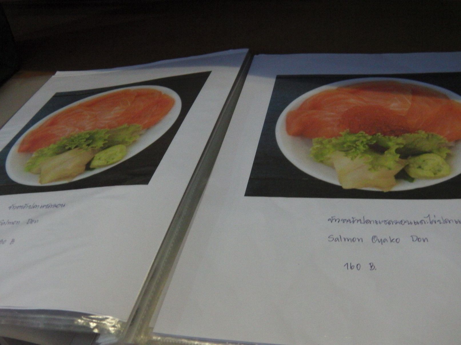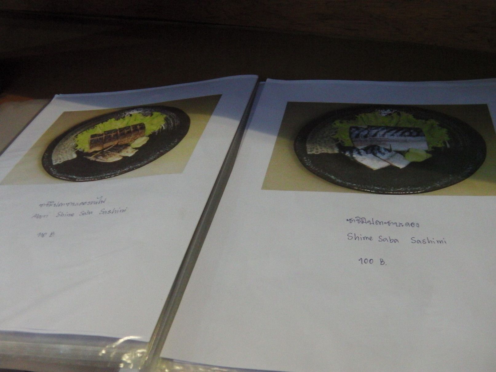 このように、各店には前面にメニューが貼り付けられているので分かり易い。ただ、ぼーっと眺めていると、通路を通る人の邪魔になるので、何度も行き来をした。しかし、この通路沿いでは好みの物は無し。カオマンガイとか、ガイヤーン狙いだったけれど、無し。よって、寿司に決定。この寿司屋さんの場合は、メニューの貼り付けは店内。