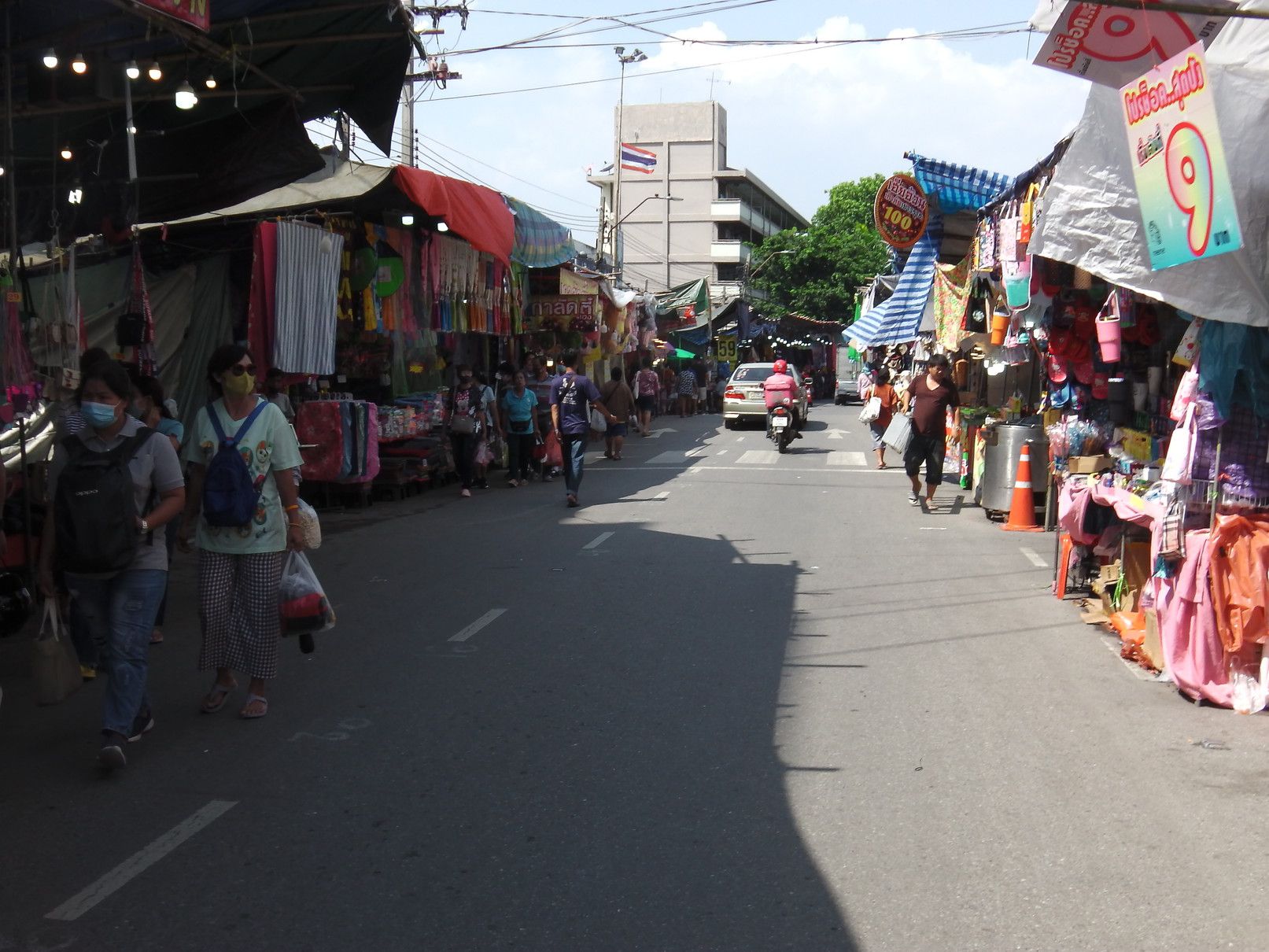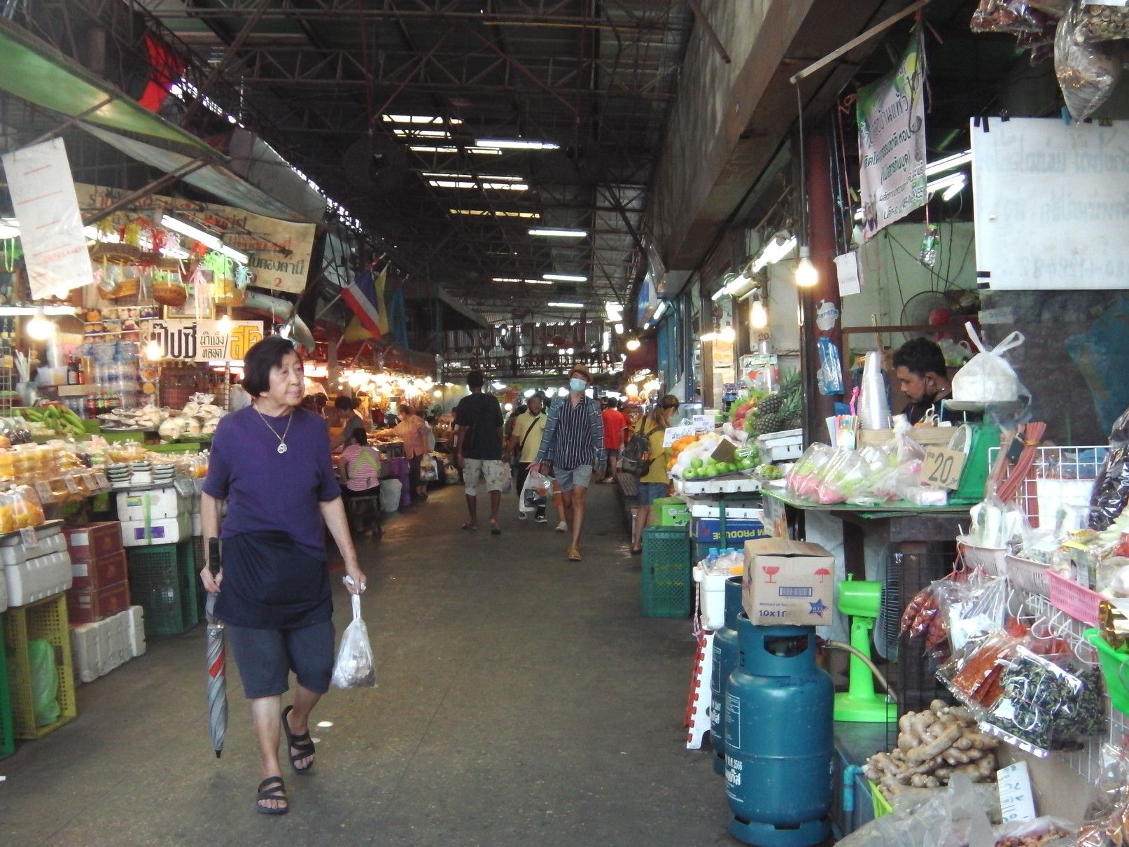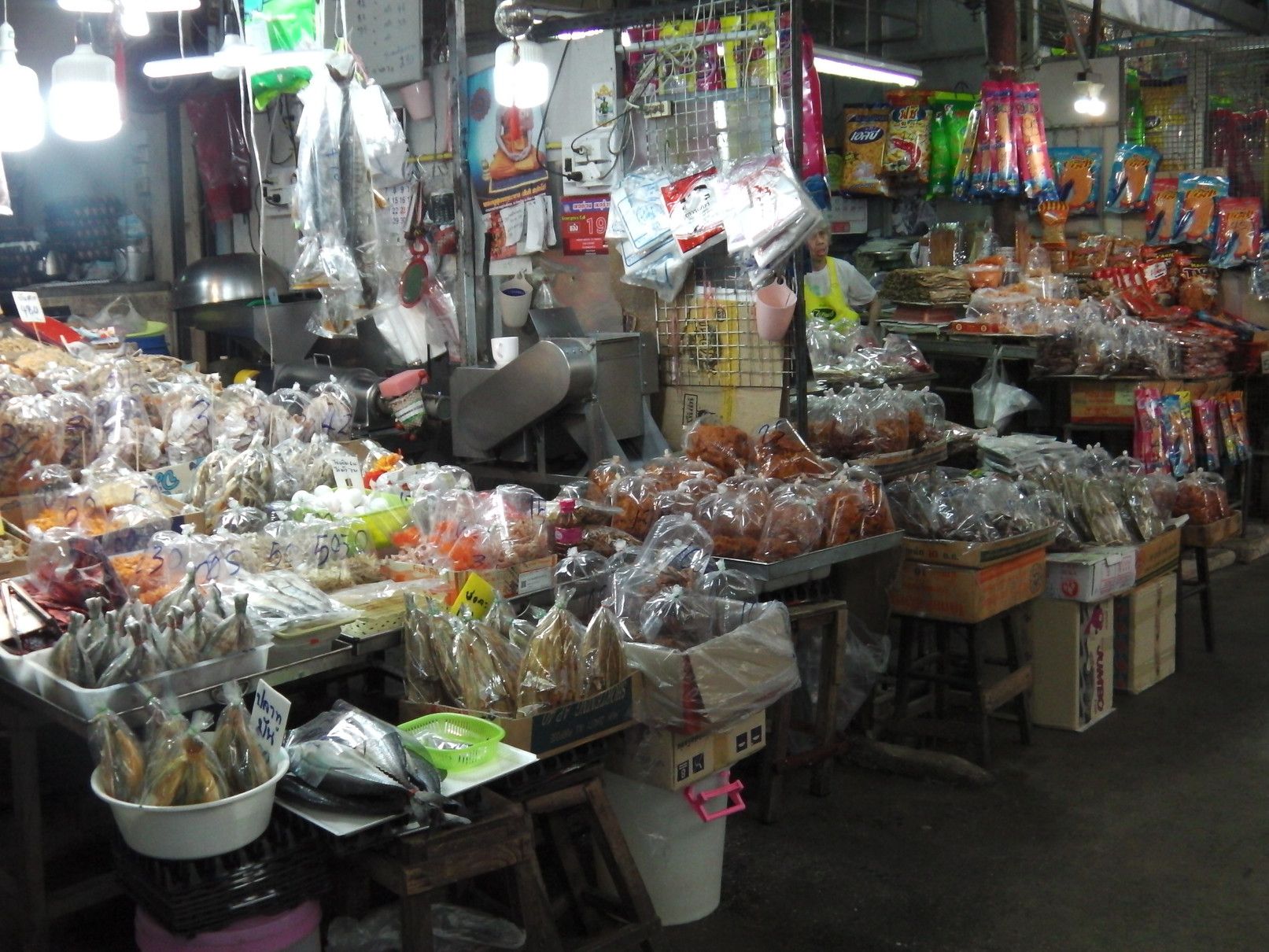 もう、何度も来ているけれど、こんなのは初めてだった。非常に歩き辛くて暑いのでローカルのショッピングモールに涼みに入った。 4階のフードコート。 カフェラテが20バーツ。ローカル値段。イイですね。。。 30分ほど休んで外に出ると、こんな感じで凄い! 車も行き来する道路なので、歩き難い。 何んとか市場に入ると、外とは全く異なり、普段道理の様子だった。 入って、ドン突きに在るのは渡し船の船着き場。いつか渡ってみたいと思いつつ、実現するに至らず。 ドン突きを左に曲がると、目的の乾物屋が集まる場所で、その奥は生鮮食品の店となる。 海老でも買って帰ろうか悩むが、食べるには手間がかかると思い。。。悩む。 乾物屋さんに戻って品定め。この時間が楽しい。 買い物が終わって、BTSの駅に向かうが、日陰の方を歩く人が多くて歩き辛く、暑い場所を我慢しながらトボトボ。 所々にソイもあるのだけれど、そこにも出店がギッシリ。一体何故??何の祭り?? 各店には、美味しそうな物も売ってはいるのだけれど、物凄いハエだらけ。買いたいとは一切思わず。 何んとか駅に到着。 こんな物を買ってきました。