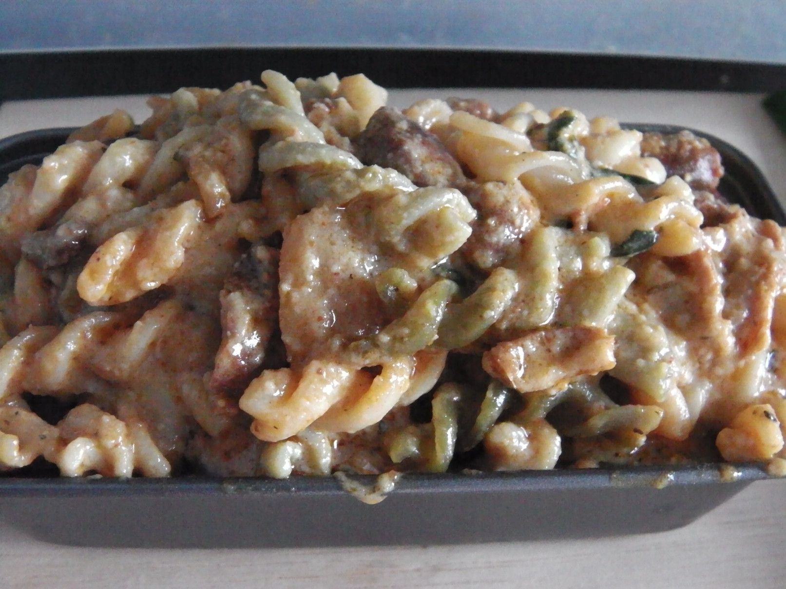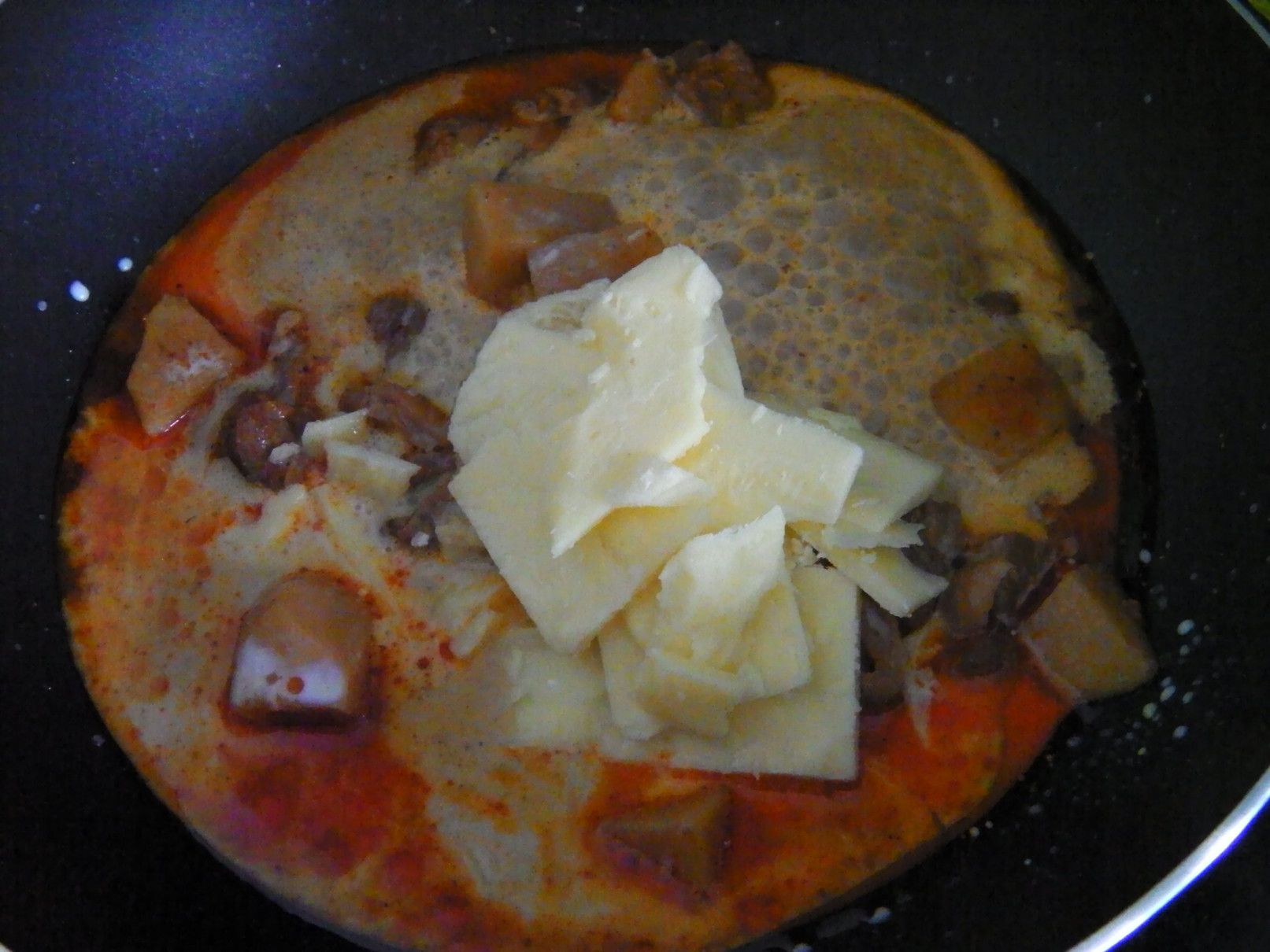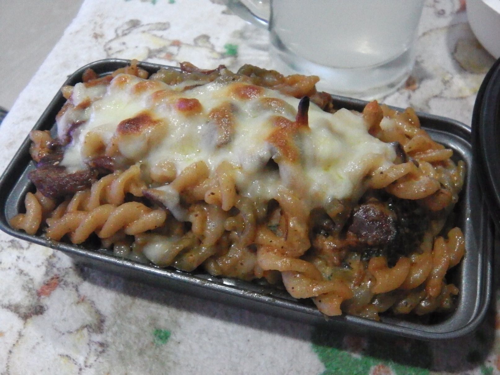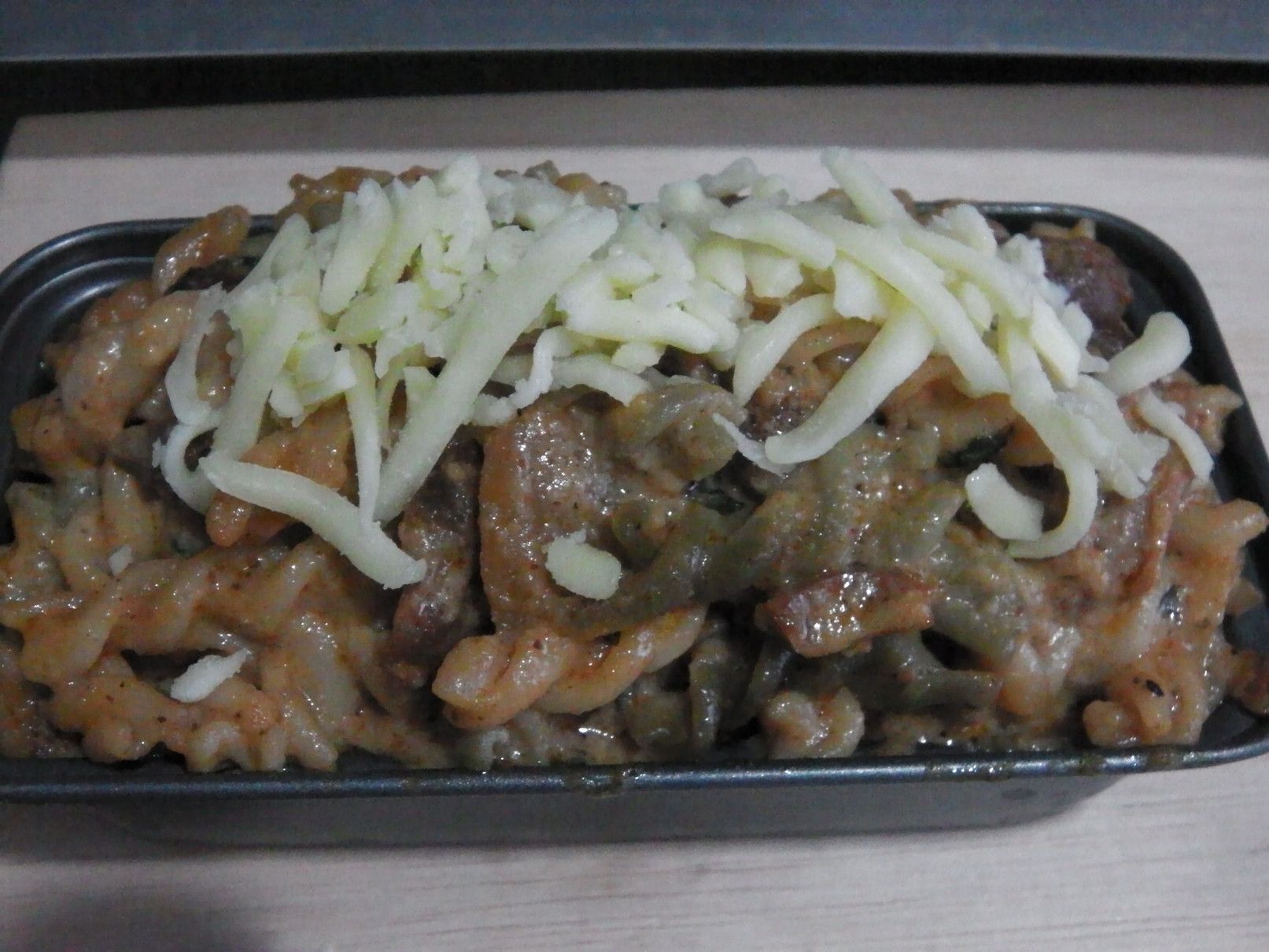 しかし、これぞ!と思える料理は無かったが、使い方は何となく理解できた。 そこで、冷蔵庫の中などから保存している食料を取り出して、えいやー何んとかなるべーー!の気分で料理にチャレンジ。 まずは、以前に茹でていたマカロニを冷凍庫から取り出して解凍。 美味しさのあまり、買い込み過ぎたマッサマンカレーの缶詰。 そして、牛乳。 まずは、マッサマンカレーの缶詰を開けて、フライパンへ。 これを、温める。 牛乳を入れて、更に温める。 そこに、チェダーチーズを投入。 トロトロ感が出るまで、チェダーチーズを加えた。 良い具合になったので、マカロニを投入。 ここから、少し煮込んで火を止めた。 ピザ用のチーズを取り出した。 金属の容器に全てを入れ込むと、てんこ盛りに。 チーズをのせて、オーブントースターで、少しだけ焼いてみた。 完了! 酎ハイマナオのつまみにバッチリ!!!