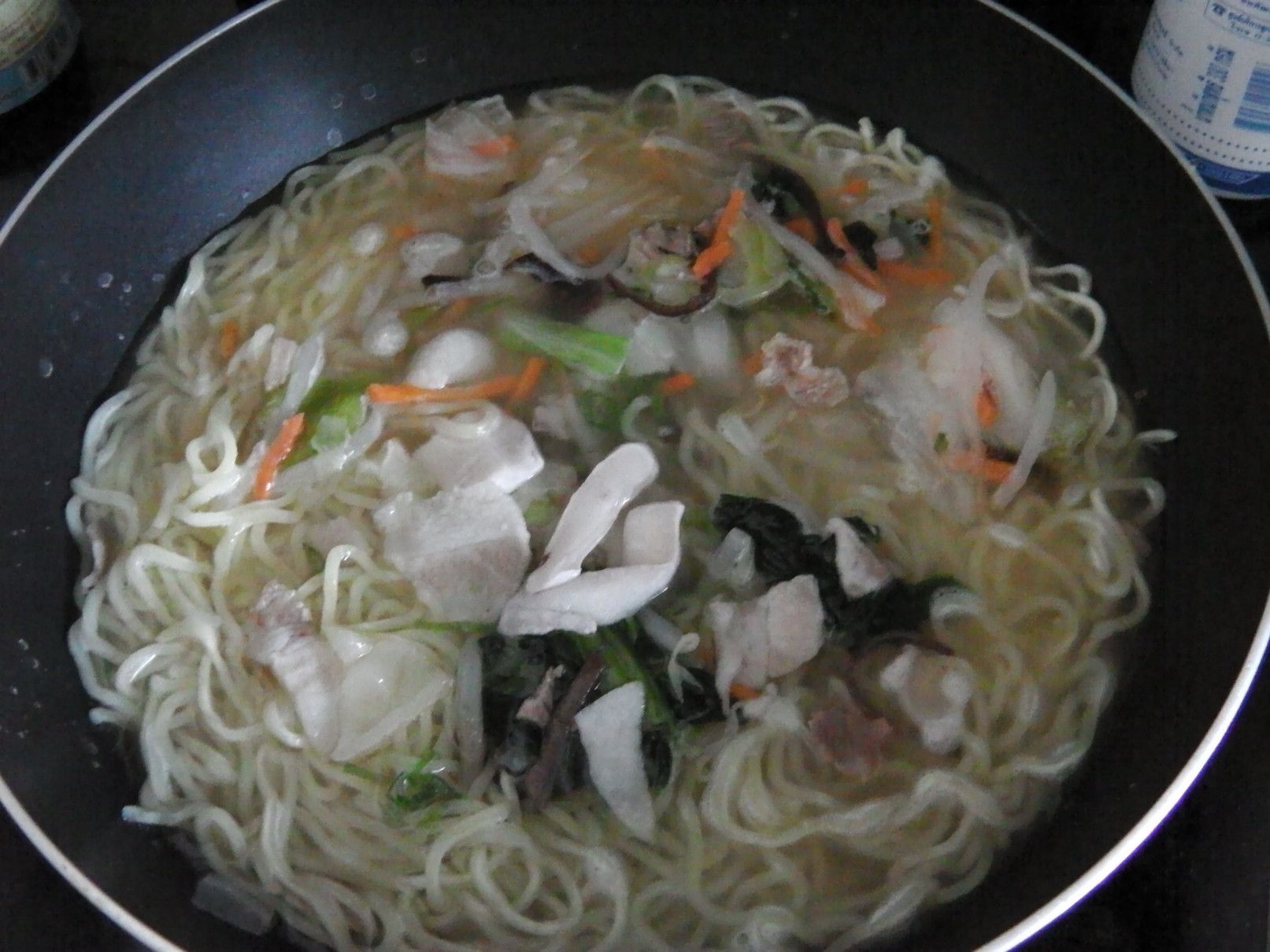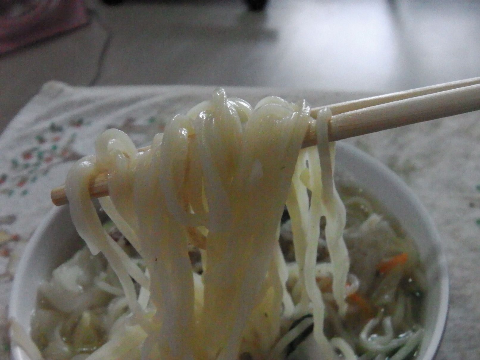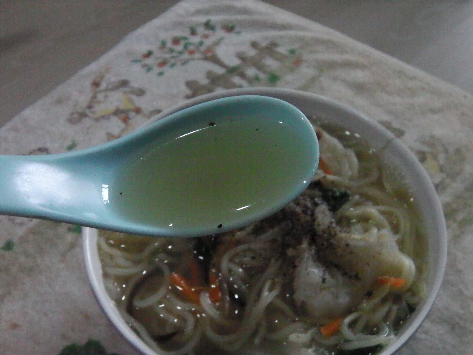 お湯を沸かしてスープを入れて、再び沸騰したら麺と具を入れるだけ。 袋を開けると、麺と具とスープ。 今回は、ちょっとだけ水にも拘ってみた。 沸騰したので、麺を投入。 ここから、少し溶けるまで時間が掛かるが、少しづつ麺を解した。 沸騰して完了。 見た目から美味そう。 少し黒胡椒を掛けて実食。 まずは、スープを一口飲んでみると。。。