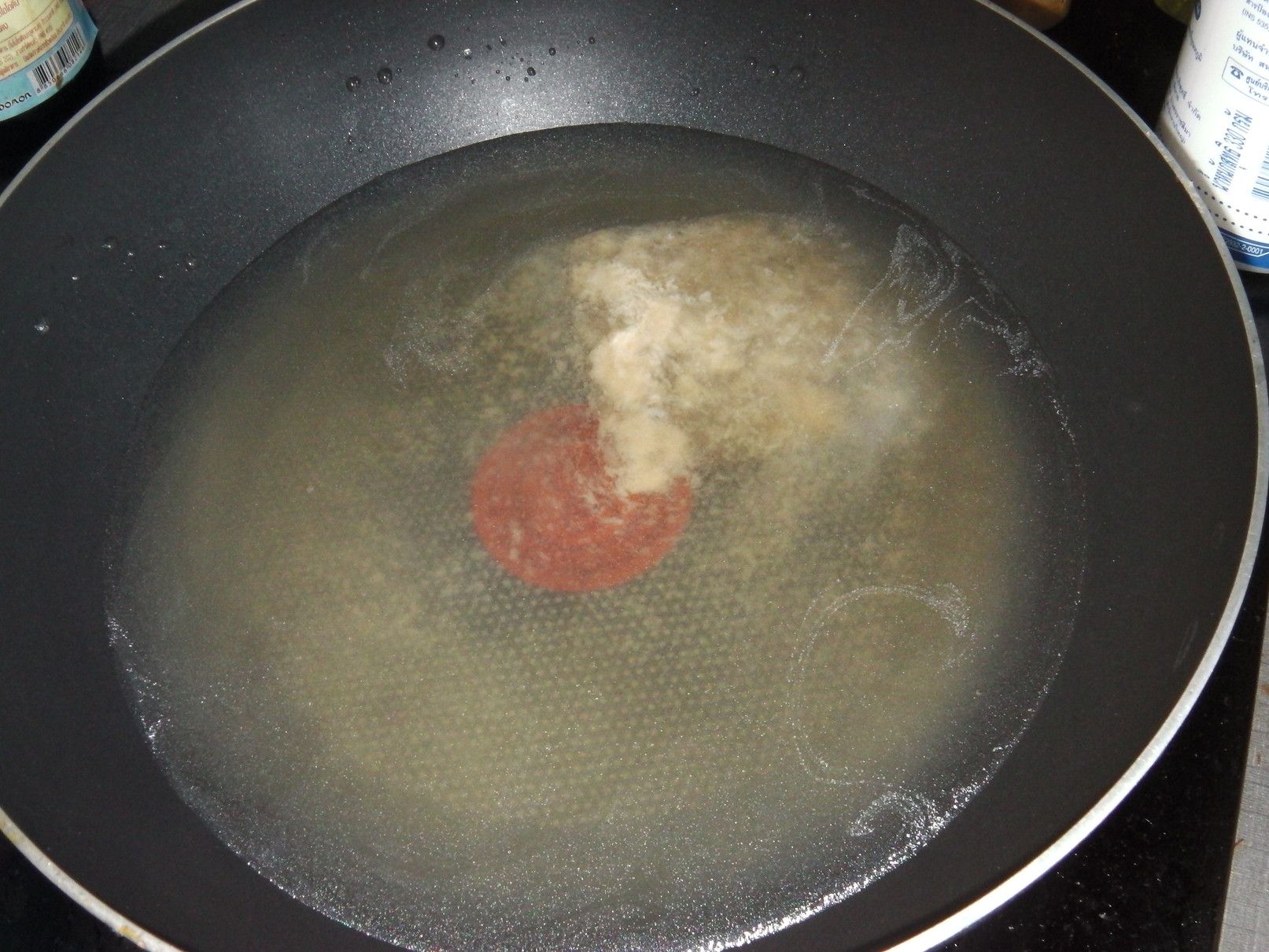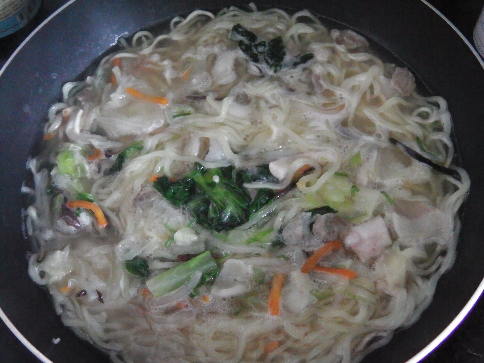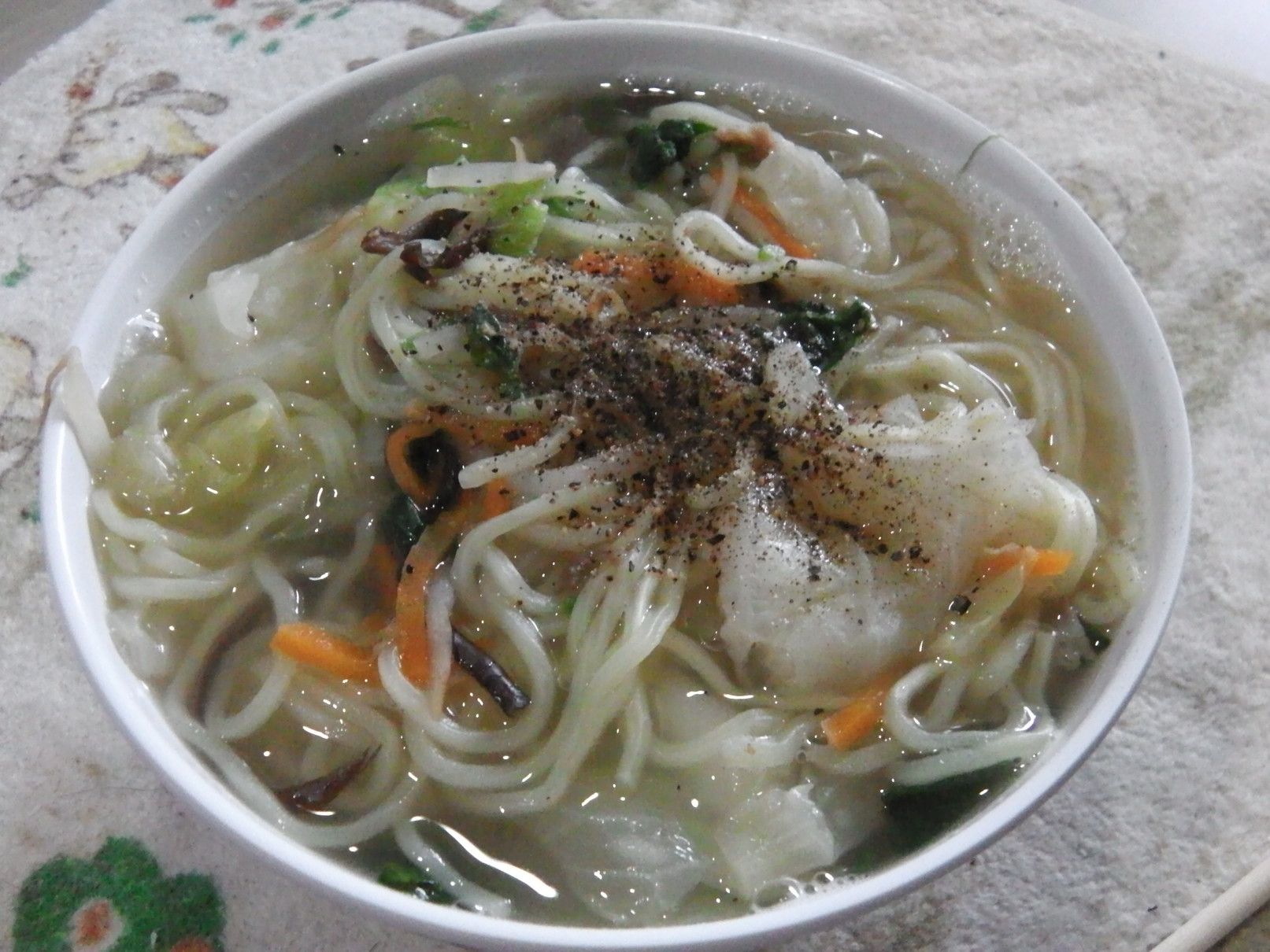お湯を沸かしてスープを入れて、再び沸騰したら麺と具を入れるだけ。 袋を開けると、麺と具とスープ。 今回は、ちょっとだけ水にも拘ってみた。 沸騰したので、麺を投入。 ここから、少し溶けるまで時間が掛かるが、少しづつ麺を解した。 沸騰して完了。 見た目から美味そう。 少し黒胡椒を掛けて実食。 まずは、スープを一口飲んでみると。。。