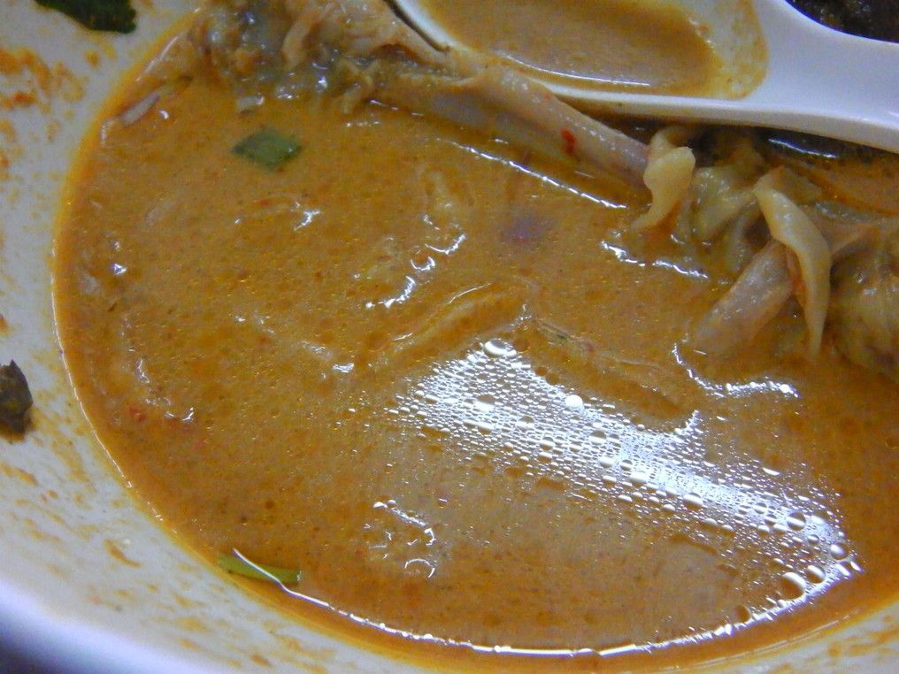 恐らく、今までで断トツでぬるい。何だこりゃ!と思えるほど。 麺を持ち上げて分かったのは、Mサイズの丼の器の大きさは普通なのだけれど、麺は非常に少な目。 具は、鶏肉の他に血のプリンのような物。 本当にスープは美味しいんだけれど。。。