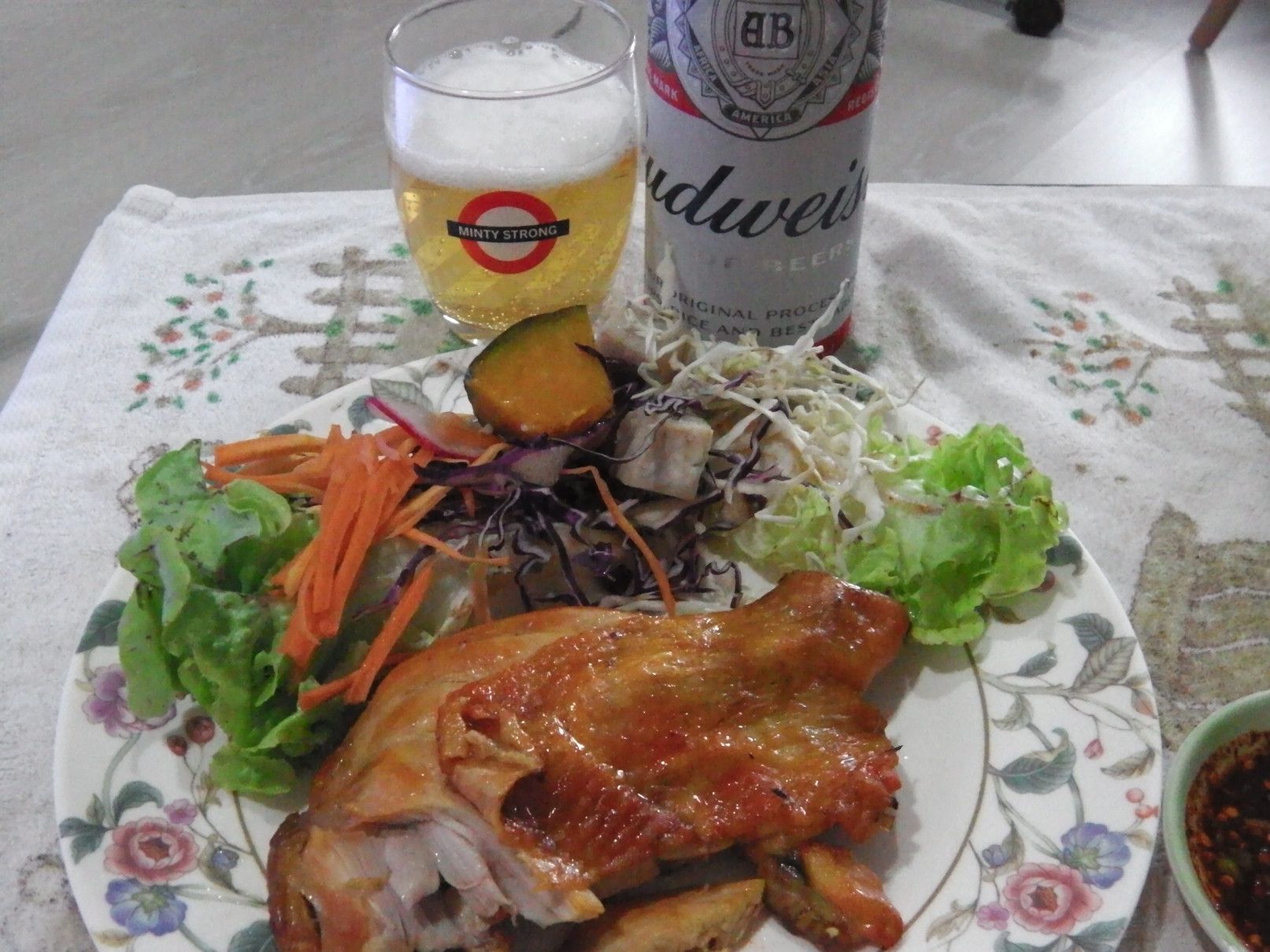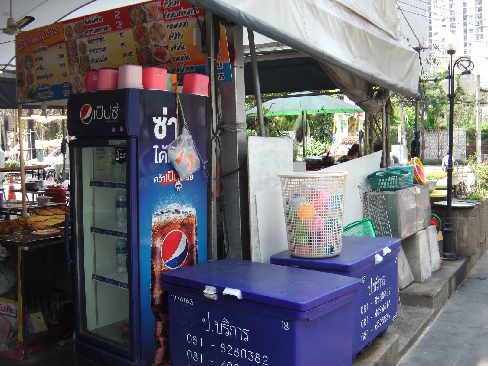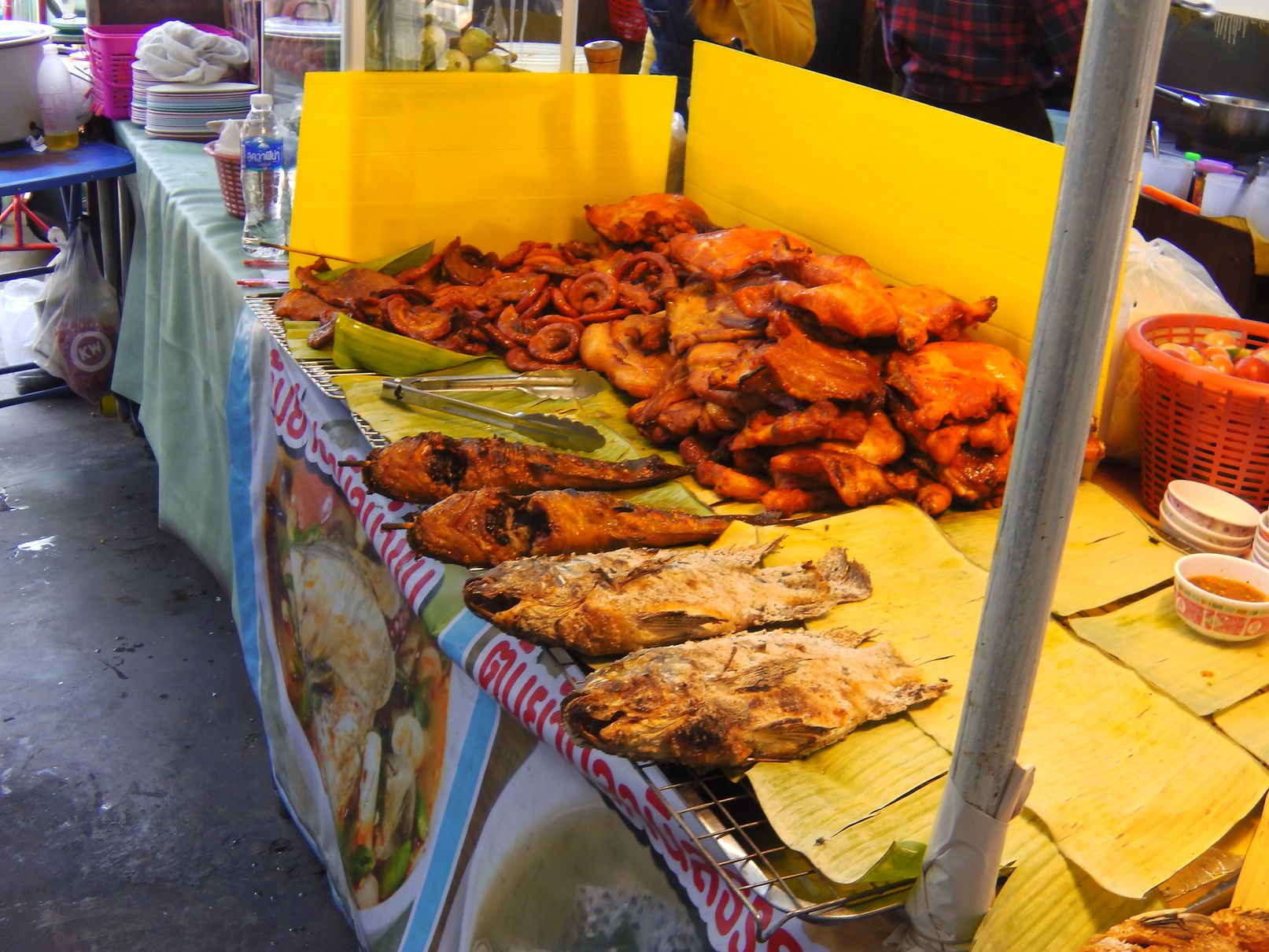 随分と品揃えが豊富になった。 オンヌット通りの屋根付き歩道。 そして、薬局に到着。 店内は、あまり混雑は無し。 10分程度で購入完了。 帰る前に、食料の買い出しで、テスコロータスの駐車場の隅にある店が集まる場所へ来た。 ソイ50に至るまで店が並ぶ。 そこの一番奥に、イサーン料理の店が在った。 ガイヤーンのハーフが、激安の50バーツ。 その晩は、ハーフのハーフを盛り付け。 肉質は、好みの柔らかい肉。