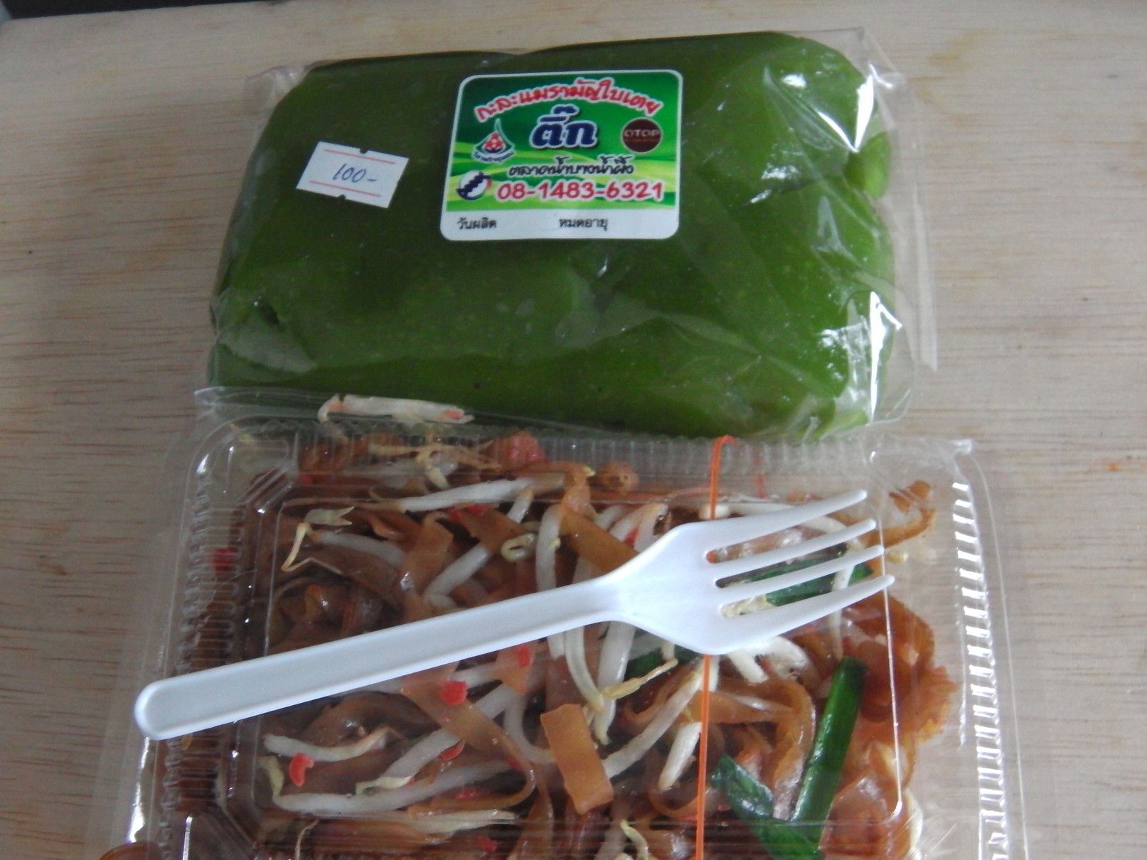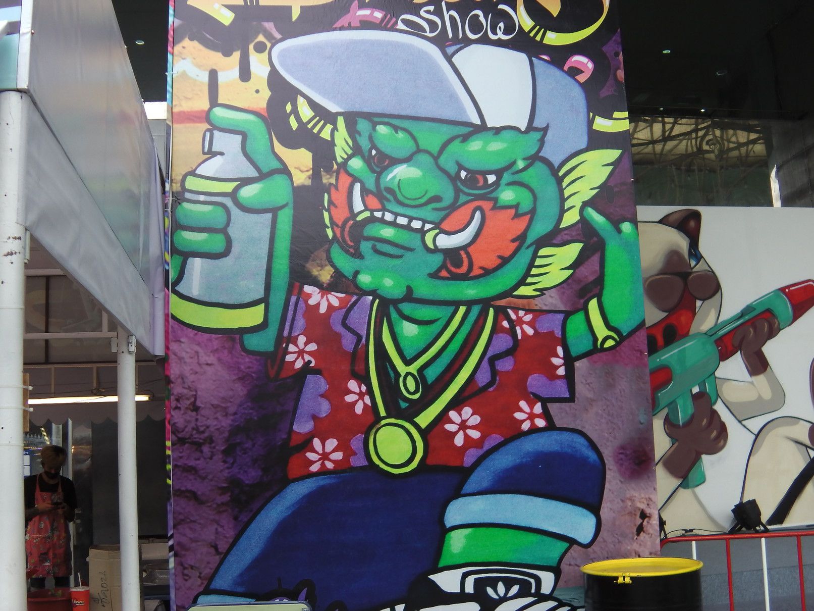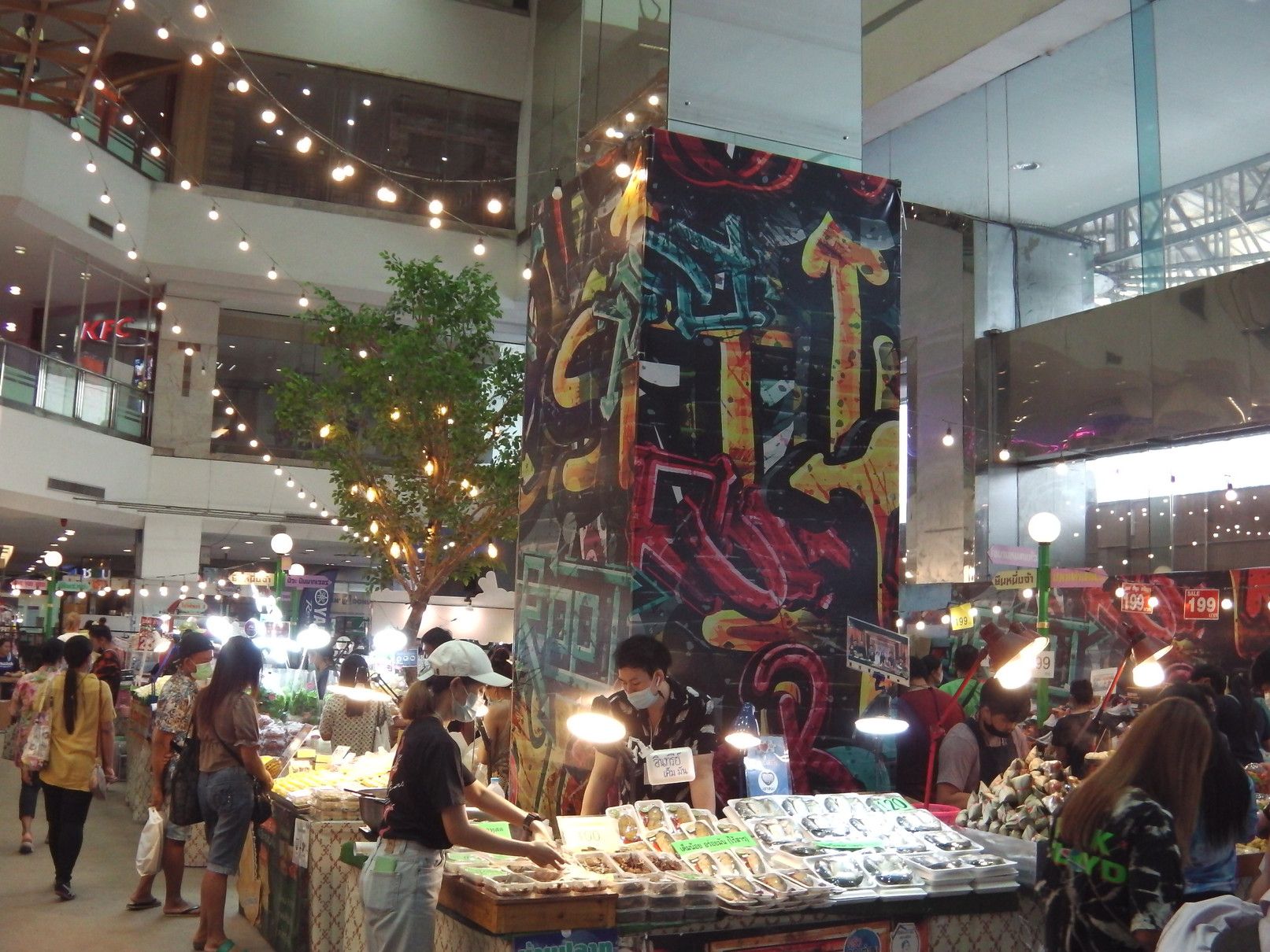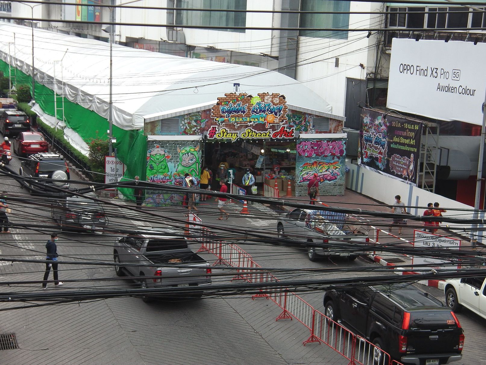 恐らく本館でも、行っているだろう予想した。 本館に入り、4階から見下ろした会場。 用事を済ませてから、会場へ向かった。 この絵は、バンコクのストリートアートでは、よく見かけるアーティストの絵だ。 この近くには、外への出入り口もあり、そちらを眺めると、外でもアートがあるようだった。 こんなアートも。 発想が面白いですね。 全て見学したので、再び中に入り、晩飯でも買って帰る事に。 まず目に留まったのは、餅のような菓子。 非常に好物。 次は、パッタイ。 餅菓子は100バーツだったけれど、パッタイは何んと20バーツ。 これは、思ったより微糖で問題なく食べられた。 パッタイは、麺に味が染みていて非常に美味しかったです。