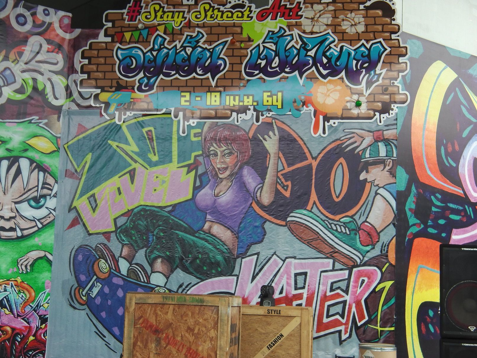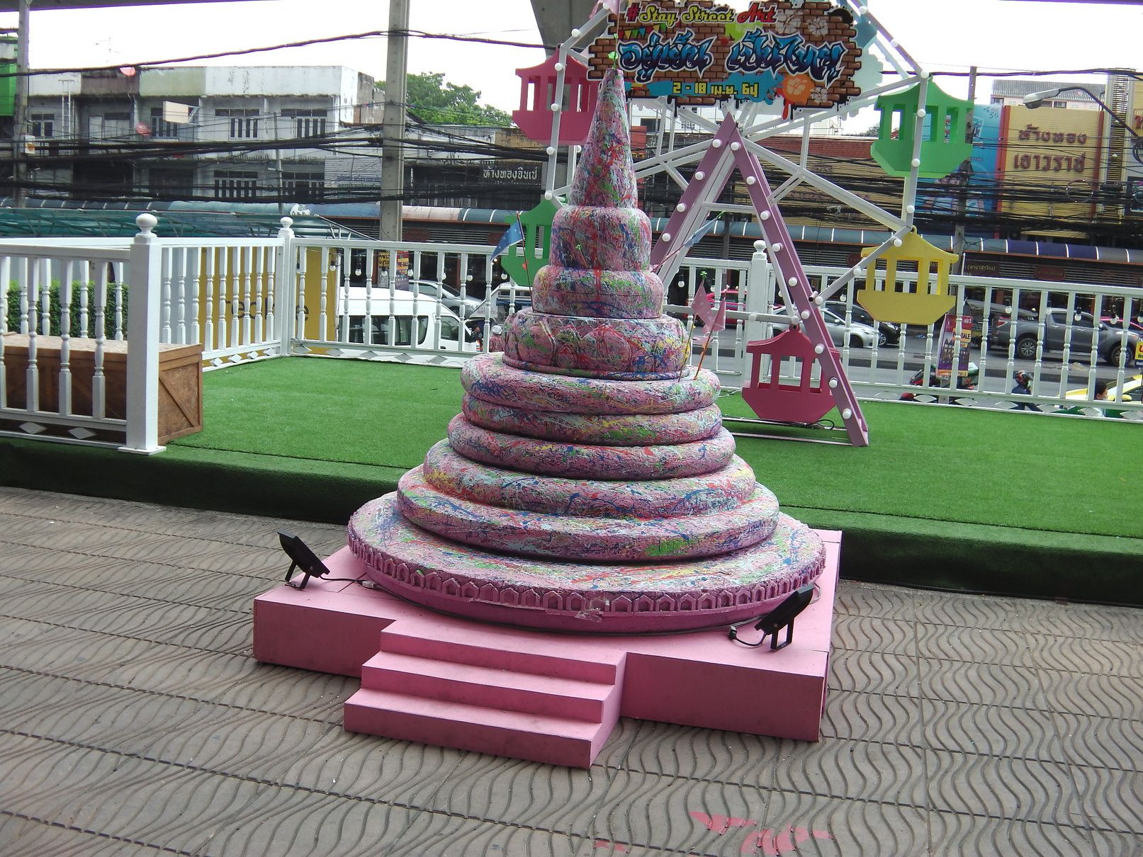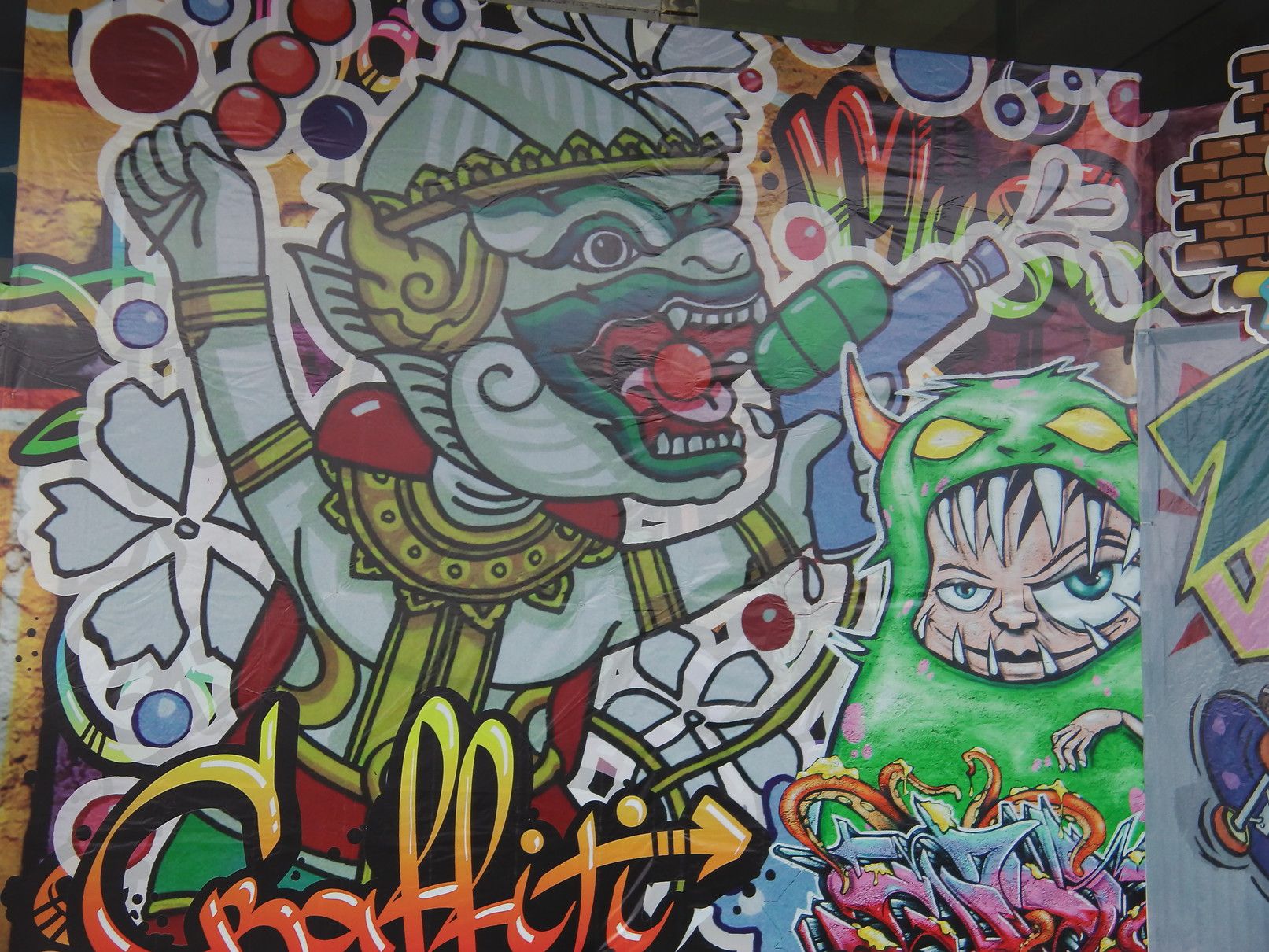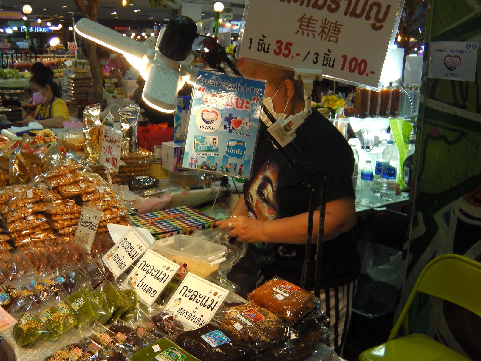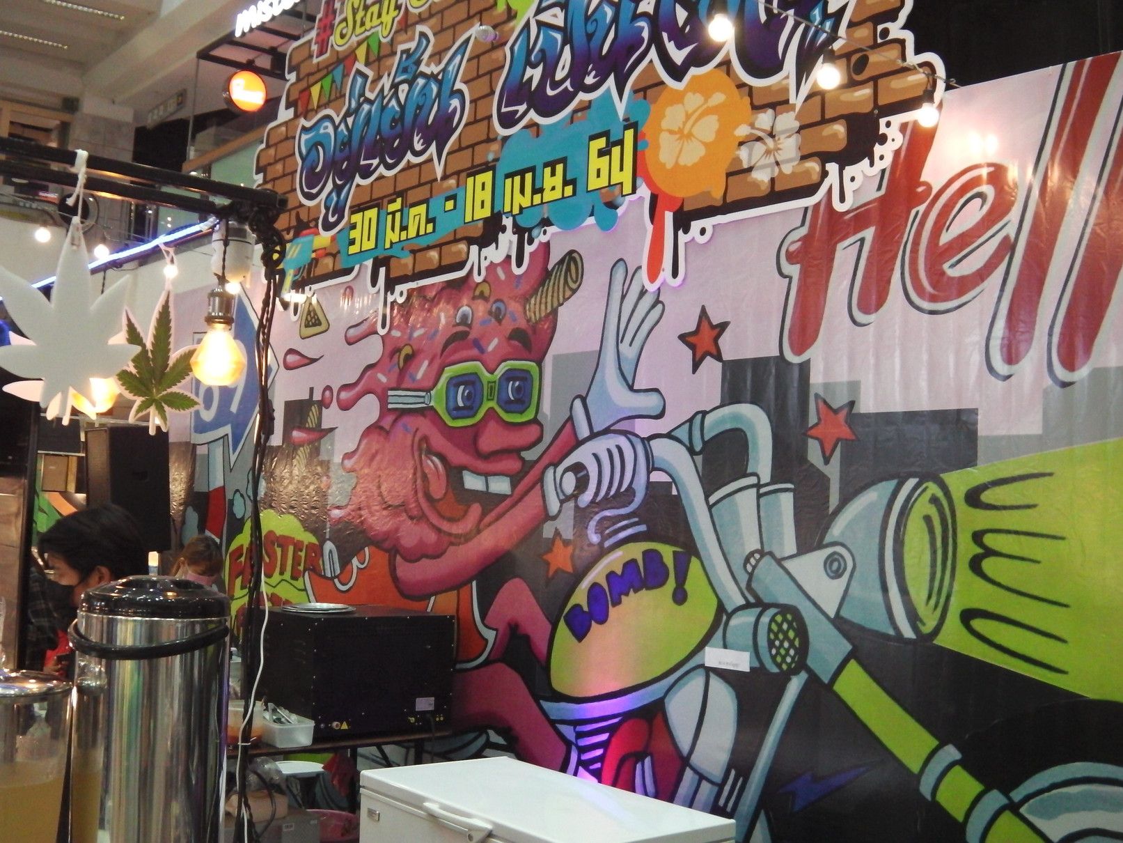 恐らく本館でも、行っているだろう予想した。 本館に入り、4階から見下ろした会場。 用事を済ませてから、会場へ向かった。 この絵は、バンコクのストリートアートでは、よく見かけるアーティストの絵だ。 この近くには、外への出入り口もあり、そちらを眺めると、外でもアートがあるようだった。 こんなアートも。 発想が面白いですね。 全て見学したので、再び中に入り、晩飯でも買って帰る事に。 まず目に留まったのは、餅のような菓子。 非常に好物。 次は、パッタイ。 餅菓子は100バーツだったけれど、パッタイは何んと20バーツ。 これは、思ったより微糖で問題なく食べられた。 パッタイは、麺に味が染みていて非常に美味しかったです。