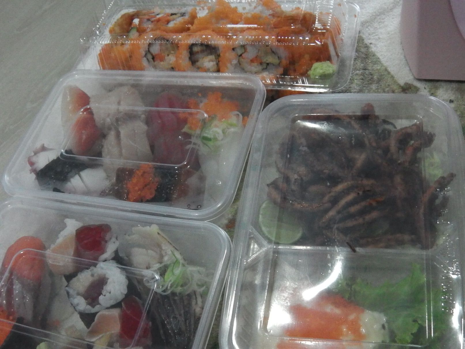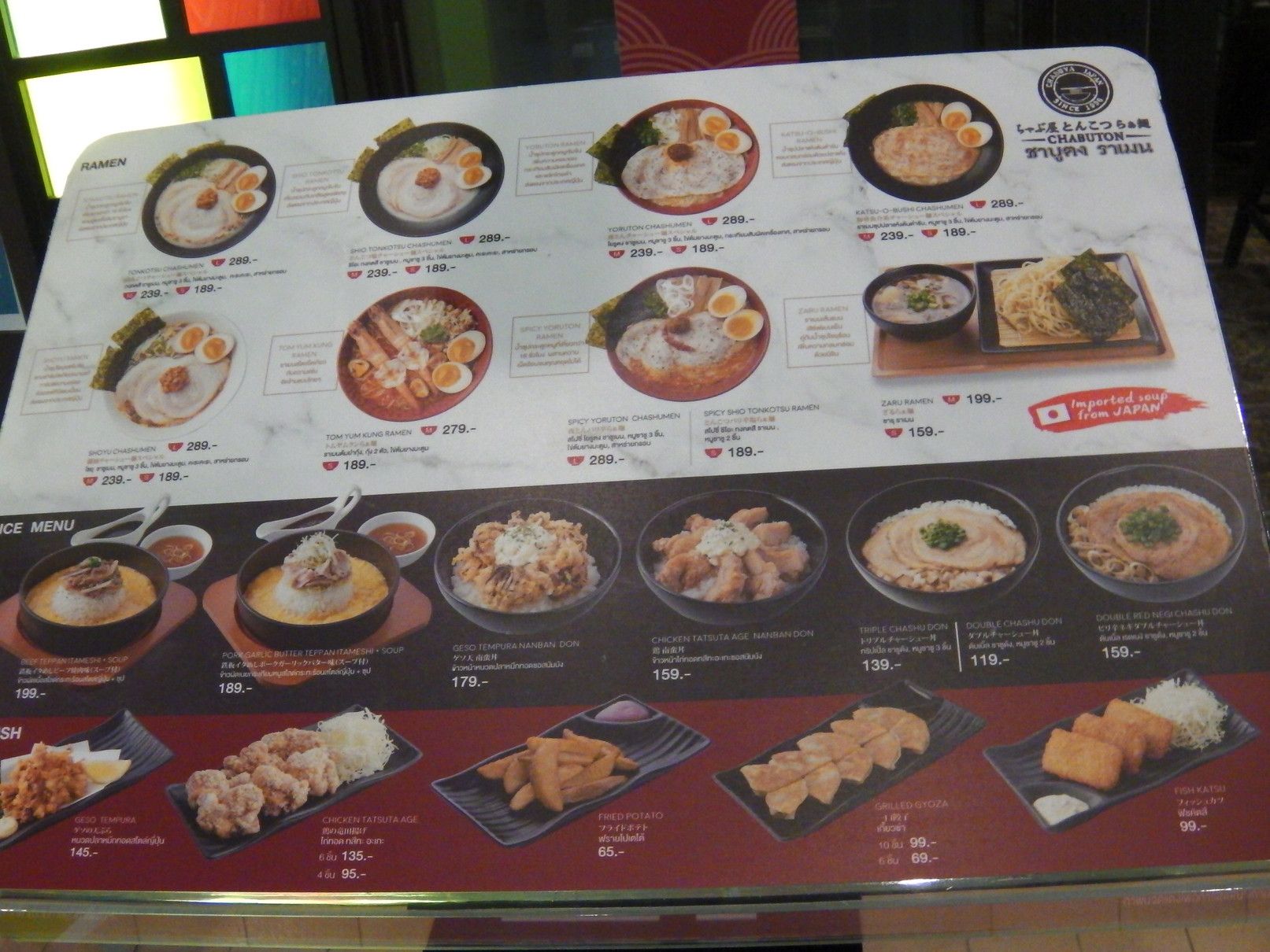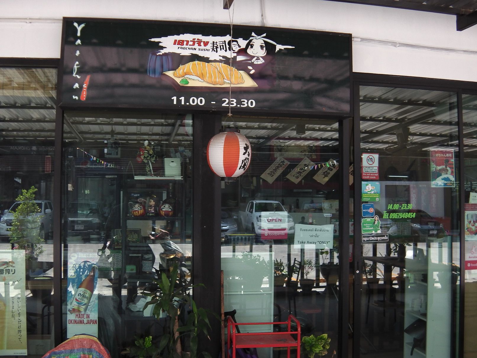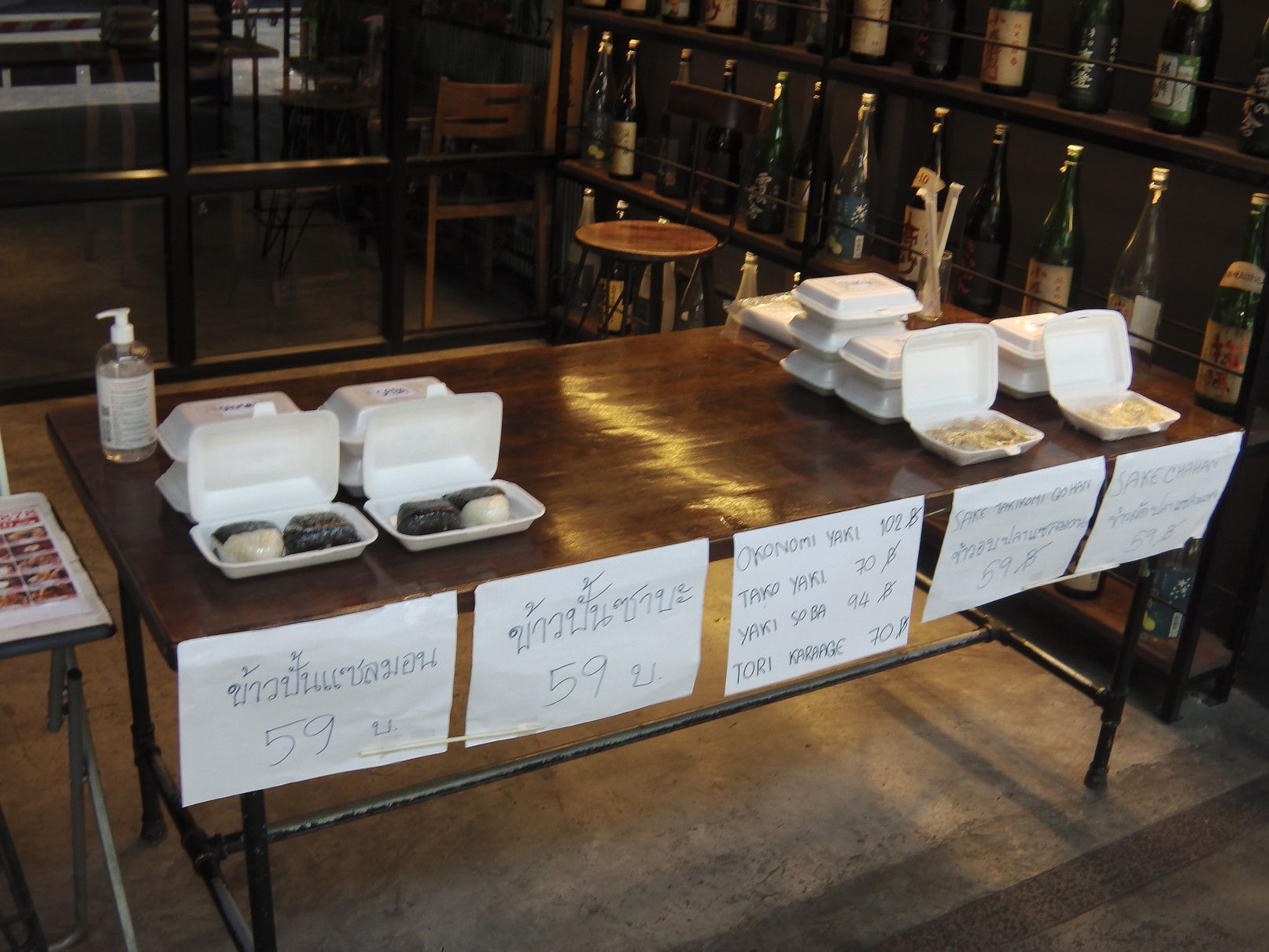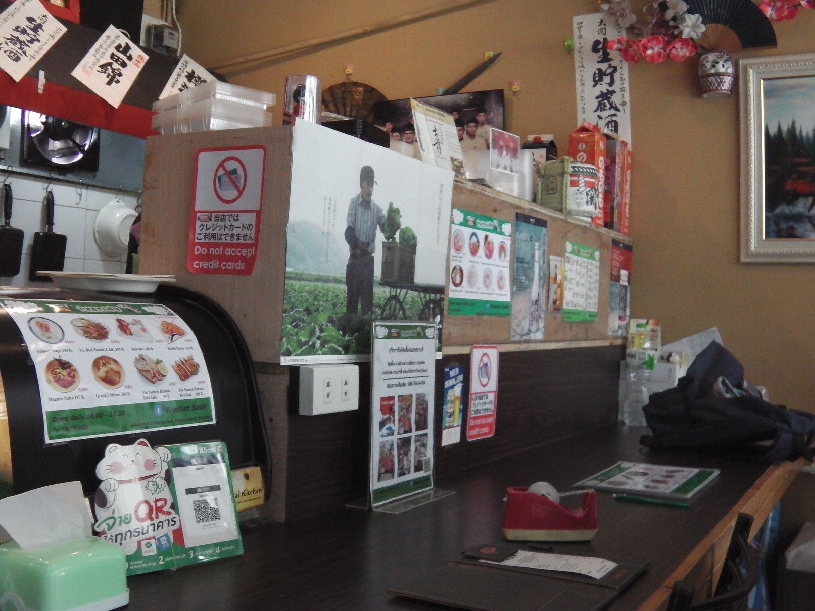 個人的には、スープがぬるい店がタイでは多く、ラーメン屋さんには中々足が向かないのが事実なのですが、テイクアウトなら確実に熱いスープで食べられるので持ち帰ってみました。 次は、居酒屋さんですが、場所柄でタイ人のお客さんが夕食を食べにくる事も多く見かけますので、メニューには焼き鳥もあれば、寿司などもあります。 最後は、タイ人が経営するお寿司屋さんです。