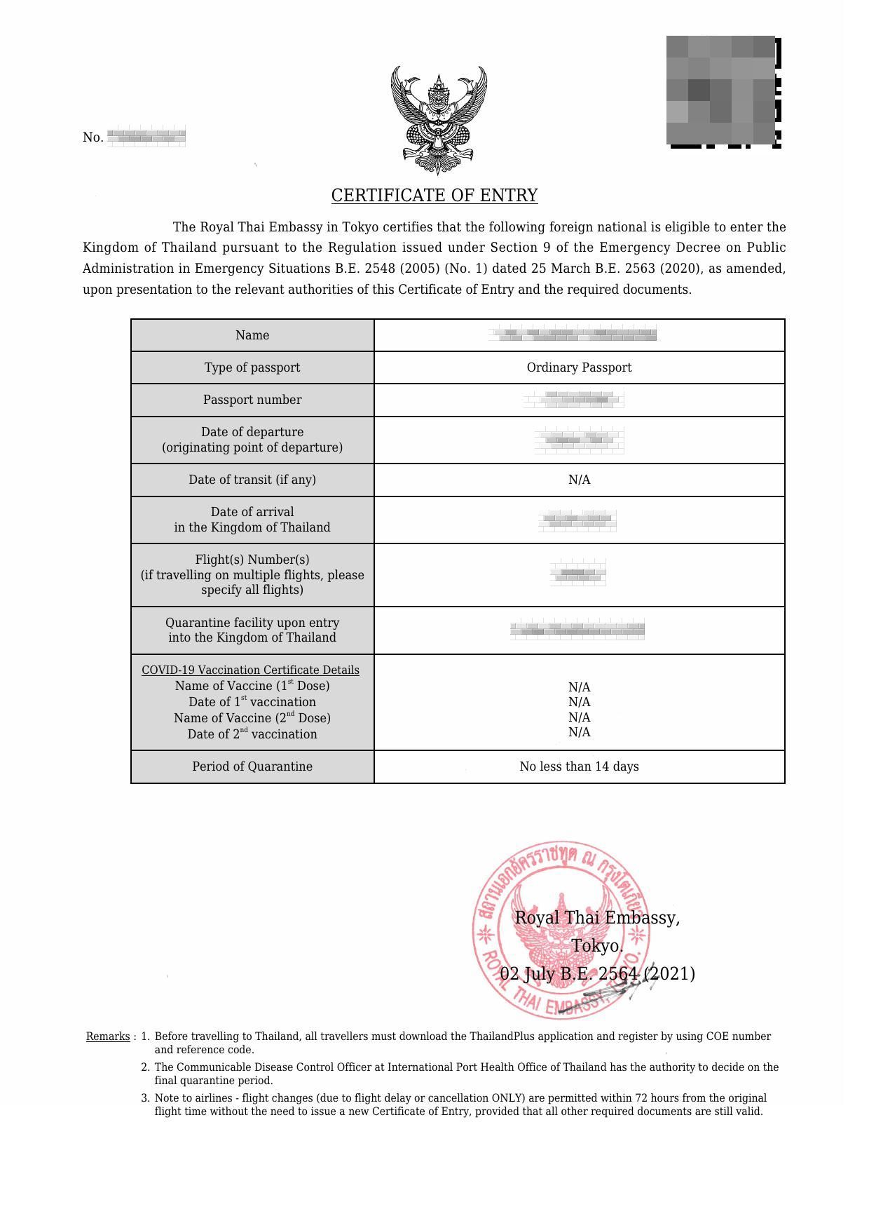 入国許可証(COE)を取得 2021年07月05日 急遽の一時帰国ですが、何とかタイの入国許可証を得る事が出来ました。 無事に故郷での用事も、済ませてからタイへ向かおうと思います。 タイ入国後は、15泊の隔離が待っていますが、後にご報告させて頂きます。 それでは、ご報告まで。ポチッと2箇所応援クリックお願いします!にほんブログ村タイランキング 「タイ」カテゴリの最新記事 「一時帰国」カテゴリの最新記事 タグ :#入国許可証 < 前の記事次の記事 > コメント コメント一覧 (2) 1. kou_63 2021年07月05日 20:02 こんにちは。 COE取得では隔離ホテルの予約書、フライト予約書、コロナ保険等 なかなか面倒だと聞いています。 後は出発前のPCR検査証明取得ですね。 自分は手続きが簡略されるまでは訪タイは延期状態が続きそうです。 0 しゅん がしました 2. しゅん 2021年07月06日 04:39 kou_63さんへ コメントを有難うございます。 初めての事ですし、各機関のレスポンスも分からない状況で日程を決めるのに悩みましたが、意外にもタイ大使館のレスポンスが速く助かりました。資料作成などもあり少しは苦労しましたが、本日で用事も全て済みますので、明日に空港へ向かいます。海外渡航用のPCR検査は、羽田空港第3ターミナルで行います。 0 しゅん がしました このブログにコメントするにはログインが必要です。 さんログアウト この記事には許可ユーザしかコメントができません。 コメントフォーム 名前 コメント 記事の評価 リセット リセット 顔 星 情報を記憶 コメントを投稿する