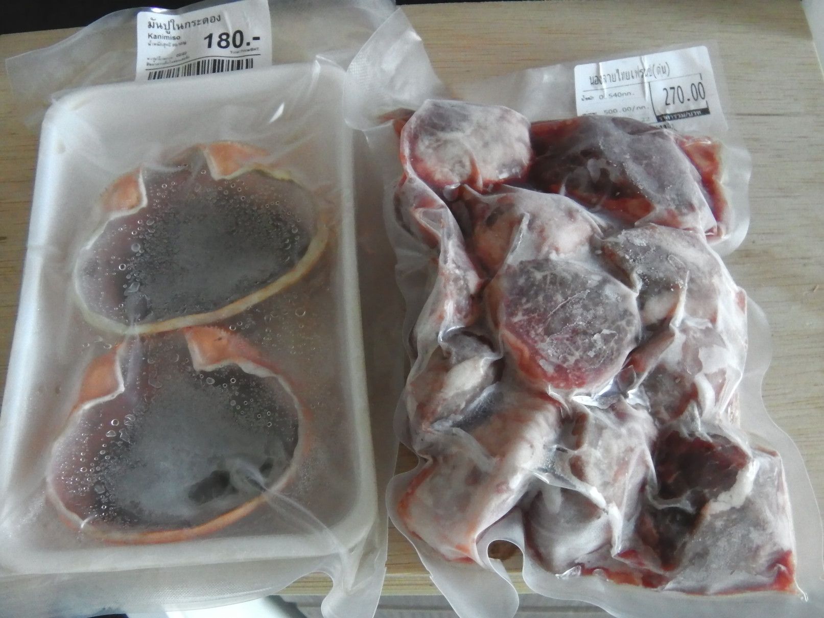 オートーコー市場へ 2021年10月11日 先日は。。。 MRTに乗車しオートーコー市場へ。 3番出口を出ると、そこは目の前が市場の入り口。 それ程に広い市場ではないが、通路は広いし店が密集している事も無く、個人的には好きな市場。 入り口には管理人が居て検温と手のアルコール消毒の後に入場。 売り場としては、野菜や海鮮や乾物もあり、服屋さんもフードコートもある市場。 そして、牛肉を売っている店も、数軒並んでいる。 一通り見て回って、この店に興味を持った。 今回は、焼肉用ではなく、角煮用の牛肉探し。 店員さんに角煮の写真を見せると、それに近い商品を示してくれた。 その後は、ブラブラ。 美味しそうな、パイナップルを見つけたので購入。 結果は、肉屋さんでは驚く事に、蟹味噌も売っていたので、肉と共に購入。 今後、食べるのが楽しみ。 パイナップルは、早速食べてみました。 完熟ですね。 甘く柔らかく、美味かったです!ポチッと2箇所応援クリックお願いします!にほんブログ村タイランキング 「チャトチャック」カテゴリの最新記事 「タイ生活」カテゴリの最新記事 タグ :#オートーコー市場#牛肉#パイナップル < 前の記事次の記事 > コメント このブログにコメントするにはログインが必要です。 さんログアウト この記事には許可ユーザしかコメントができません。 コメントフォーム 名前 コメント 記事の評価 リセット リセット 顔 星 情報を記憶 コメントを投稿する