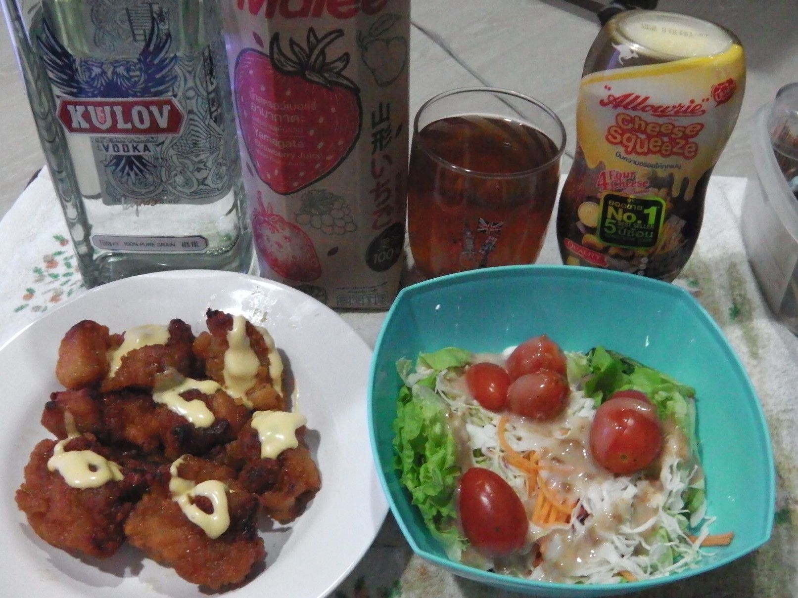 山形いちごにしては安かった。 唐揚げには、チーズソースを掛けるのが最近の好み。 まずは1口飲んでみると、甘さは控えめだったのでOK。 唐揚げは、恐らくレモン汁に浸ったもののようで、非常にジューシーな美味しさで大満足。