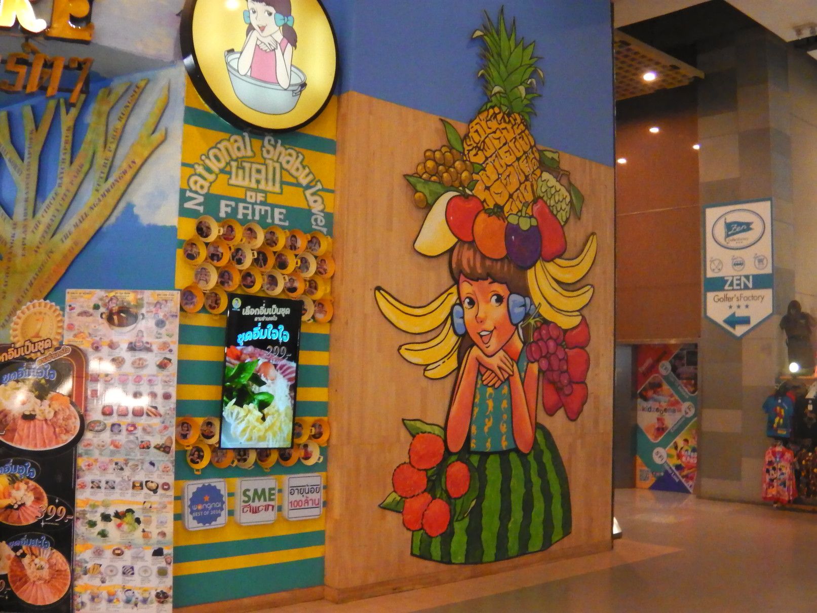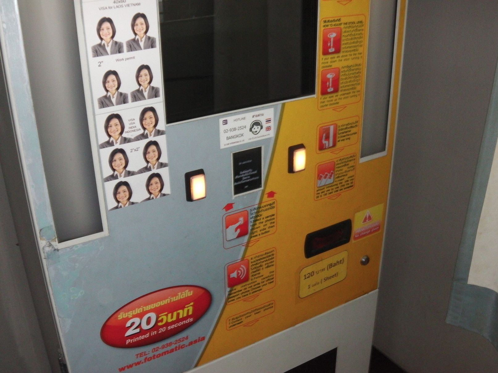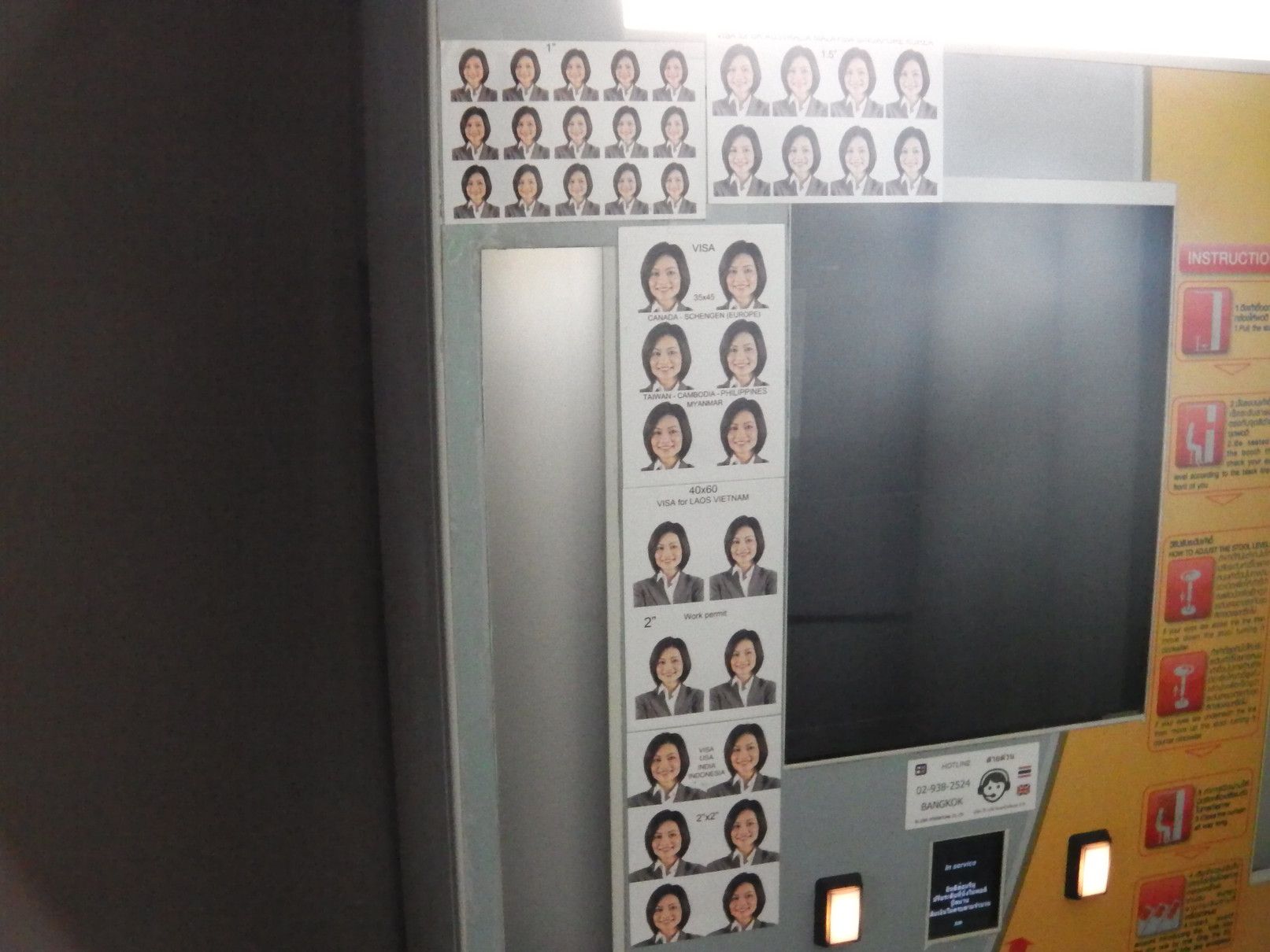 場所は、入り口を入って、斜め左手奥のトイレ入り口の手前。 この絵を目指して行けばすぐ近く。 奥が撮影機。 手順は、右下の札の挿入口から、100バーツ札1枚と20バーツ札1枚を挿入。