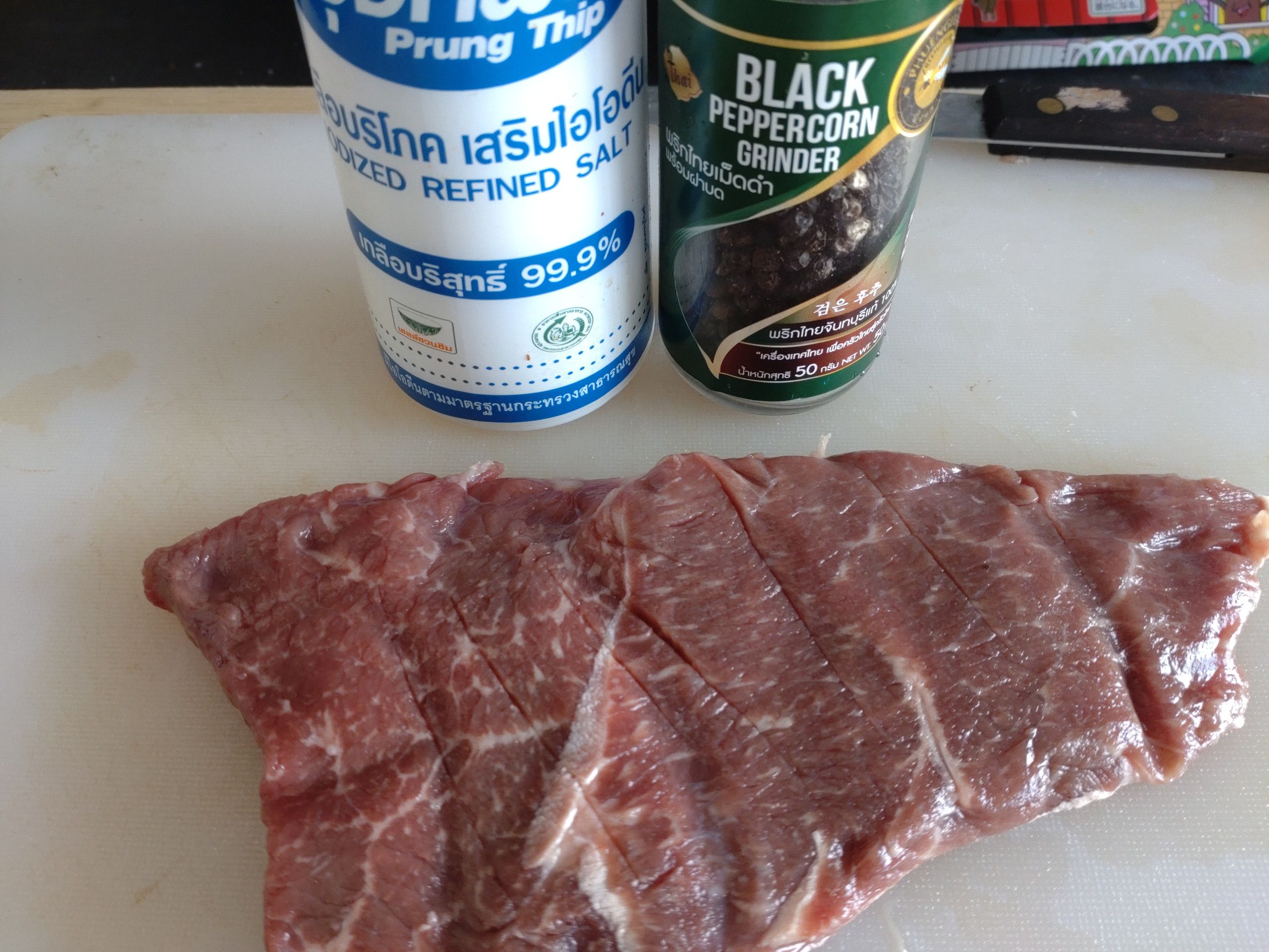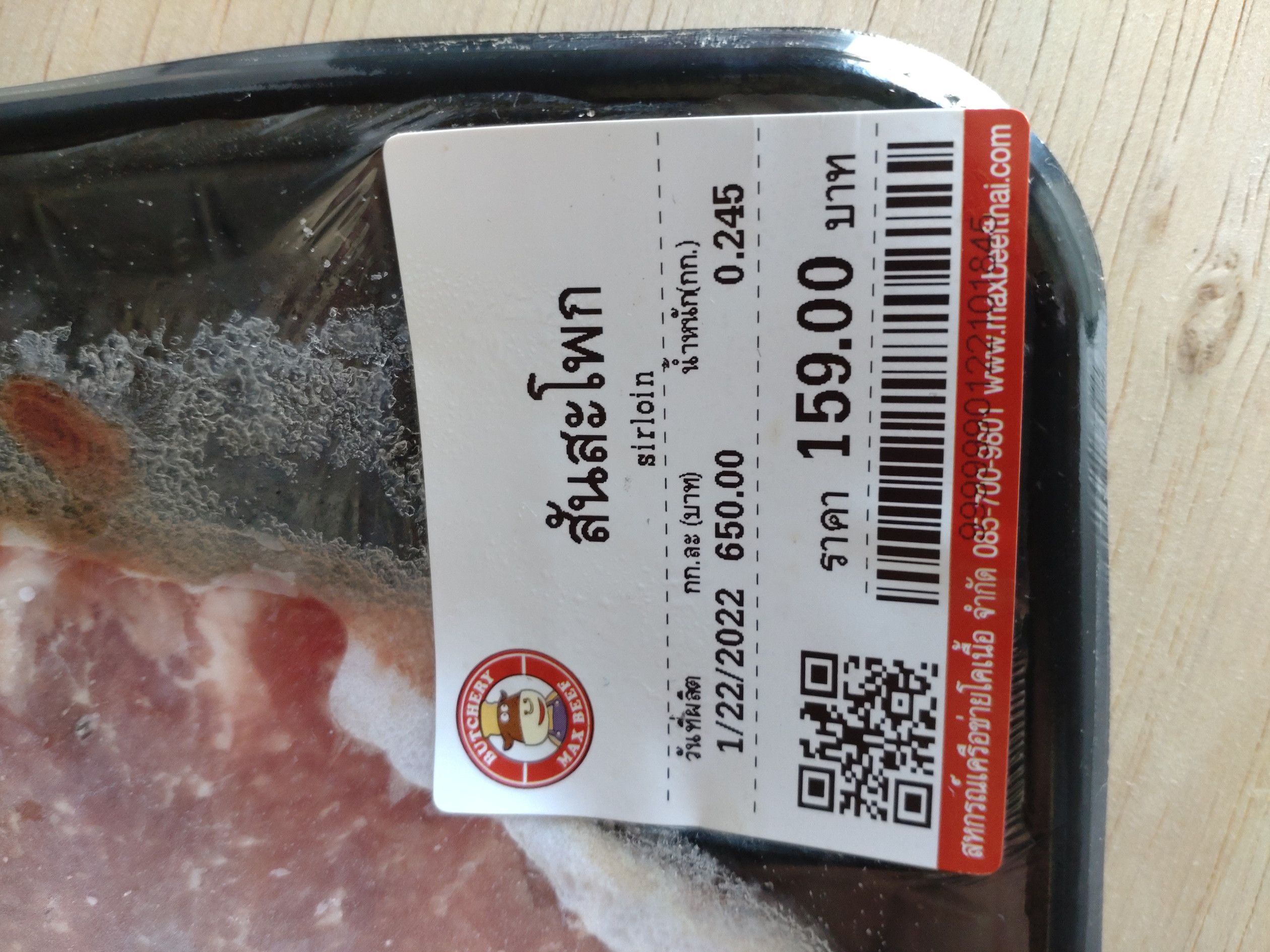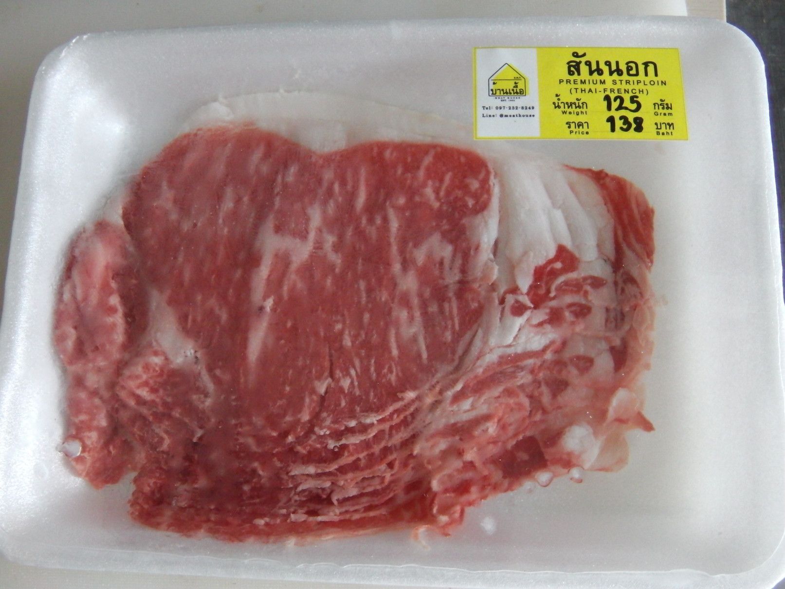 冷凍保存されている中から、美味しそうな物をチョイス。 それを、今まで冷凍保存していたのだけれど、食べる事にした。 価格は、サーロインが245gで159バーツ。