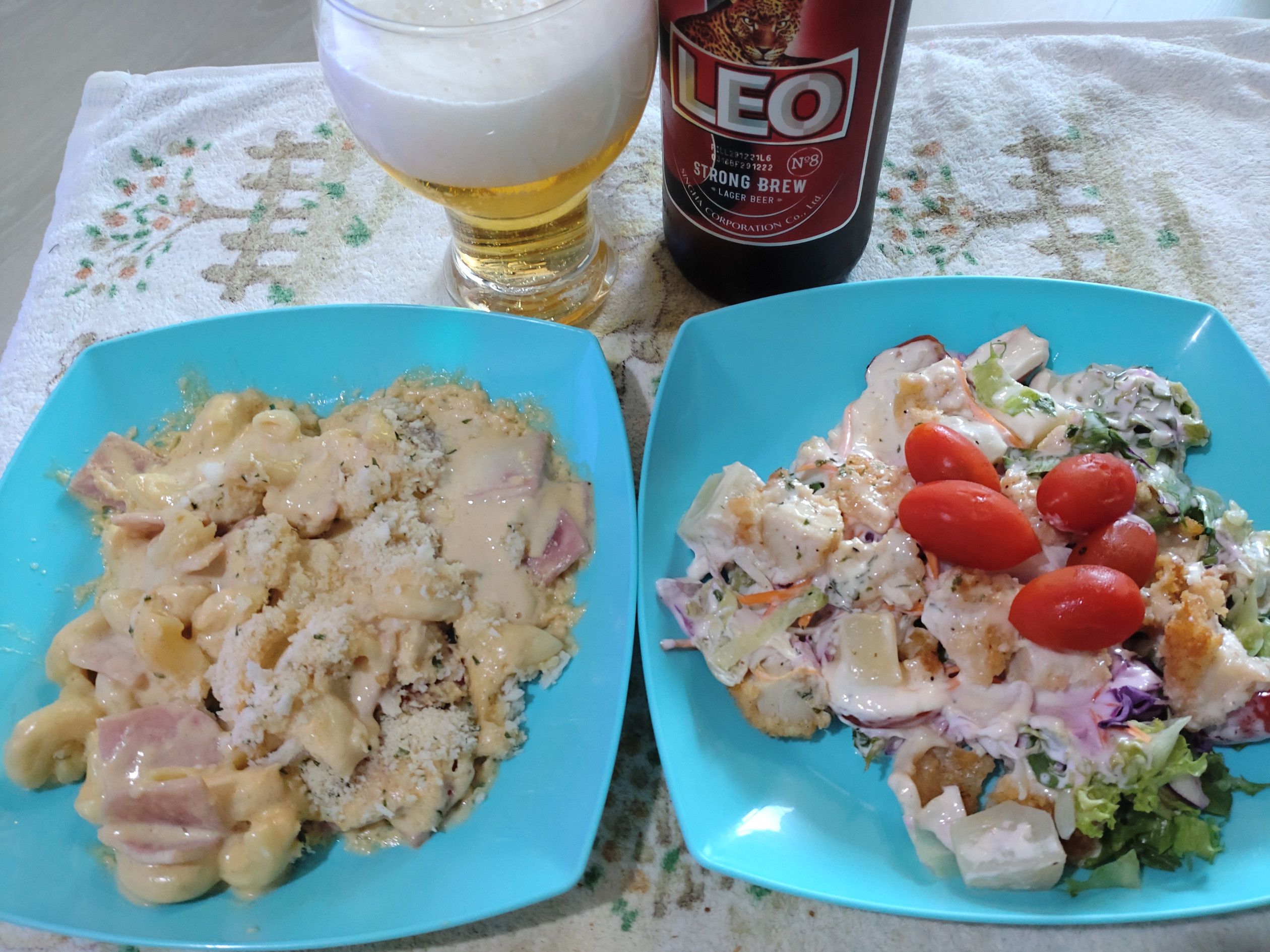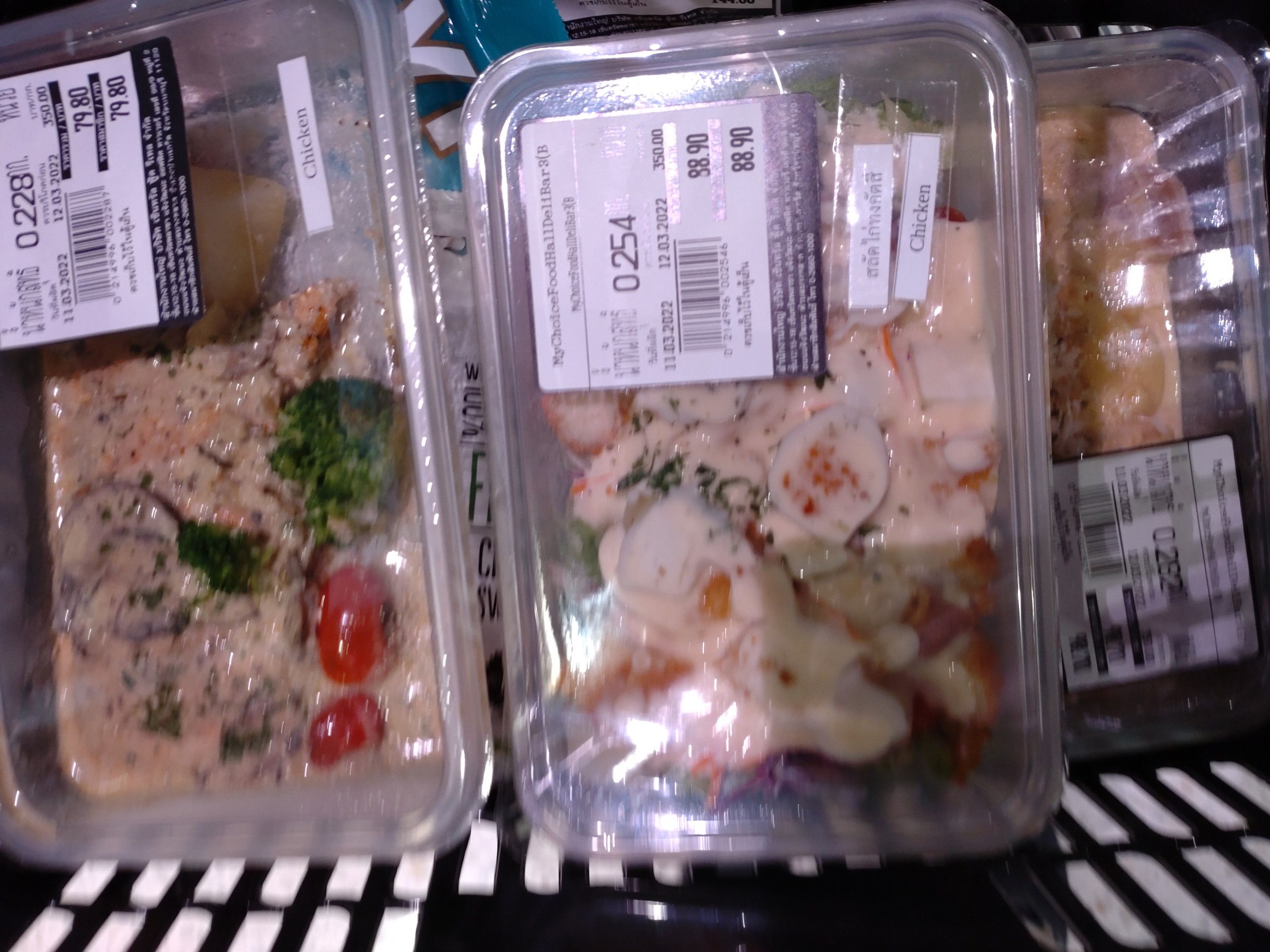 「博多あまから」「さぬきひめ」などの品名でした。 自身は、この惣菜コーナーが以前から好きなのです。 綺麗にパッケージされているのは衛生面で嬉しいです。 寿司の種類も多いし、酒コーナーでは日本酒も御覧の通り。 幾つかの食料を購入しました。 晩飯に食べてみます。 左側は、鶏肉フライ入りのサラダ、右側は、クリームとチーズ満載のマカロニグラタン??っぽいやつです。品名不明。 マカロニチーズ食べてビールを飲むと最高でした。