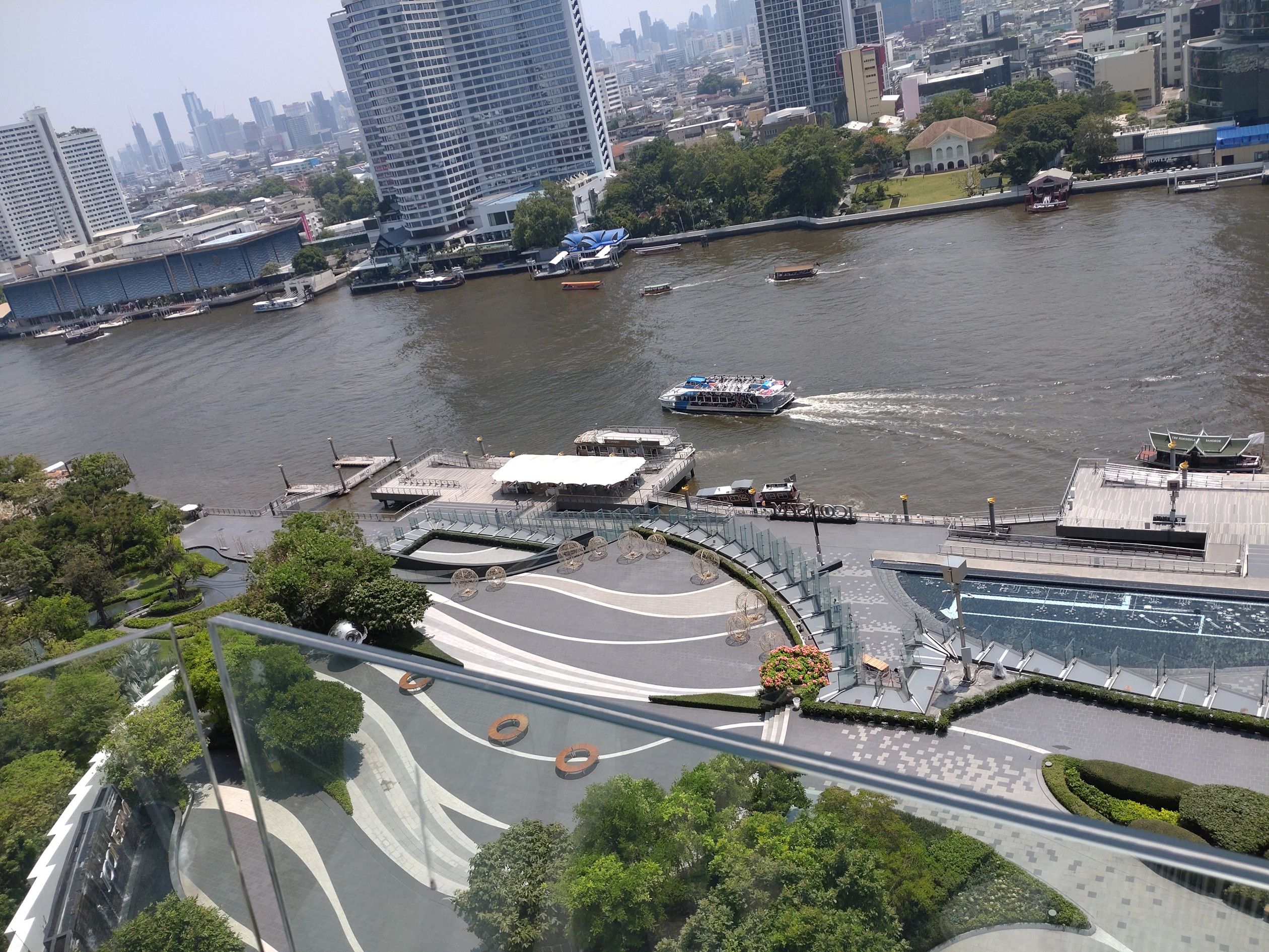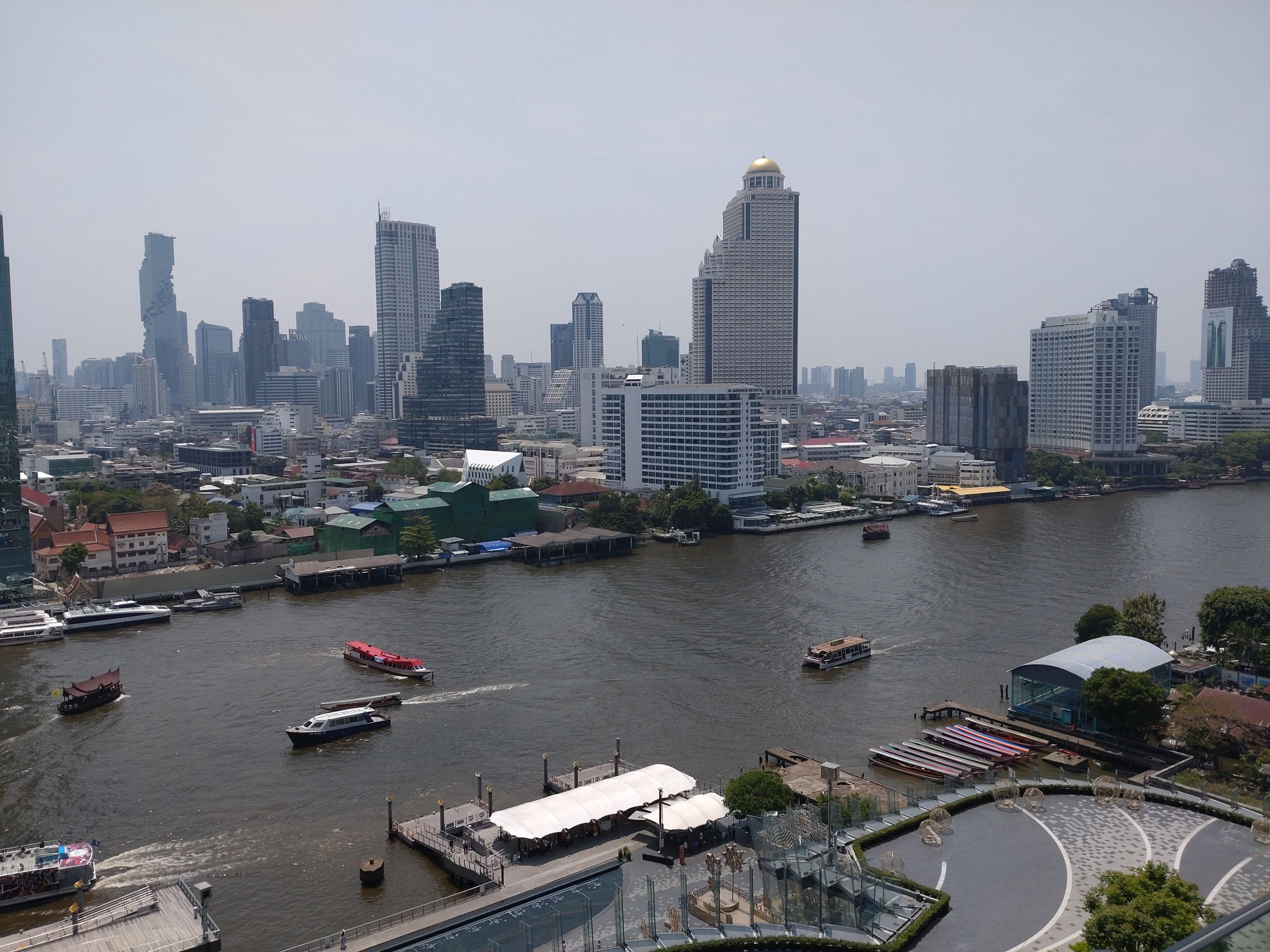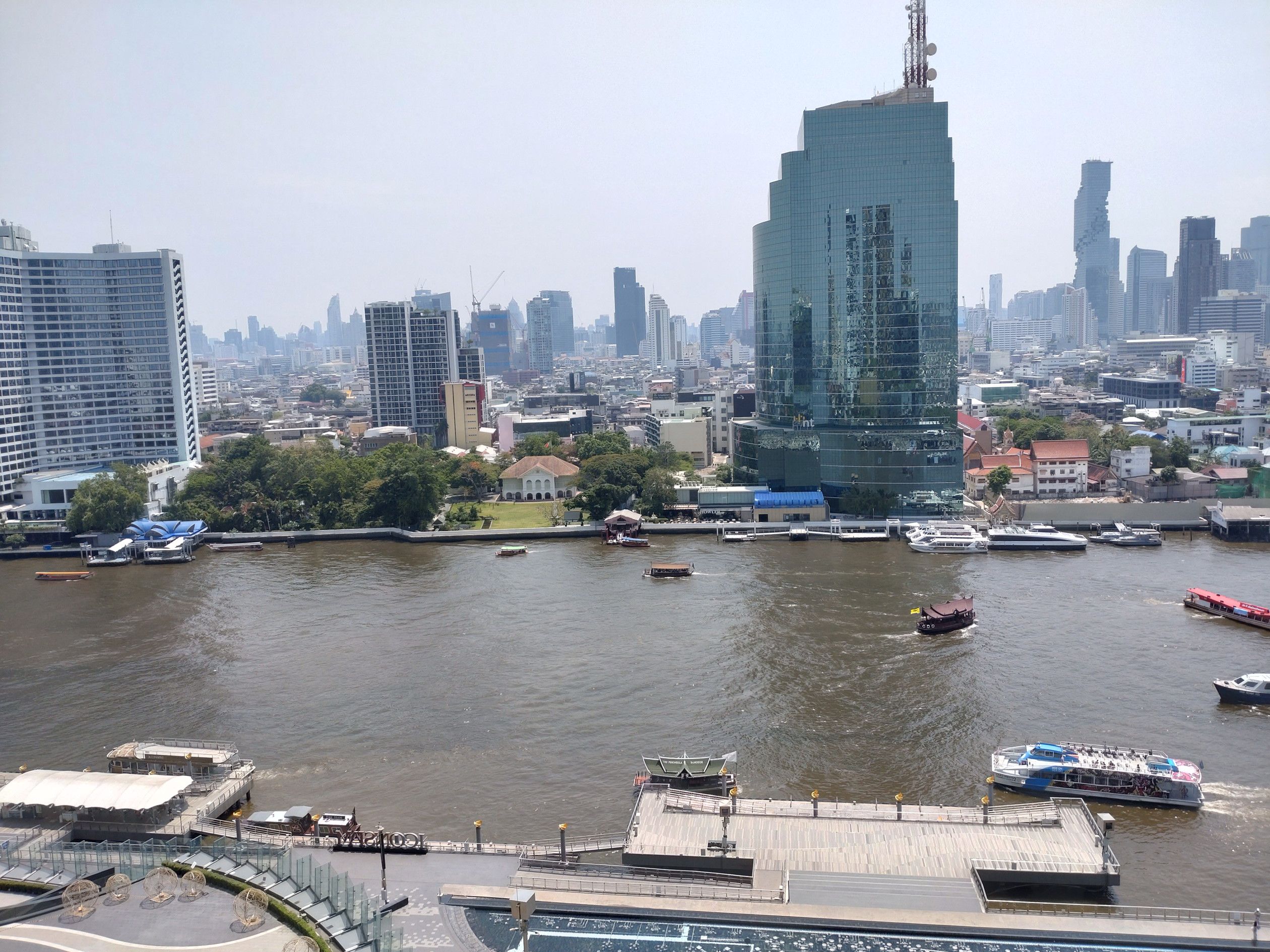 最近は、アイコンサイアムへ来ると、此処のテラス席で景色を観ながらの珈琲がお気に入りです。 この時は、室内の席は3割ほど埋まってたでしょうか。 そして、自身はコーヒーと共にテラス席へ。 何と、私だけ。 この日は、快晴なのですが、空気はPM2.5の影響なのか?スカッとしていません。 こうして景色を観ると、前回来た時と全く違う点があります。 船の往来が非常に増えているのです。