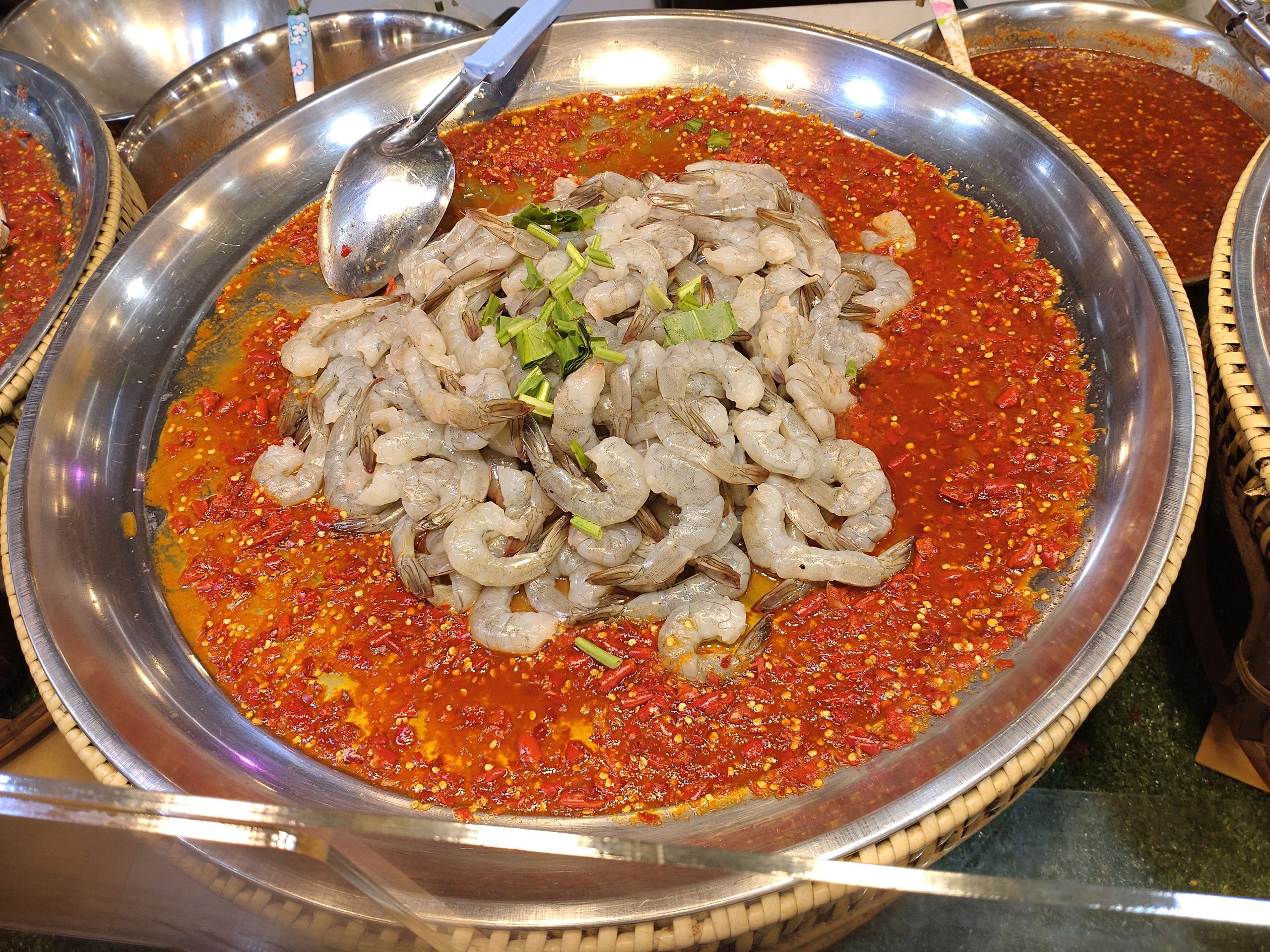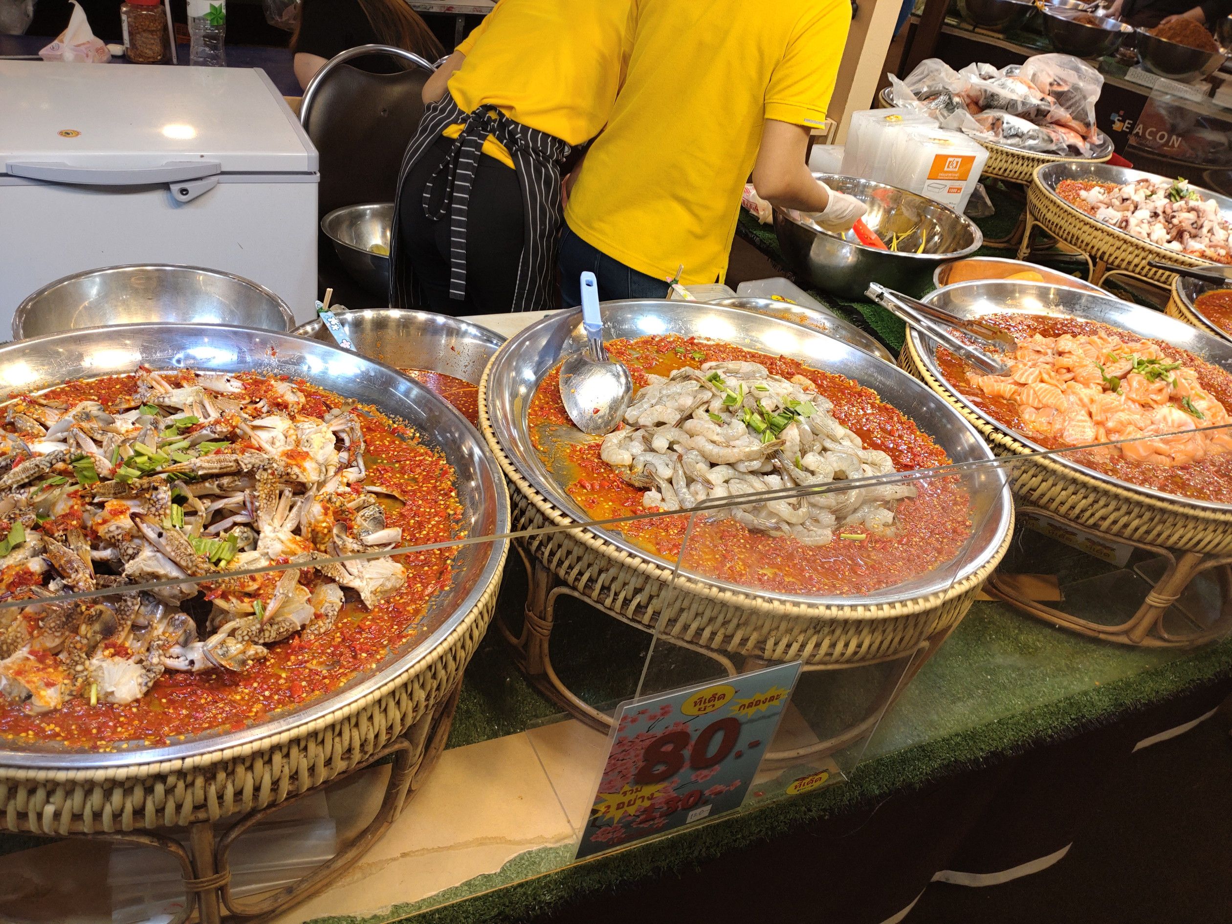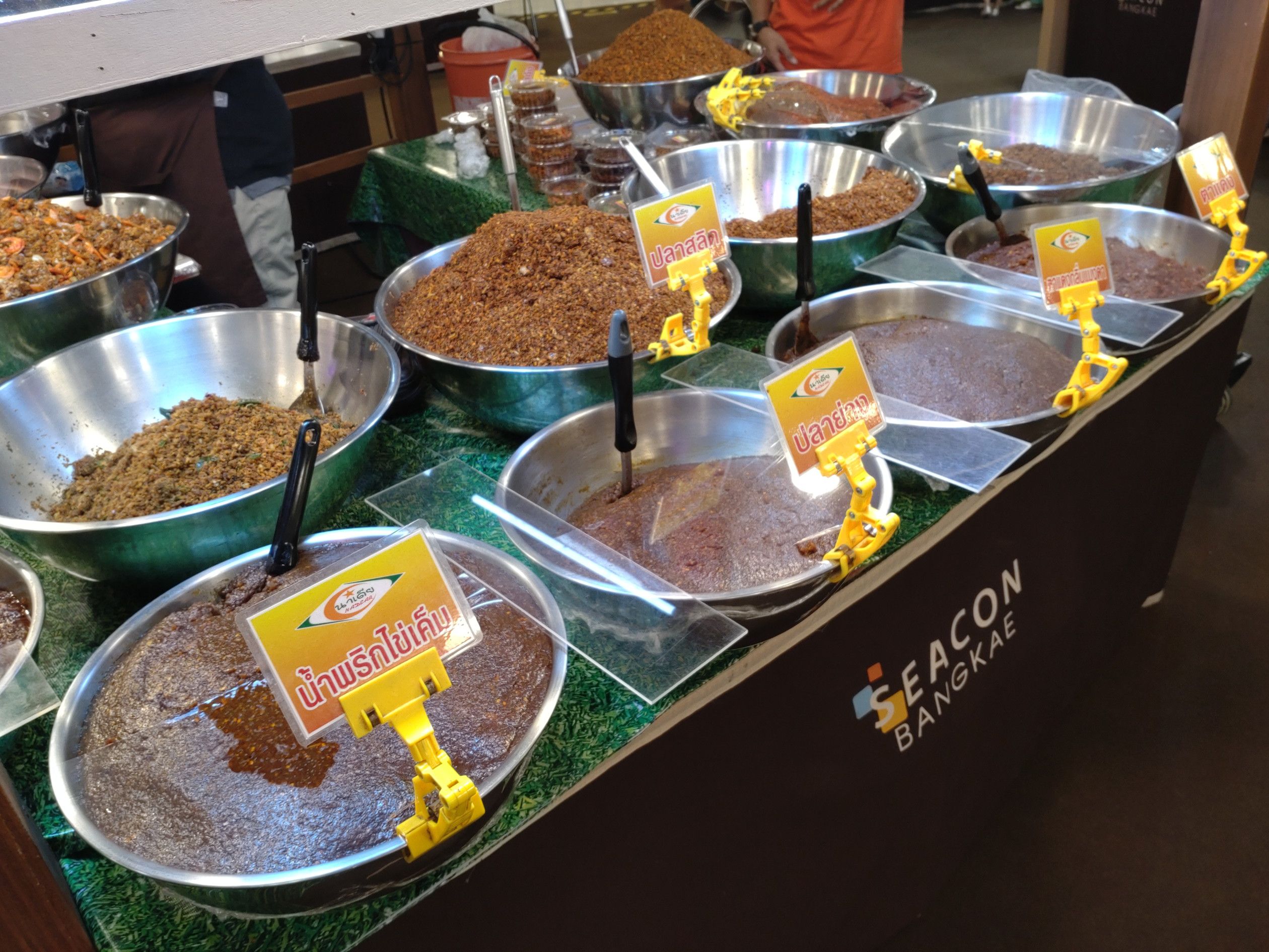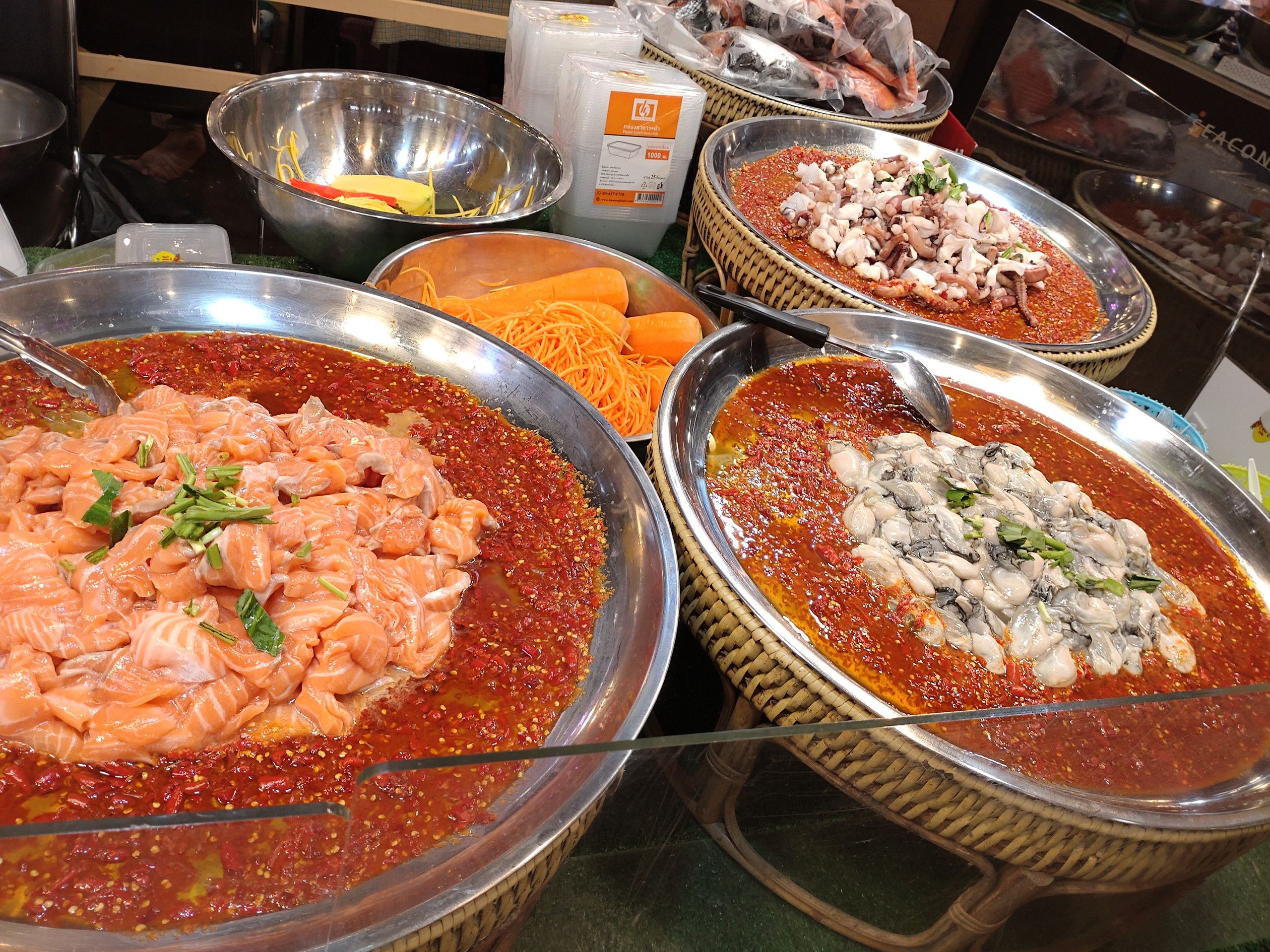 シーコン バンケーは。。。 食料探しメインでやって来た自身には、本当に楽しい場所でした。 フードコートを含めて、食料品店が集まる場所は多くありました。 そして今回は、催し会場にも足を運んでみました。 やはり、近くにあれだけコンドーが建ち並んでいれば、食料の需要も高いんでしょうね。 ただ、感じたのは寿司などの日本食は少なかったですね。 そんな事も、見ていて楽しくはありました。 価格も安いんです。 こんなカレー料理も食べたかったのですが、今回は食べた事が無い料理を買ってみようと考えてました。 そして目に留まったのは、このコーナーでした。 辛そうですよね。。。 思い切って、生海老を選択しました。 1パックで、80バーツ。 海老は、10匹くらい入ってました。 初めての挑戦です。 中にはニンジンの千切りが入っていて、一緒に食べましたが、ナンプラーの味が美味しく、激辛でしたが美味しかったです。