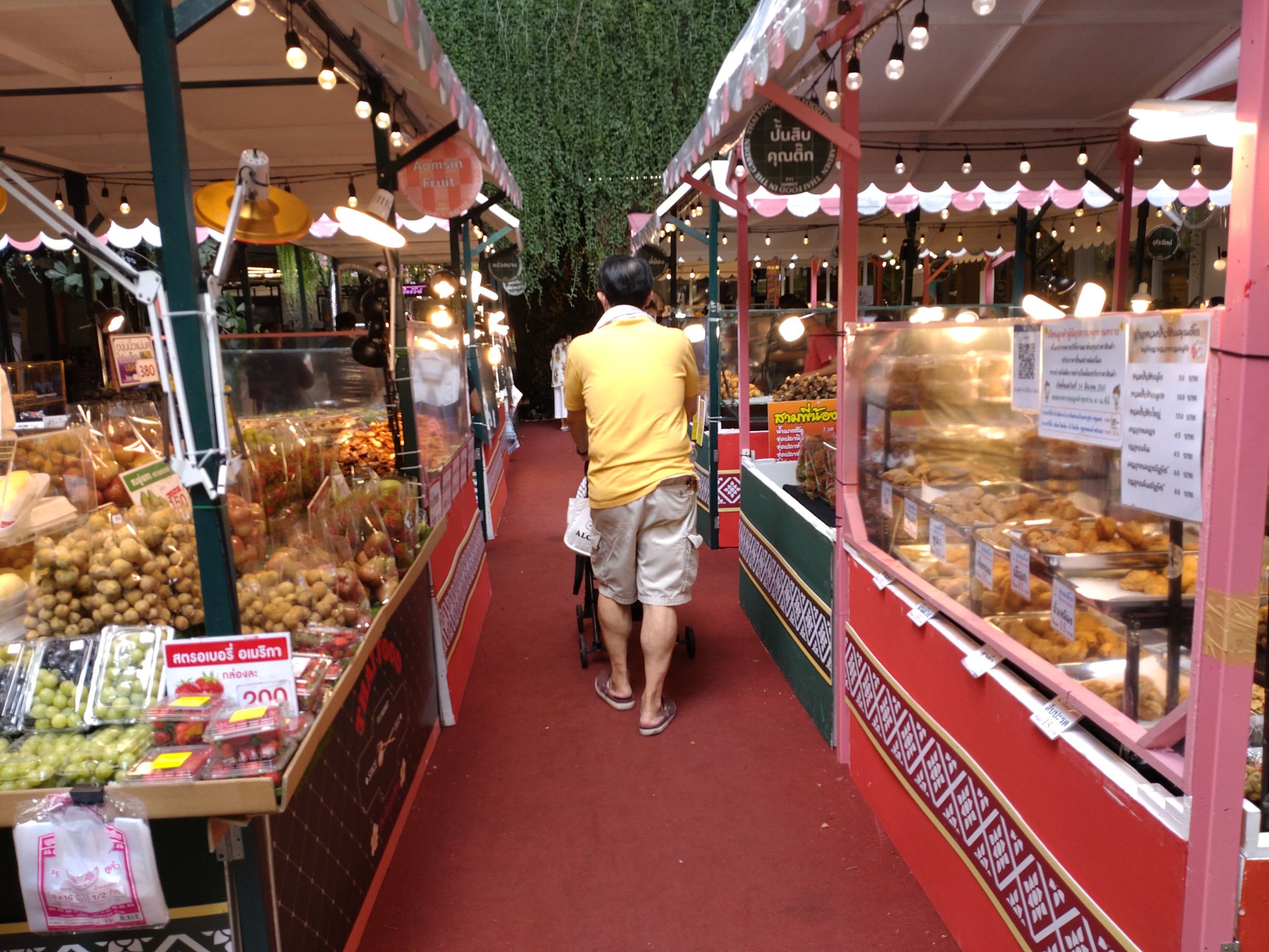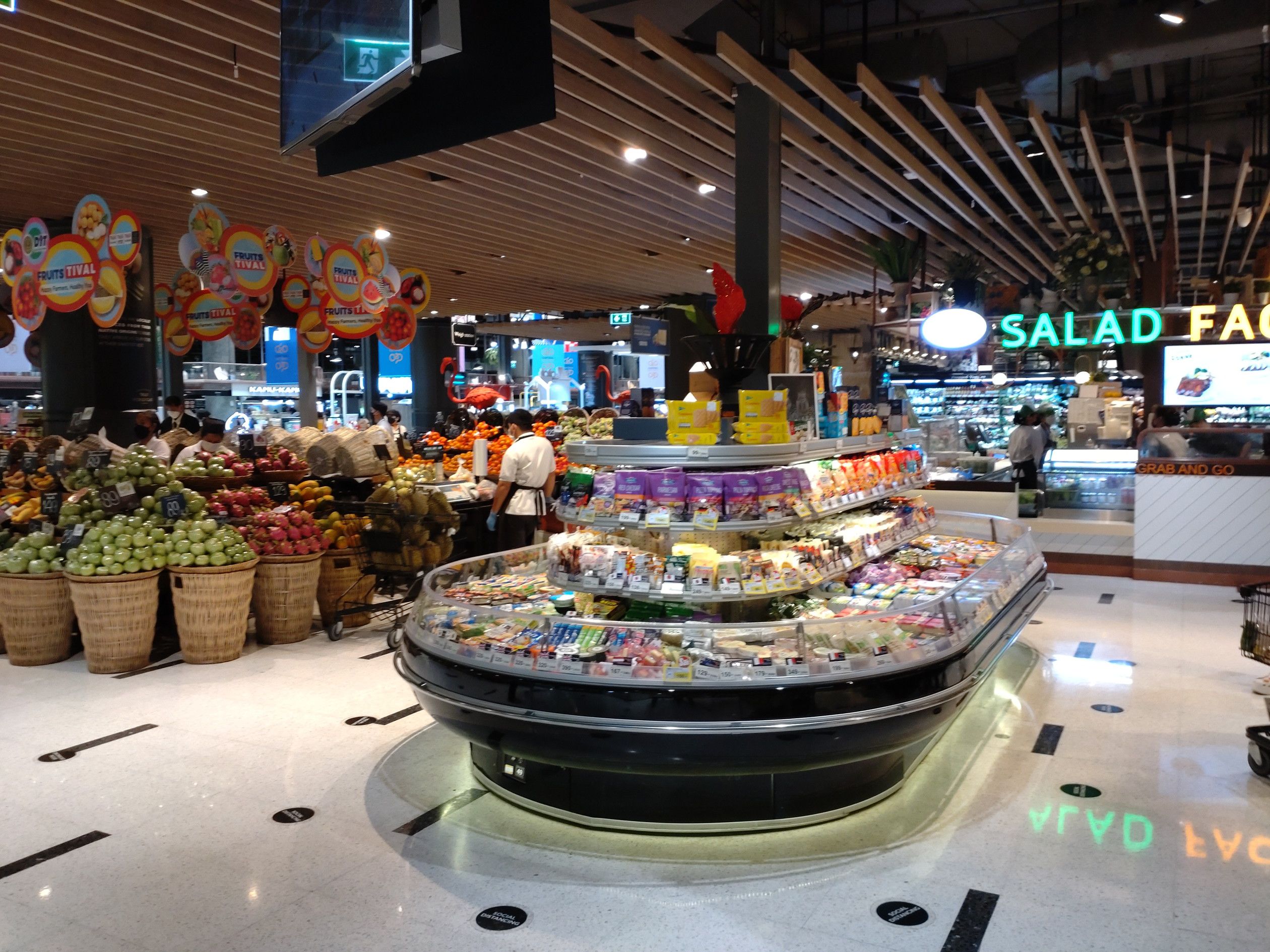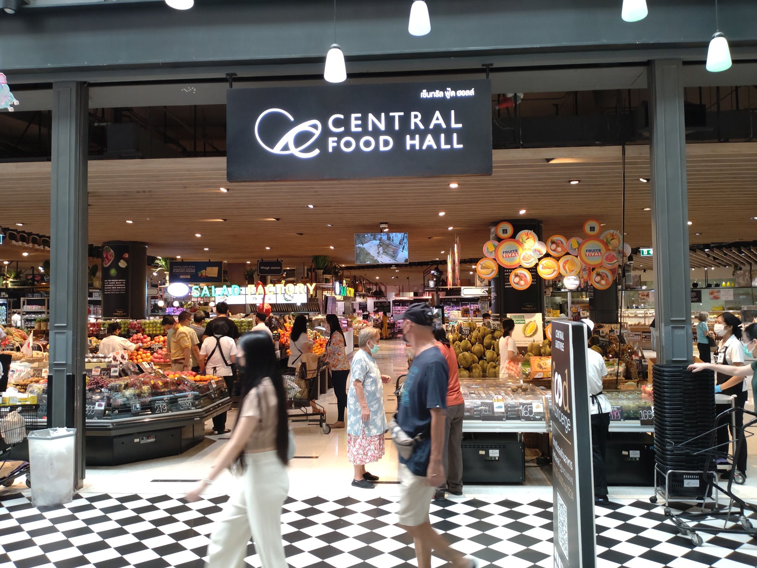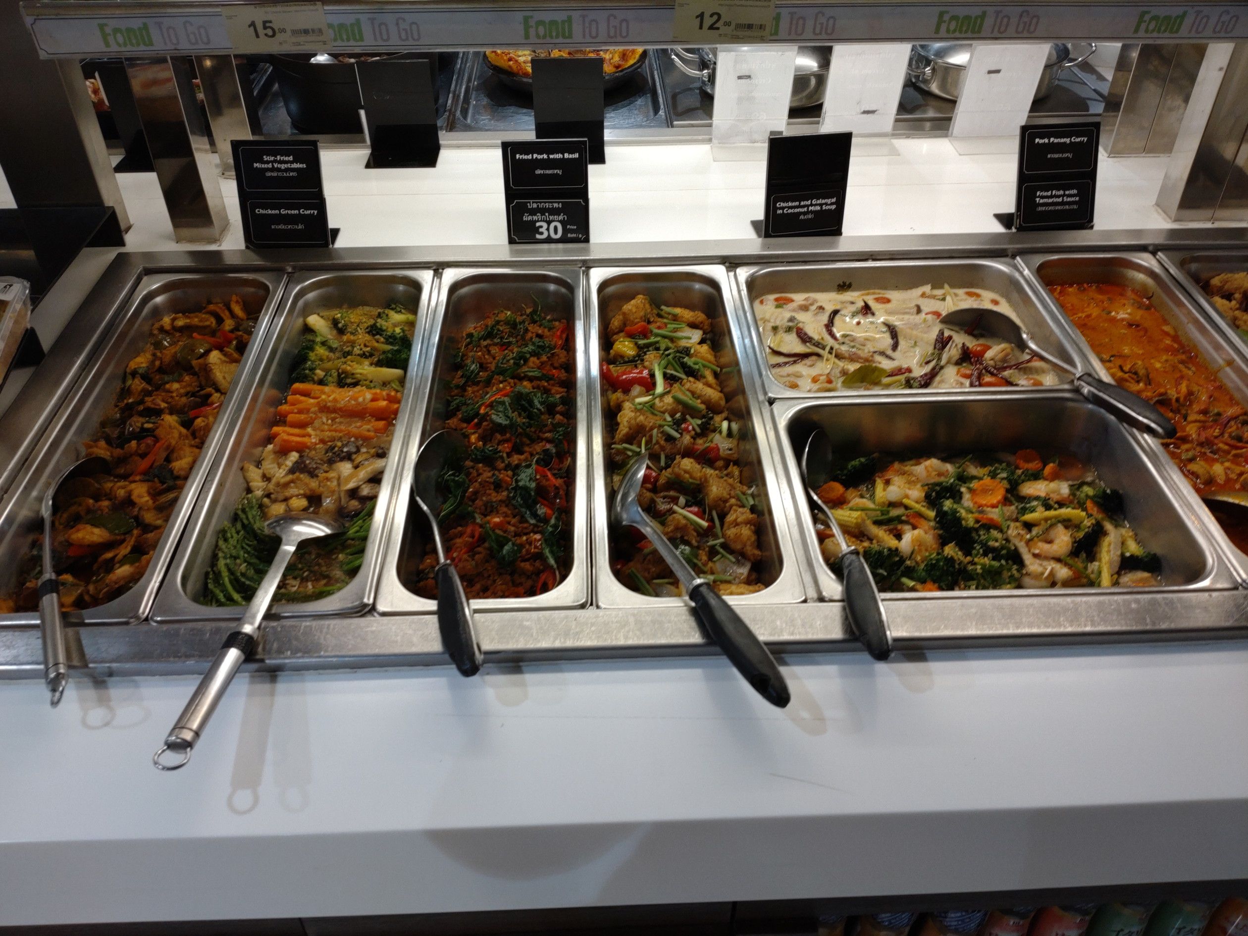 緑が豊富なセントラルフェスティバル・イーストヴィルの店内を気分良く散歩した後は。。。 食料を買って帰ろうと考えました。 広場の中にある出店を見学しても揚げ物が多く断念。 従って、少し離れたフードホールへ向かいました。 行くまでの通路の雰囲気はこんな感じでした。 せて、どんな惣菜が売っているやら。。。 店内を歩くと、総菜コーナーを発見。 うわー!どれも美味しそうです。 レストラン並みですね。 野菜の他に、これに決めました。 何と、アメリカンミートローフですよ。