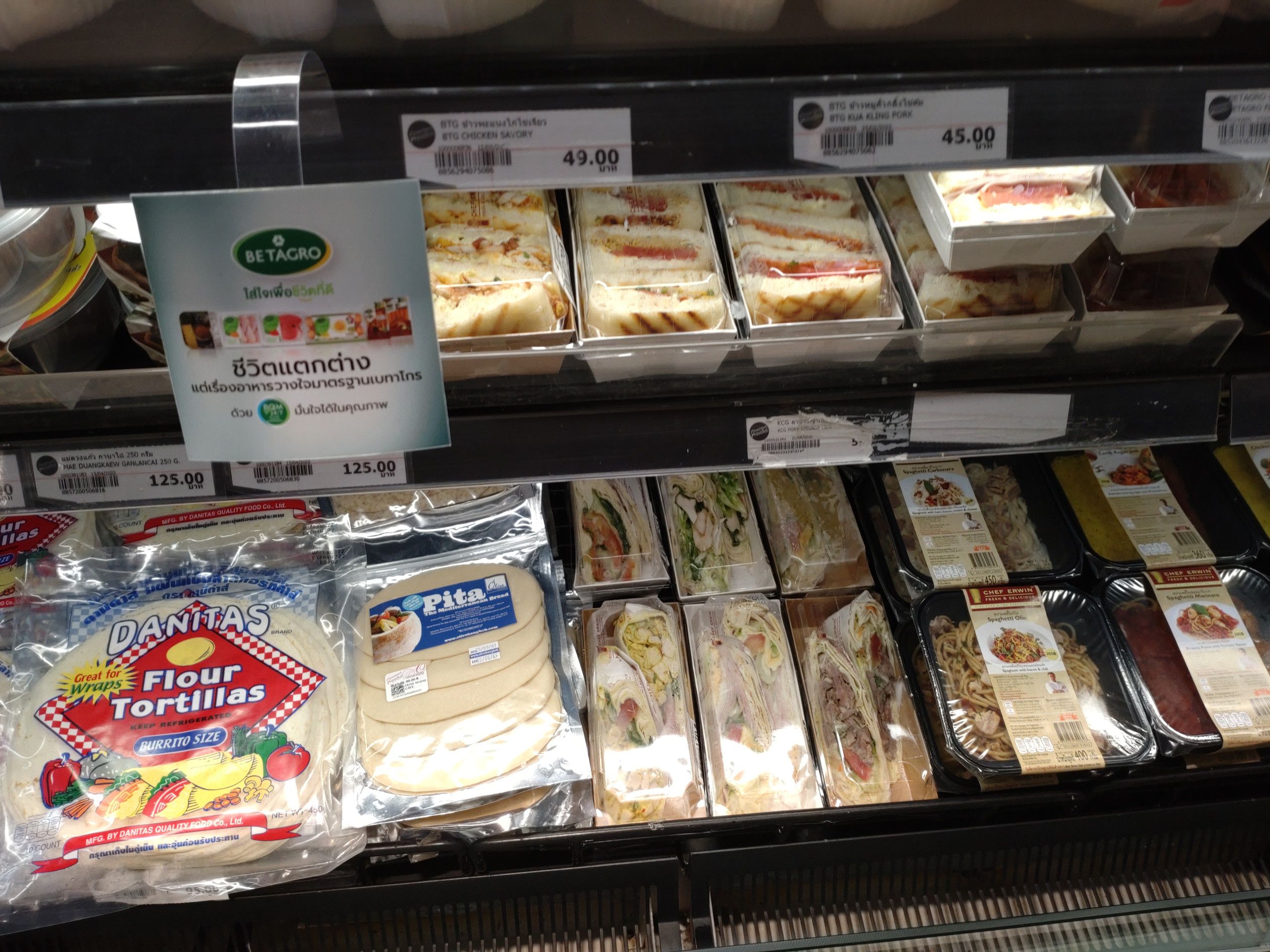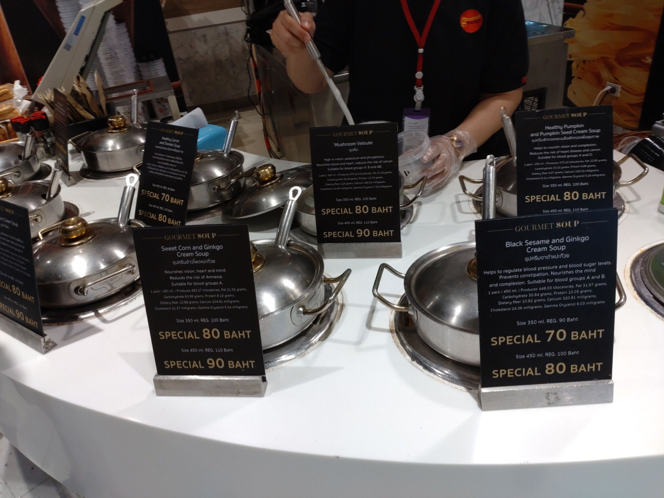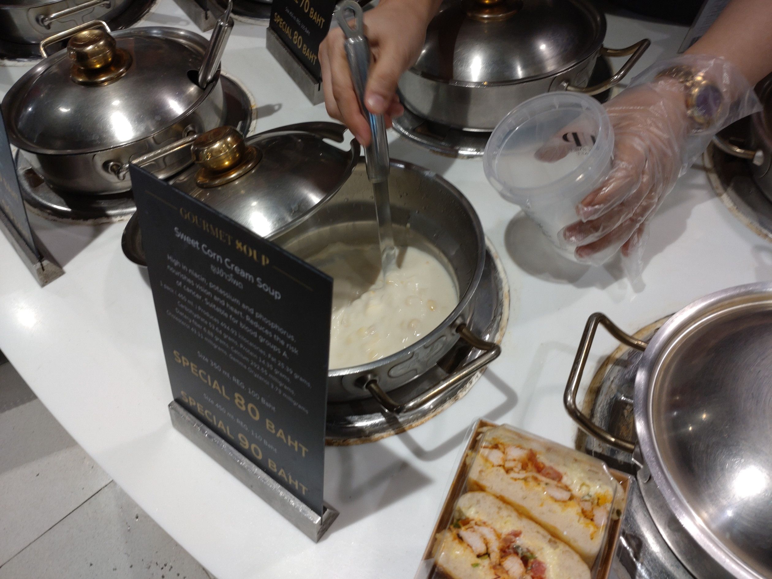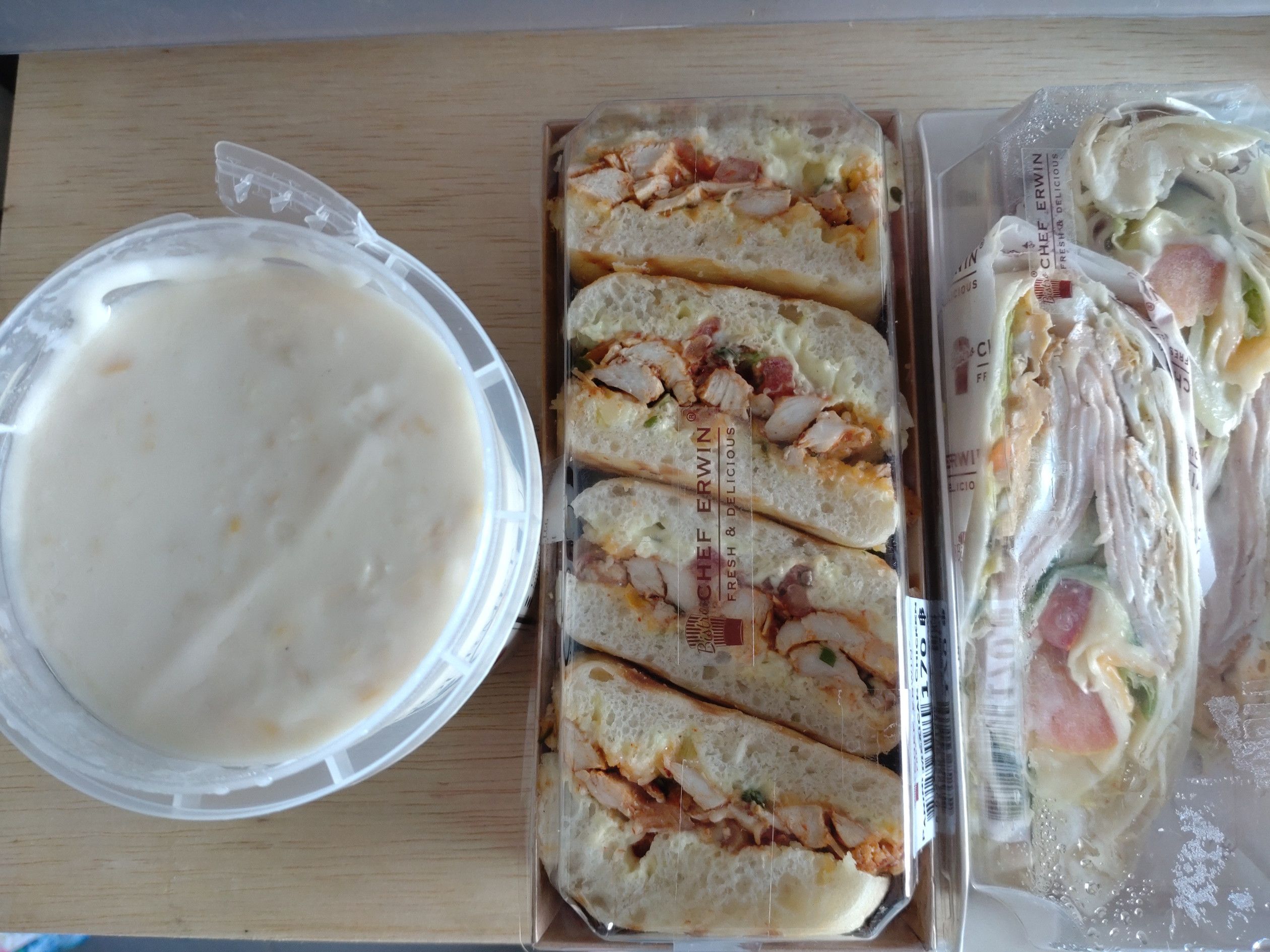 平日にもかかわらず、凄い人出。 諦めてブラブラ散歩。 所々に、閉鎖となった店舗が目立ちました。 フートコートは満席でも、その他の場所はイマイチな感じでした。 そして、帰り際に食料品売り場へ。 どんな物があるか一通り見て回り、目に留まったのは、このコーナーでした。 美味しそうな、サンドウィッチが売っていたんです。 コンビニ以外で、サンドウィッチを買うのは、いつ以来でしょうか? そして、スープも買う事にしました。 コーンクリームスープが好きなんです。 そして、会計を済ませました。 結構なボリュームがありました。 熱々にしたスープを飲みましたが、意外にドロドロしていて美味しかったです。 これは、ハムとチーズと野菜。 これは、ソーセージでしたが、パンがフアフアで美味しかったです。