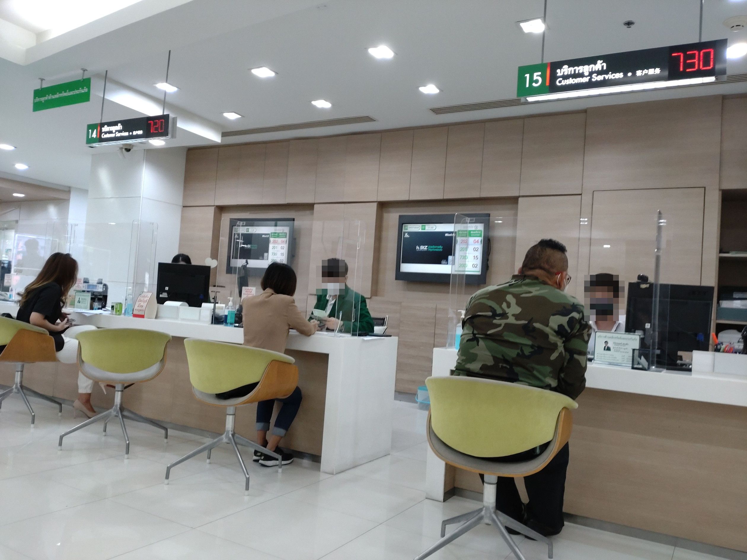 との事でした。 なので、再びカシコン銀行へ。 通帳と、新旧のパスポートを持参。 そして、カスタマーサポートの順番待ちで着席するも、何と1時間待ち。