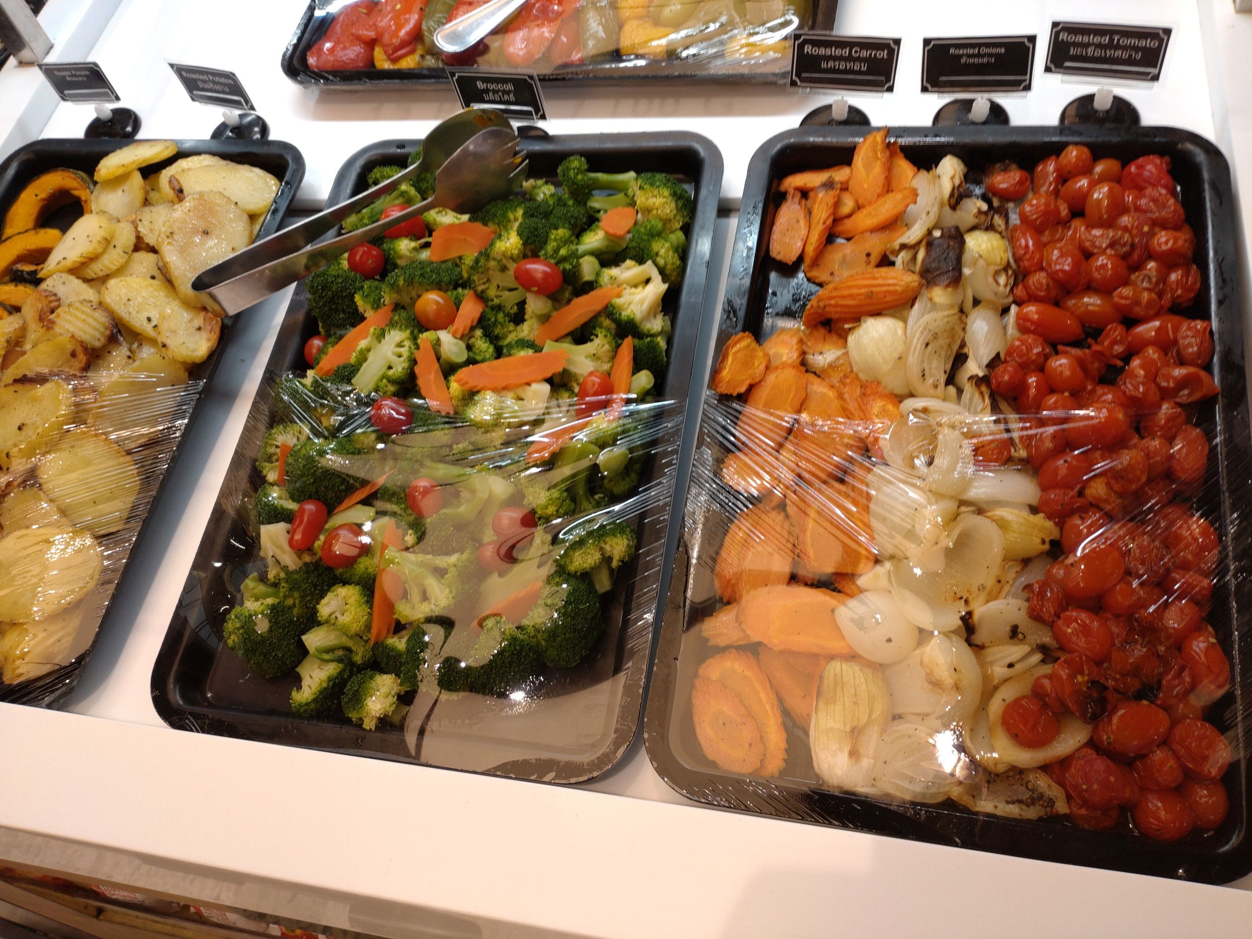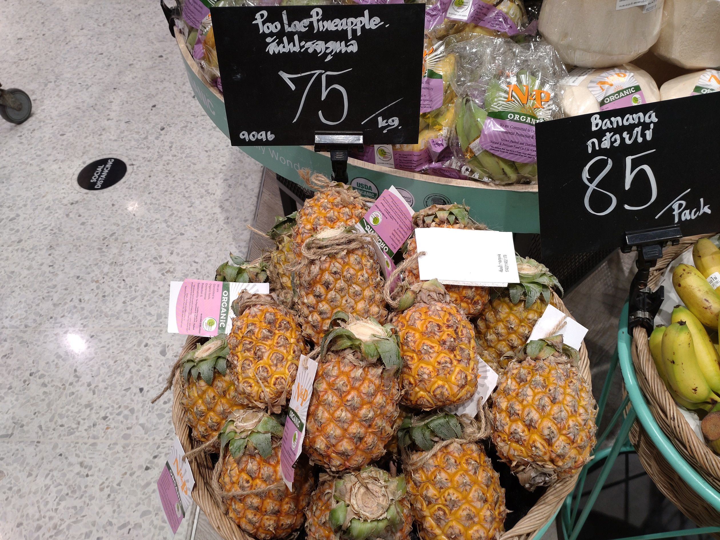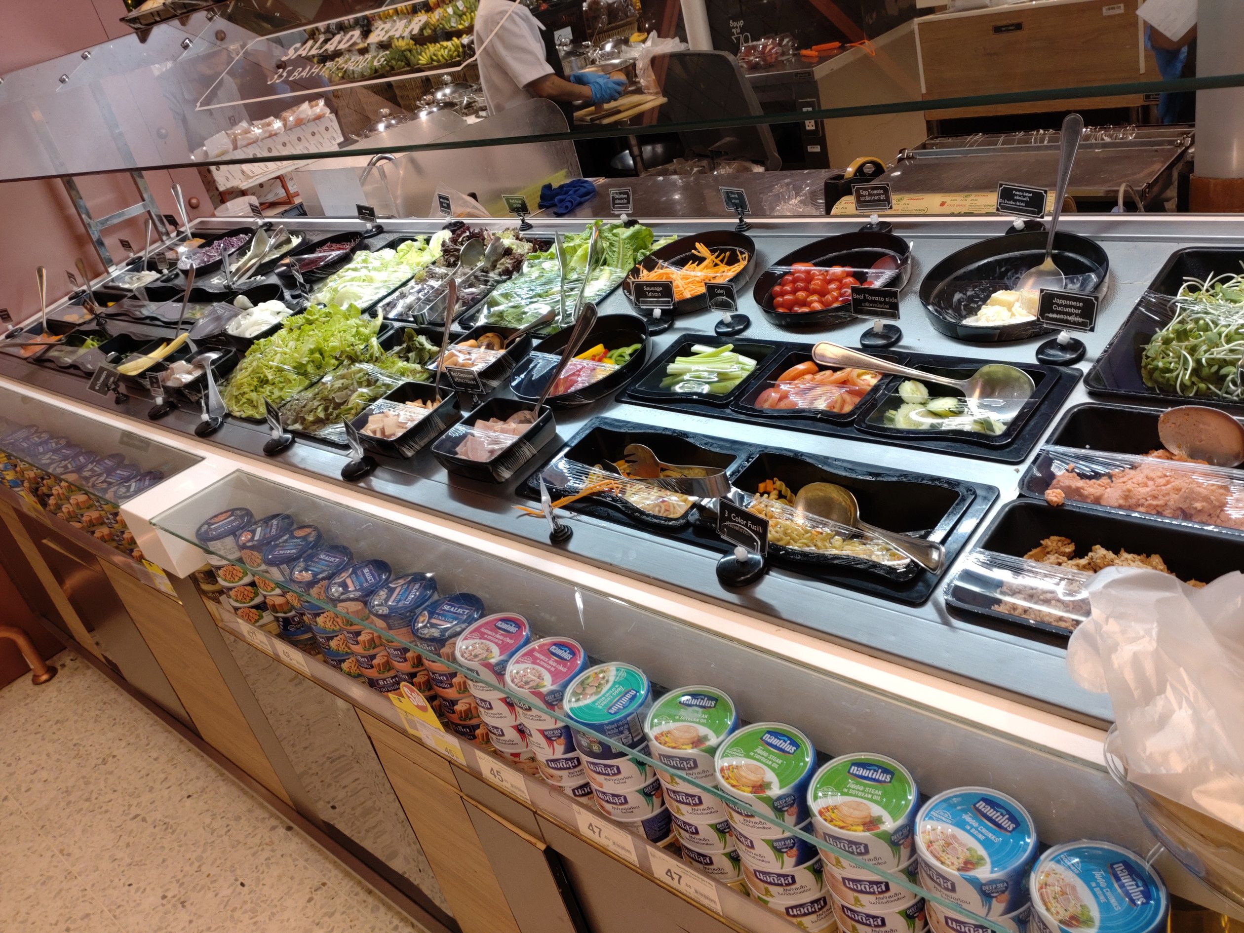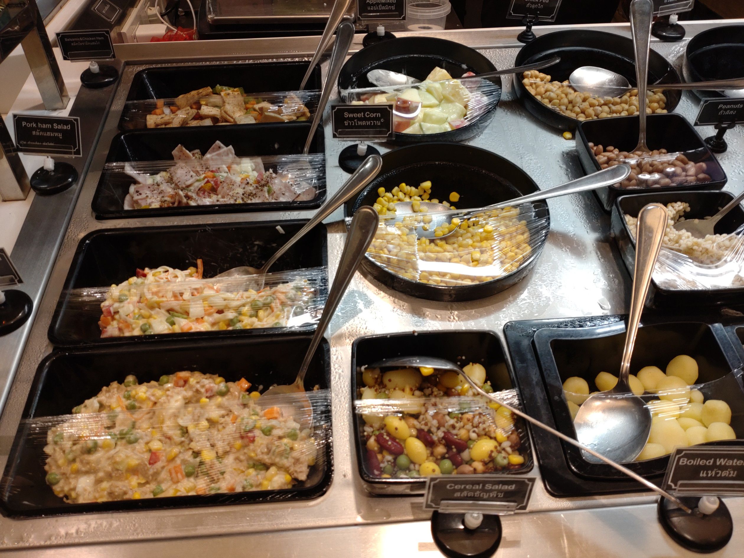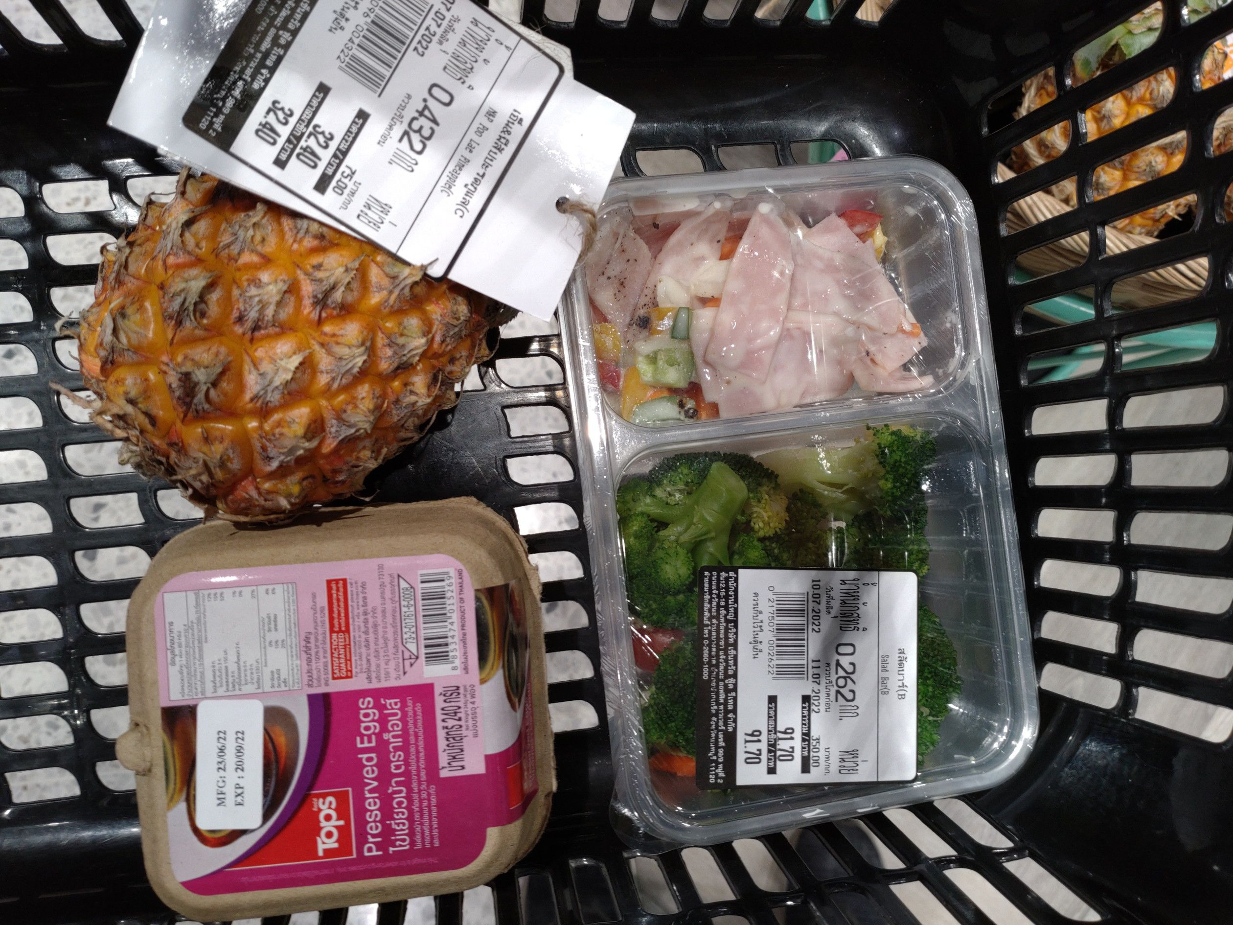 食料品の買い出しでセントラルワールドへ。 行く途中で見たエラワン祠の様子は、もう以前に戻ったような人出だった。 そして、まずはフードホールへ。 ここでは、惣菜は期待できないが、サラダが美味しい。 100gで35バーツ。 好きな物を器に入れて店員さんに計ってもらうスタイル。 2種類を選択。 小さなパイナップルの季節になったんですね。。。 これで、会計。 次は、噂で知った日本アベニューへ行こうと考えたんだけれど、場所が判らずウロウロ。 すると、こんな看板を発見。