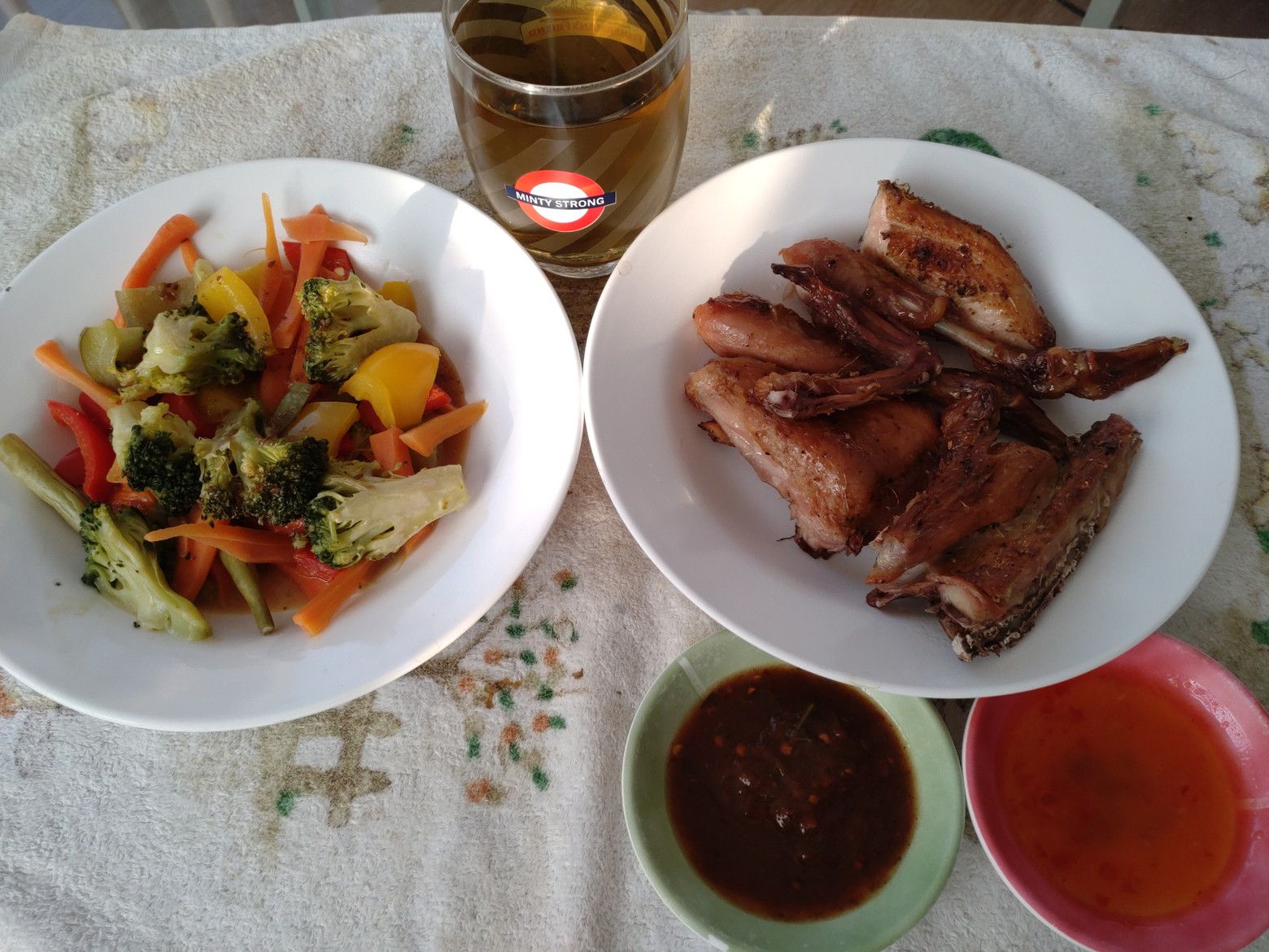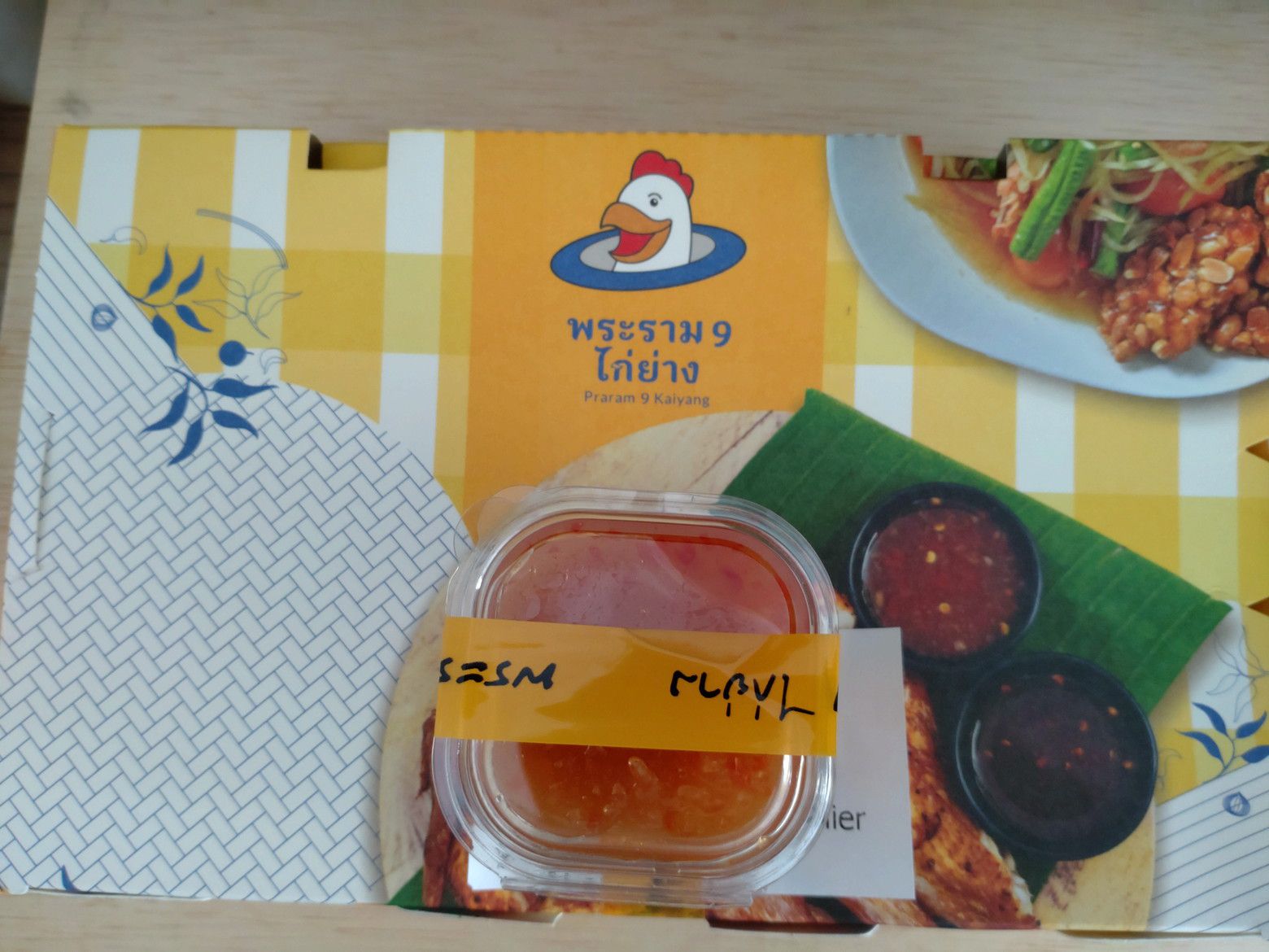 大好きな店なのですが、自分が知る限り、スクムビット通り界隈には無かったと思います。 本店は、ラマ9通り沿いに在るのですが、行き難い場所なんです。 今回は、グリルドチキンを注文しました。 暫く待って受け取りました。 後日に実食です。 タレは、2種類付いてきました。 見た目で判るかもしれませんが、鍛えられた筋肉質の鶏のように、肉がパンパンです。