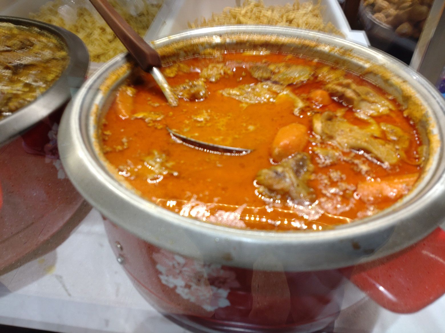 ちなみに、この時は、13時半です。 そんな時間でも、お金をカードにする列は、この通りの待ち行列。 そして、カードを握りしめて、ブラブラするも。。。 やはり、この店です! これは、マッサマンガイ。 これは、牛肉を煮込んだもので。。。 カオソーイヌアとなります。 これは、カオソーイガイです。 今回は、マッサマンカレーガイを注文しました。
