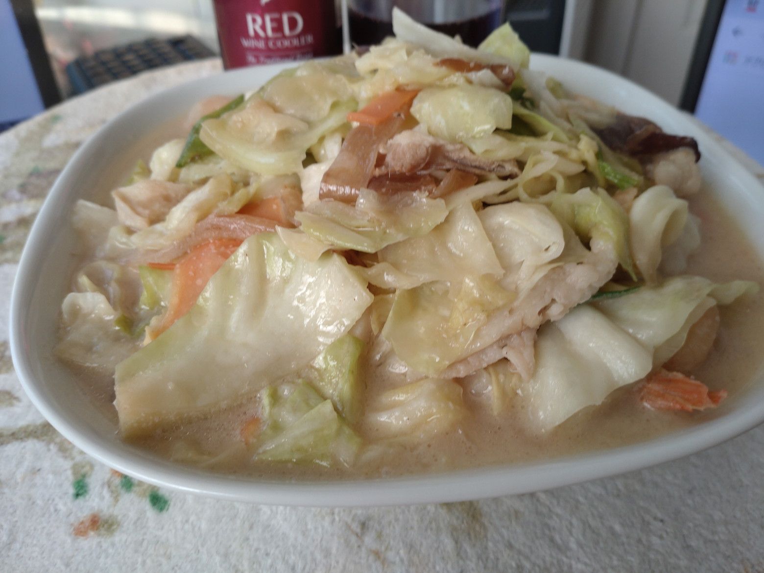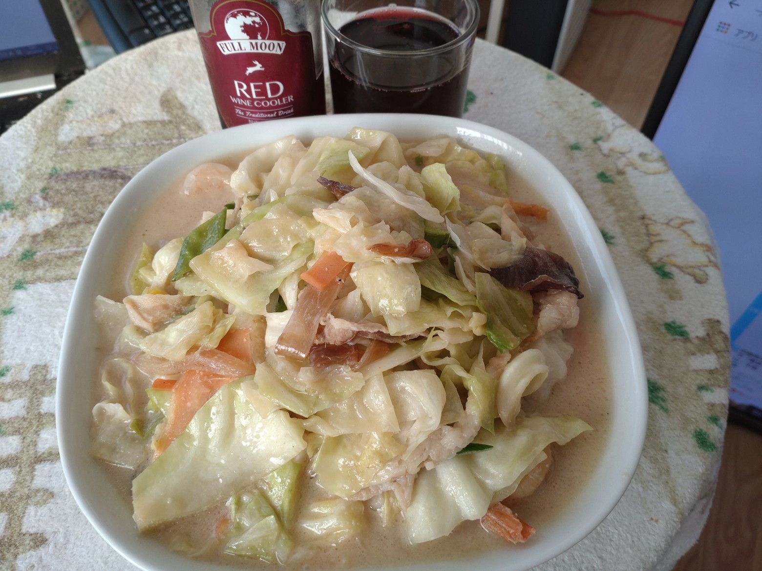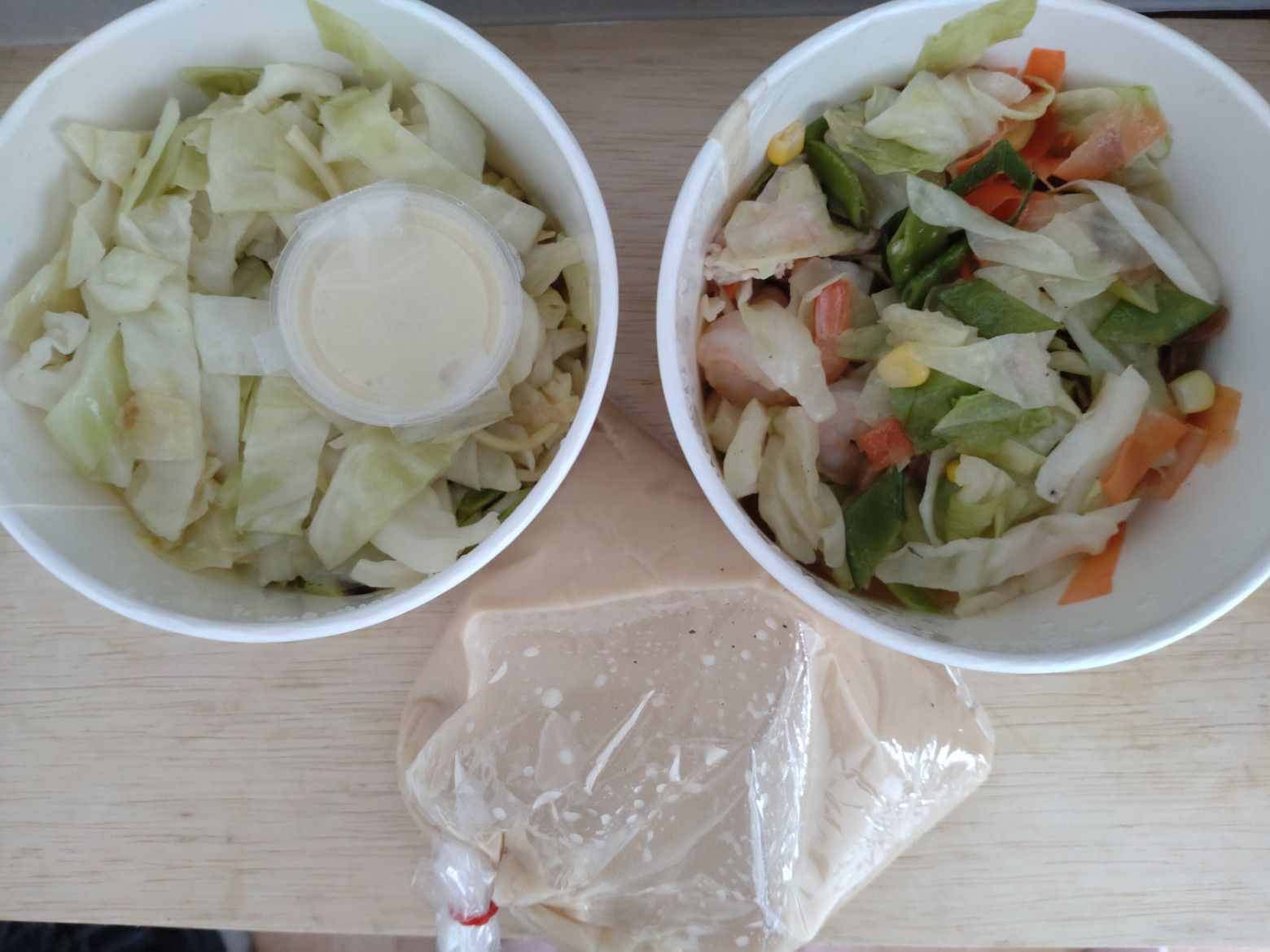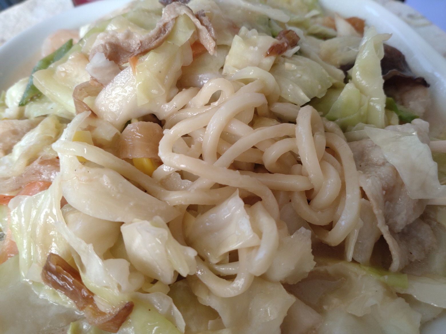 毎日、野菜を食べるようになってから、体の調子がいいのです。 待ち時間に、お茶を持って来てくれました。 受け取り完了。 帰宅後に、蓋を開けると、野菜の量が凄いんです。 熱々にする際に判ったのは、いつもの丼では入らないので、大き目の丼を取り出しました。 それでも、こんなに山盛り。 麺は、好みの太麺。