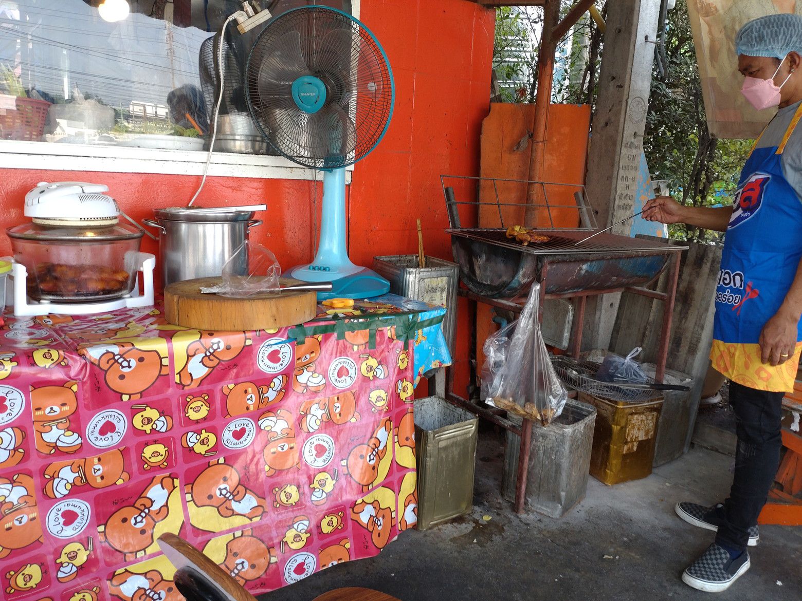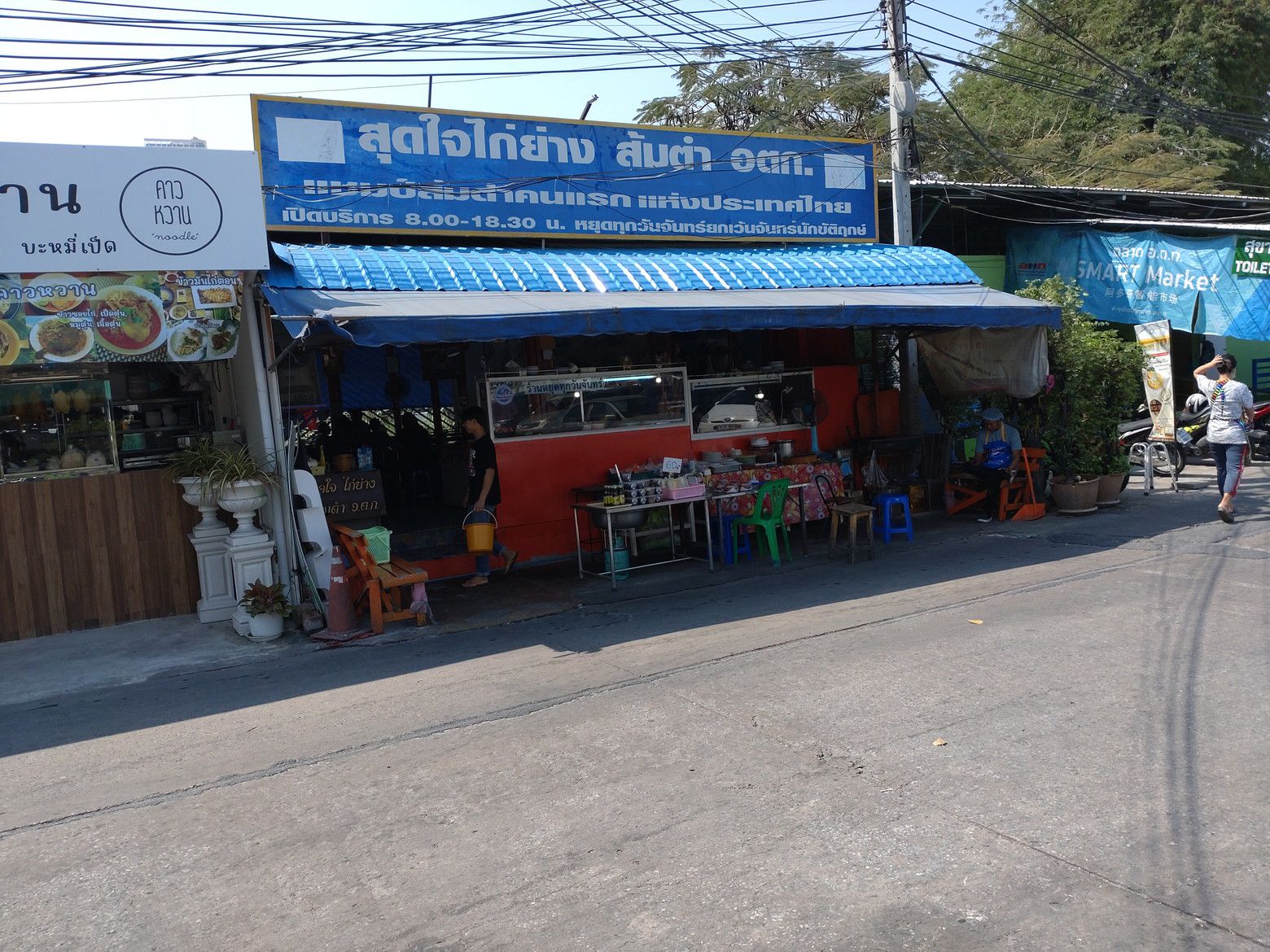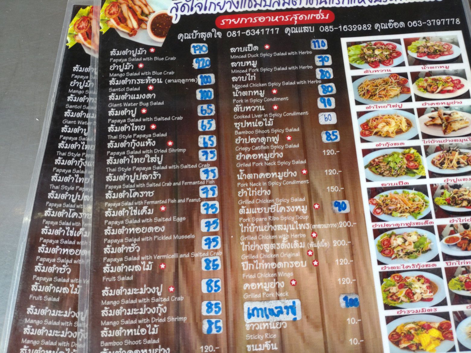 オートーコー市場を出てからは。。。 直ぐ近くのガイヤーンの店へ。 入り口近くの椅子に座って、メニューを頂きました。 値段が書き換えられていますので、値上がったのかも。