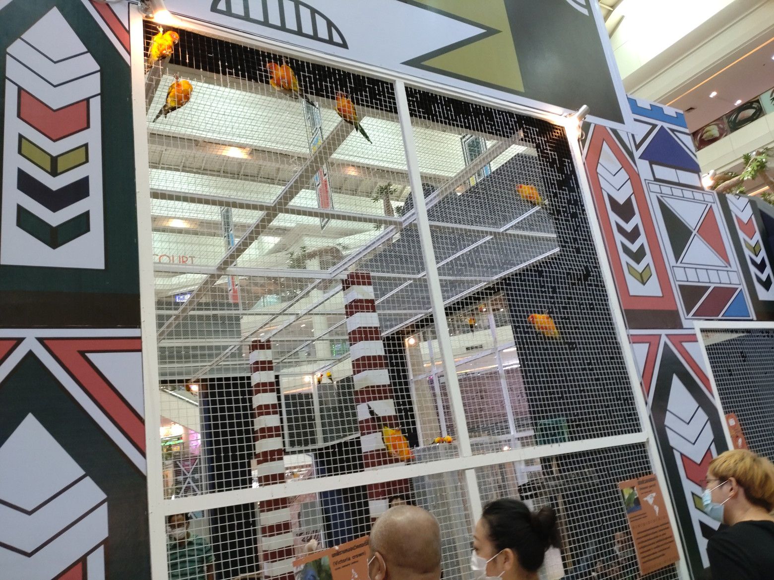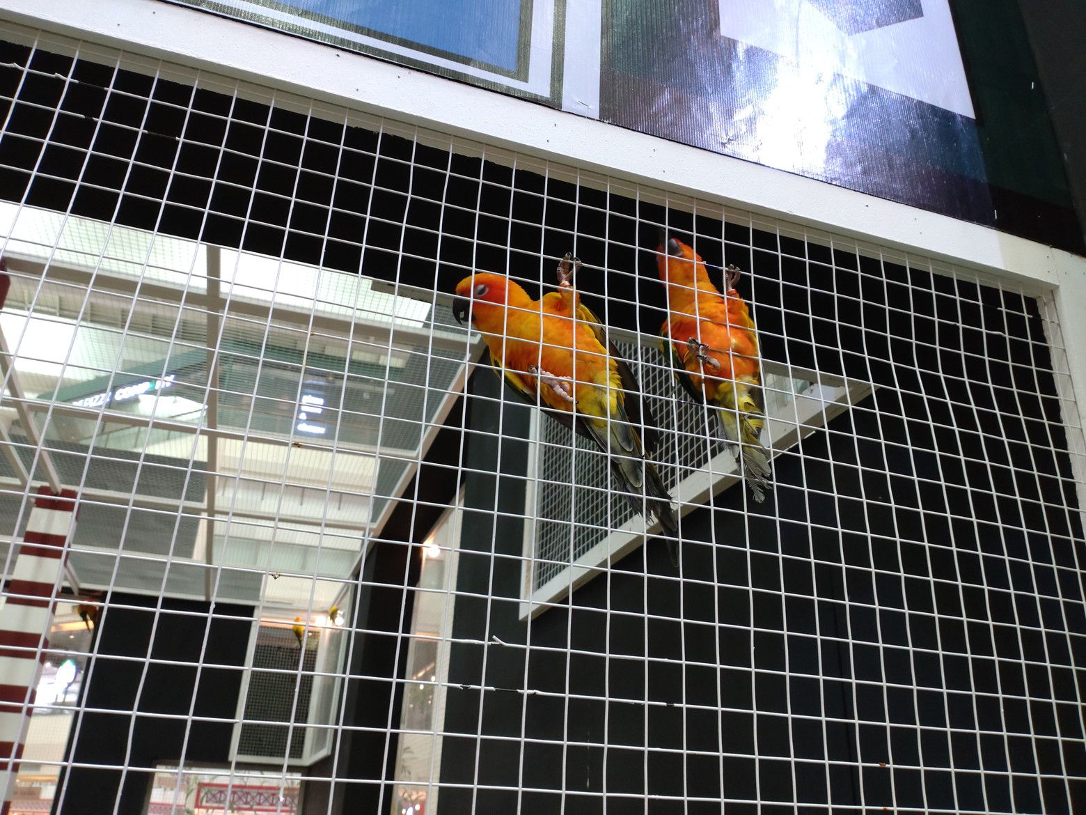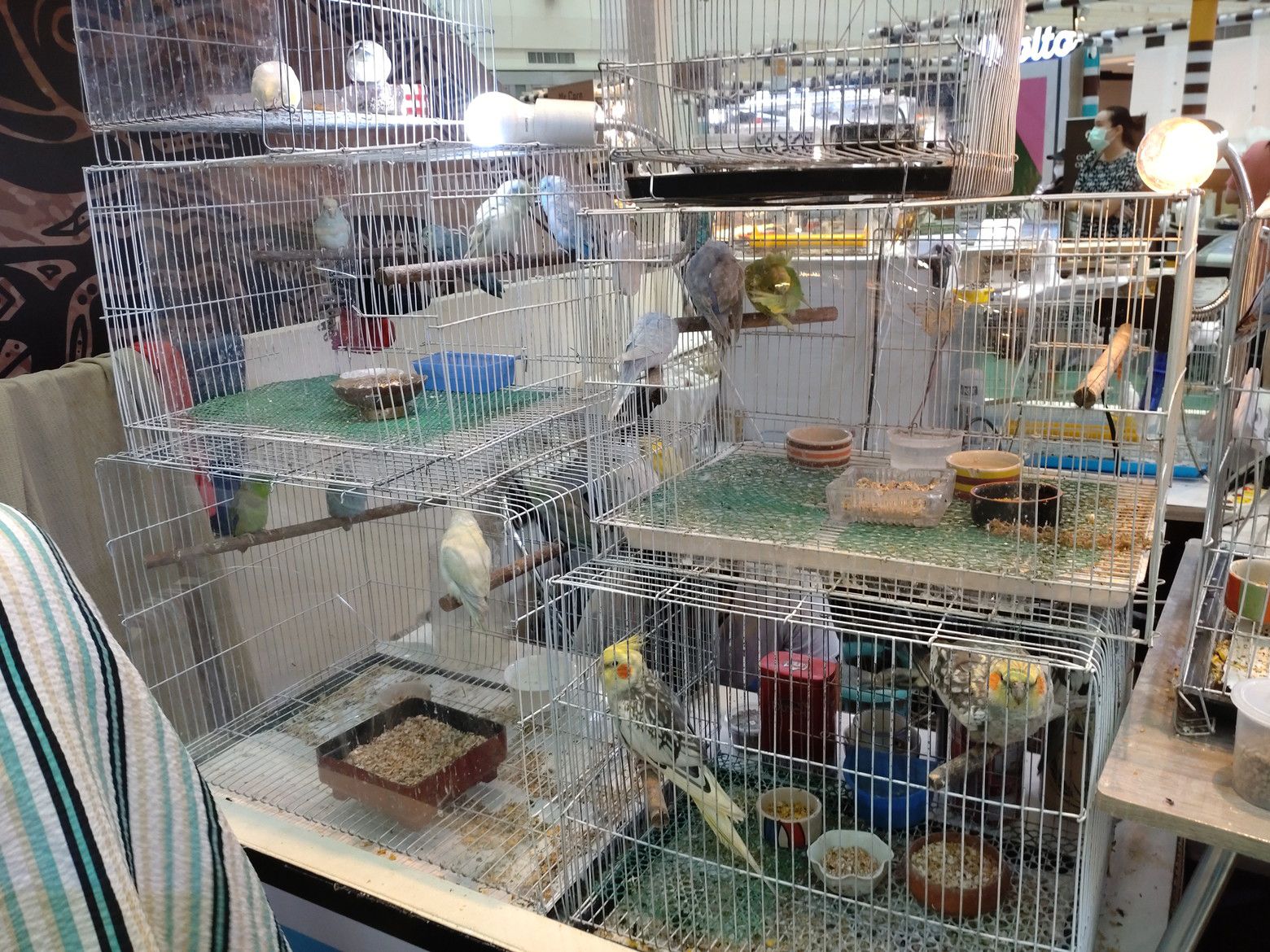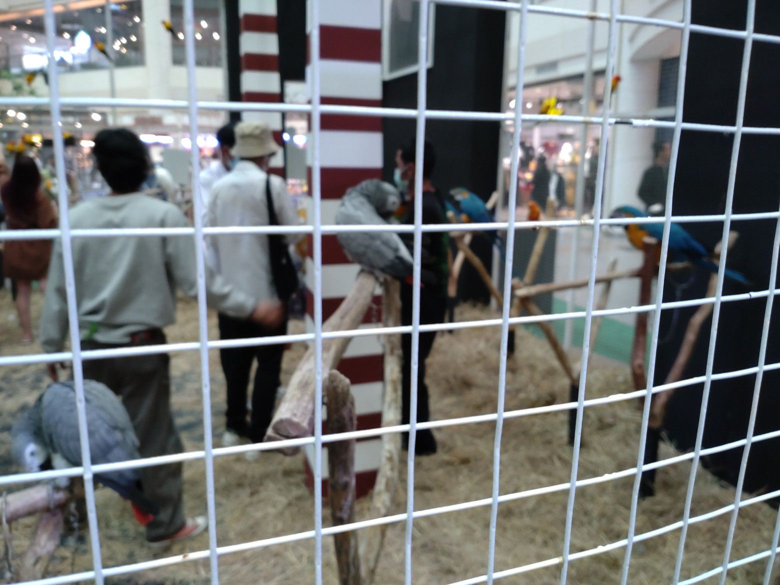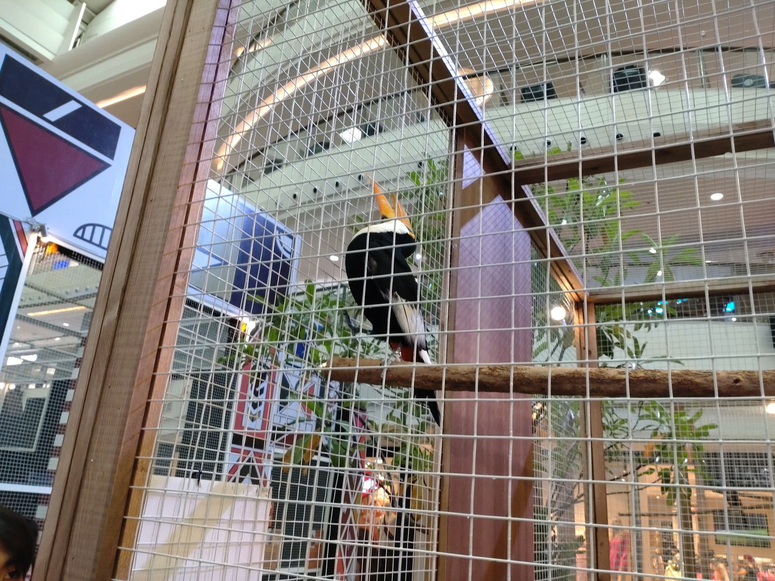 上からの眺めでは、イマイチ何をしているのかが不明でした。 降りてみると、鳥の鳴き声が聞こえてきました。 どうやら、鳥の動物園のような催しでした。 こんな機会は滅多にありませんので、ブラブラする事にしました。 遠い昔ではありますが、小学校の頃にインコを飼った事がありますので、懐かしいです。 ジーッとしている鳥も居れば、動き回る鳥も居て楽しいです。 ここは、騒々しいコーナーでした。 主催者のコーナーでしょうか?フクロウが放し飼い?